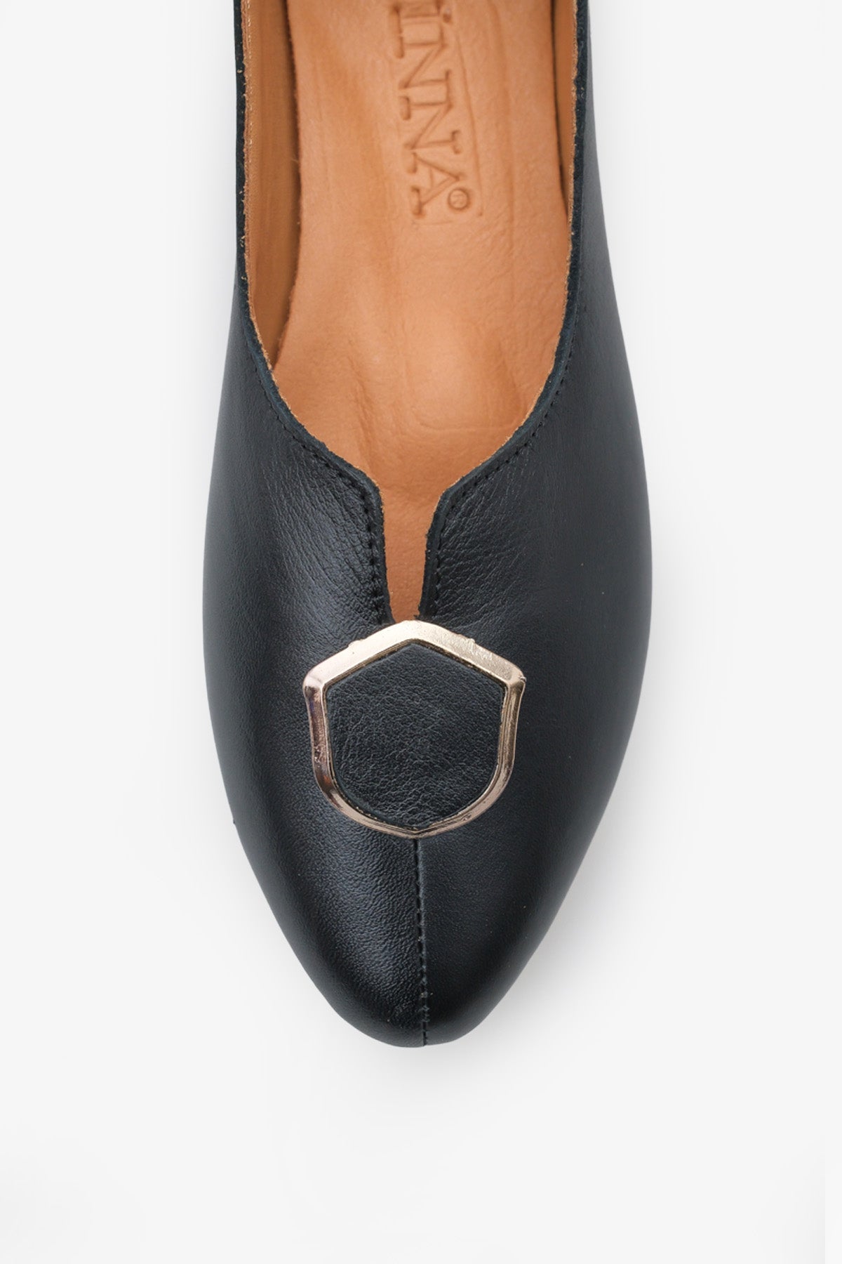 Hakiki deri siyah dış yüzeyi ve ön kısmındaki gold çerçeveli geometrik aksesuar, Divina modele sofistike ve modern bir hava katar.