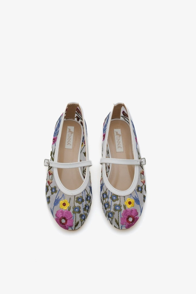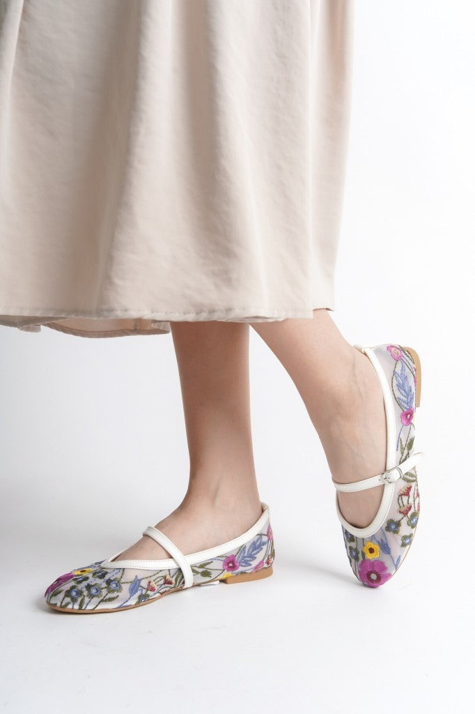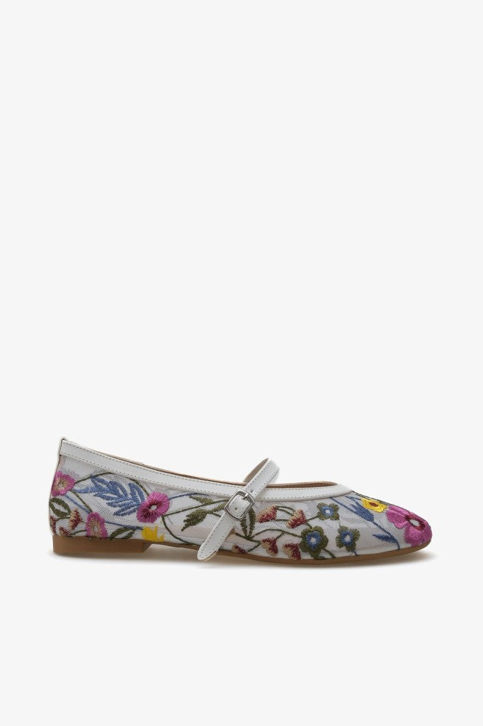 Şeffaf file dokusu üzerine işlenmiş rengarenk çiçek nakışları, ayakkabıya baharın enerjisini taşıyan bohem ve zarif bir hava katar.