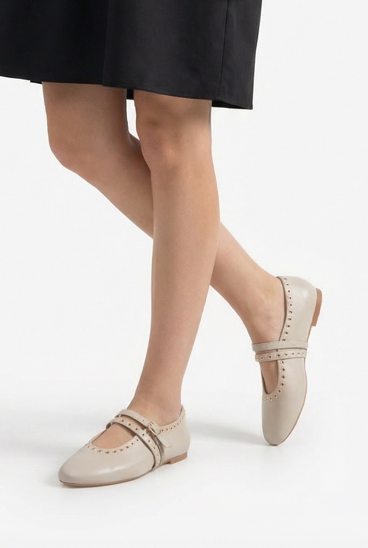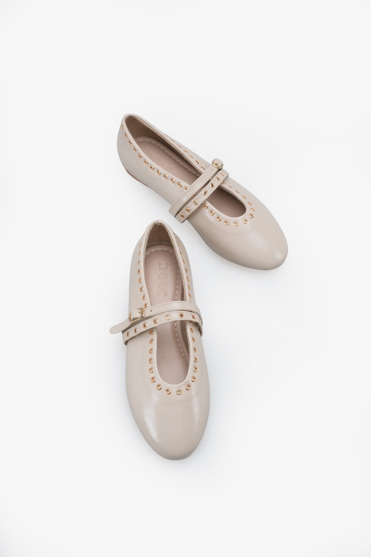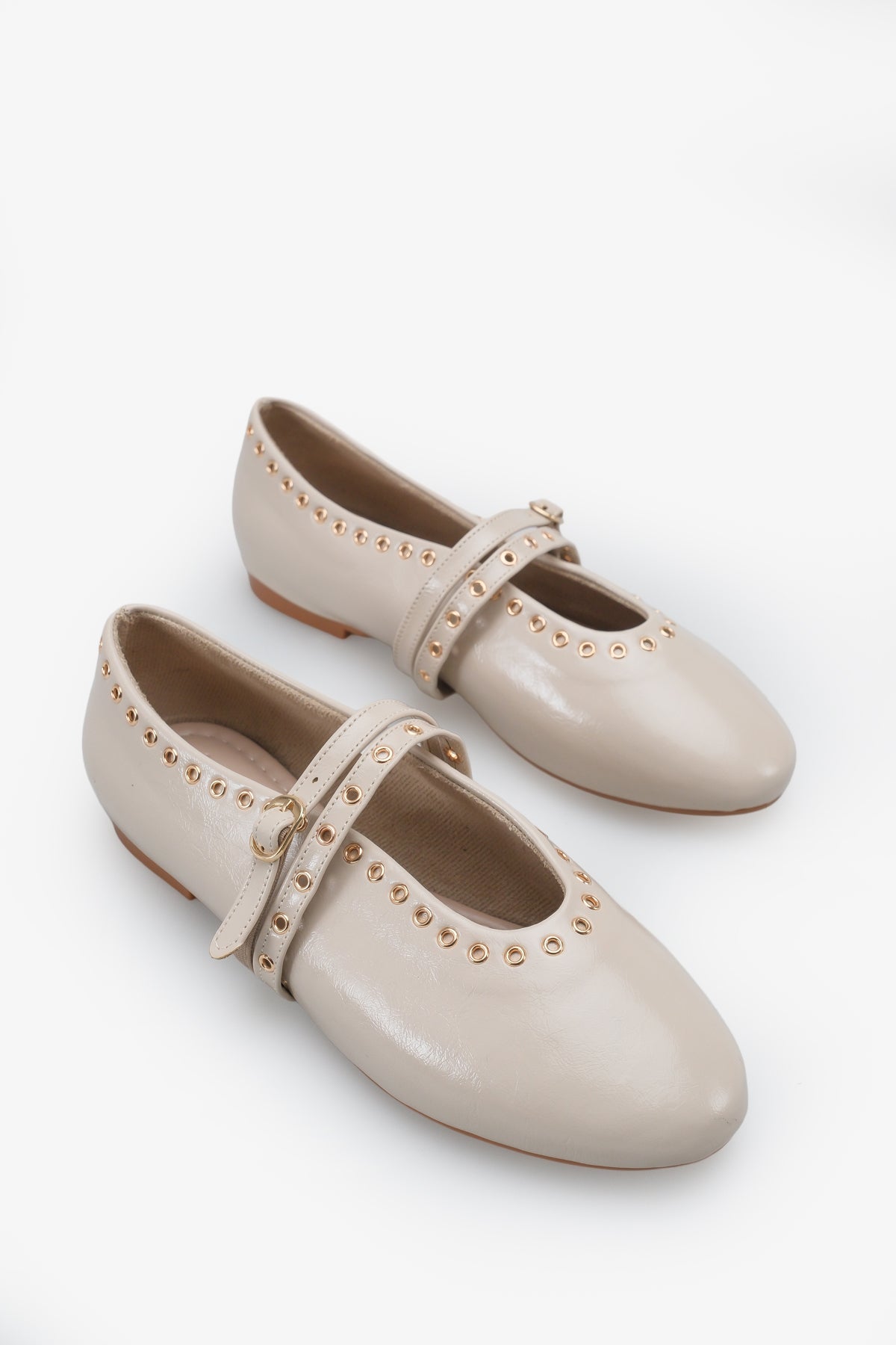 Babetin çevresini ve bantlarını süsleyen altın renkli metal kuşgözü zımba detayları, klasik Mary Jane modeline modern ve asi bir "rock-chic" havası kazandırır.
