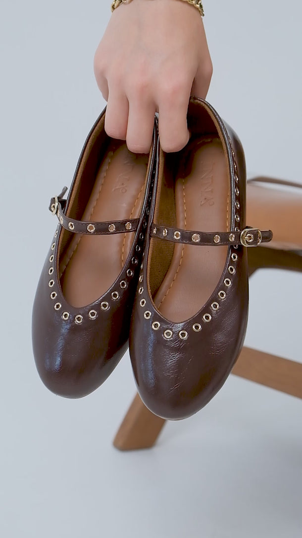 Babetin çevresini ve bantlarını süsleyen altın renkli metal kuşgözü zımba detayları, klasik Mary Jane modeline modern ve asi bir "rock-chic" havası kazandırır.