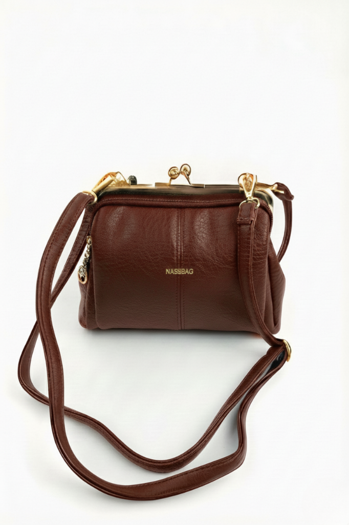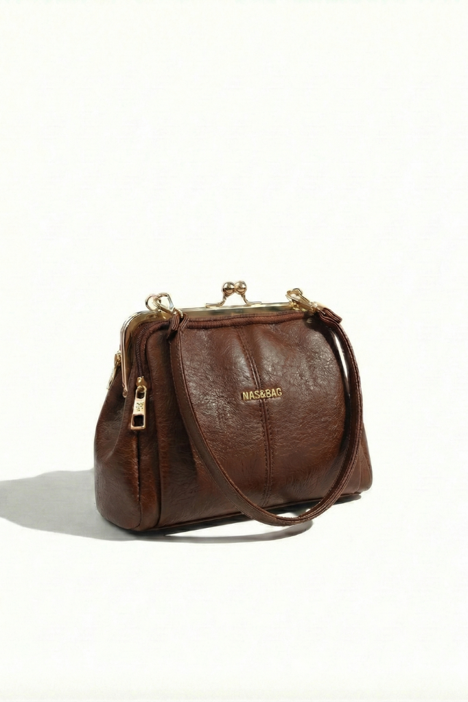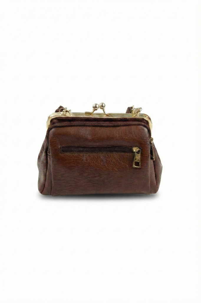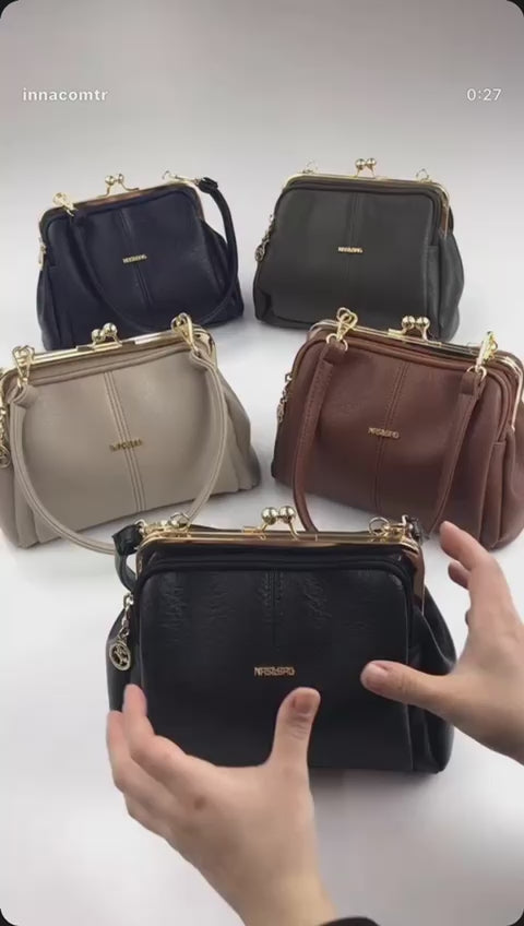 Altın renkli metal aksesuarları ve nostaljik klipsli kapama detayı, tasarıma şık ve klasik bir hava katar.