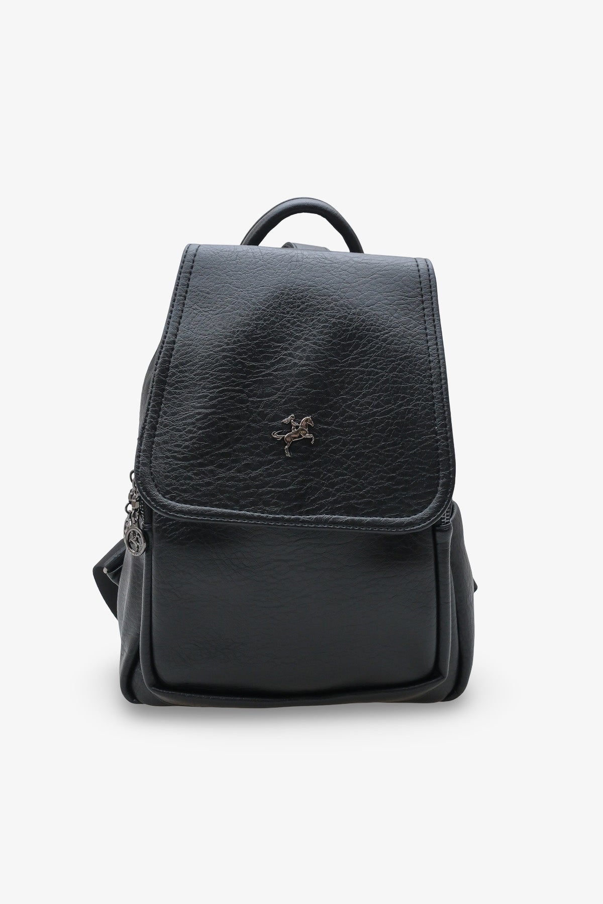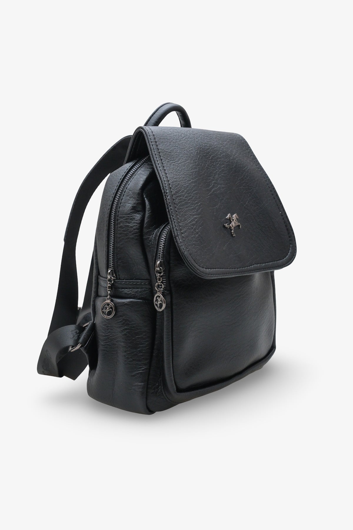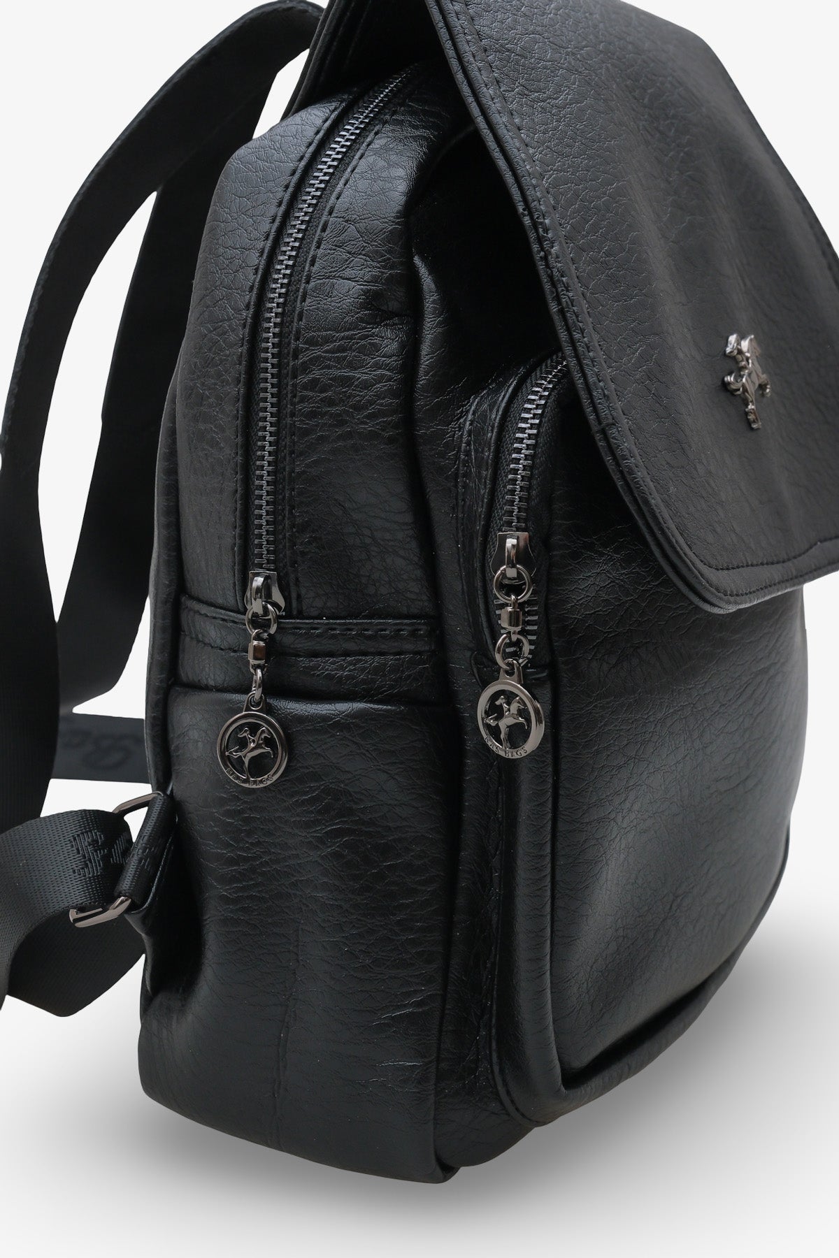 Gümüş renkli metal logo ve özel tasarım fermuar uçları, bu siyah sırt çantası modeline zarif ve zengin bir görünüm kazandırır.