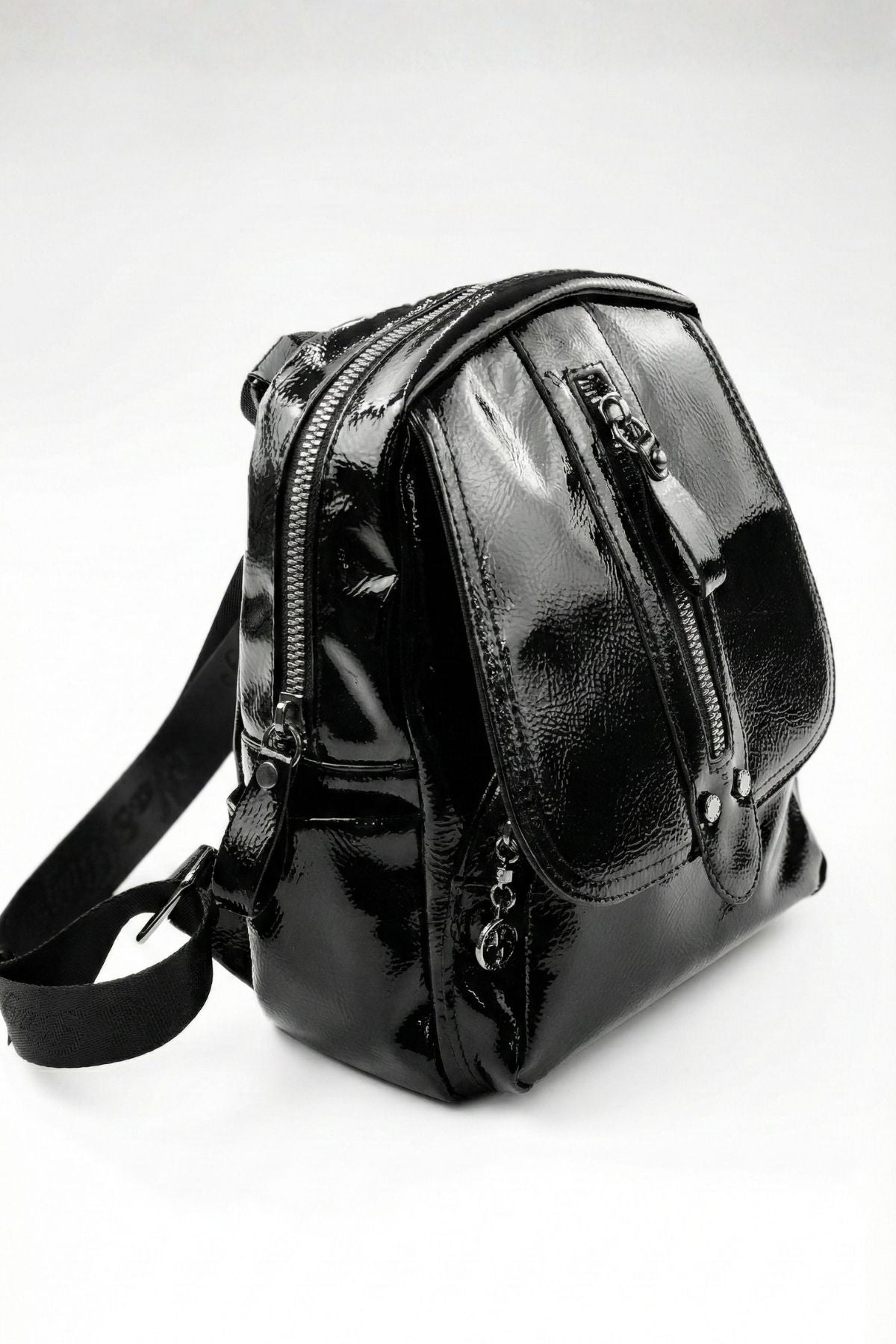 Ön yüzündeki dikey fermuar detayı ve gümüş renkli metal aksesuarlar, klasik siyah çantaya dinamik ve şık bir hava kazandırır.