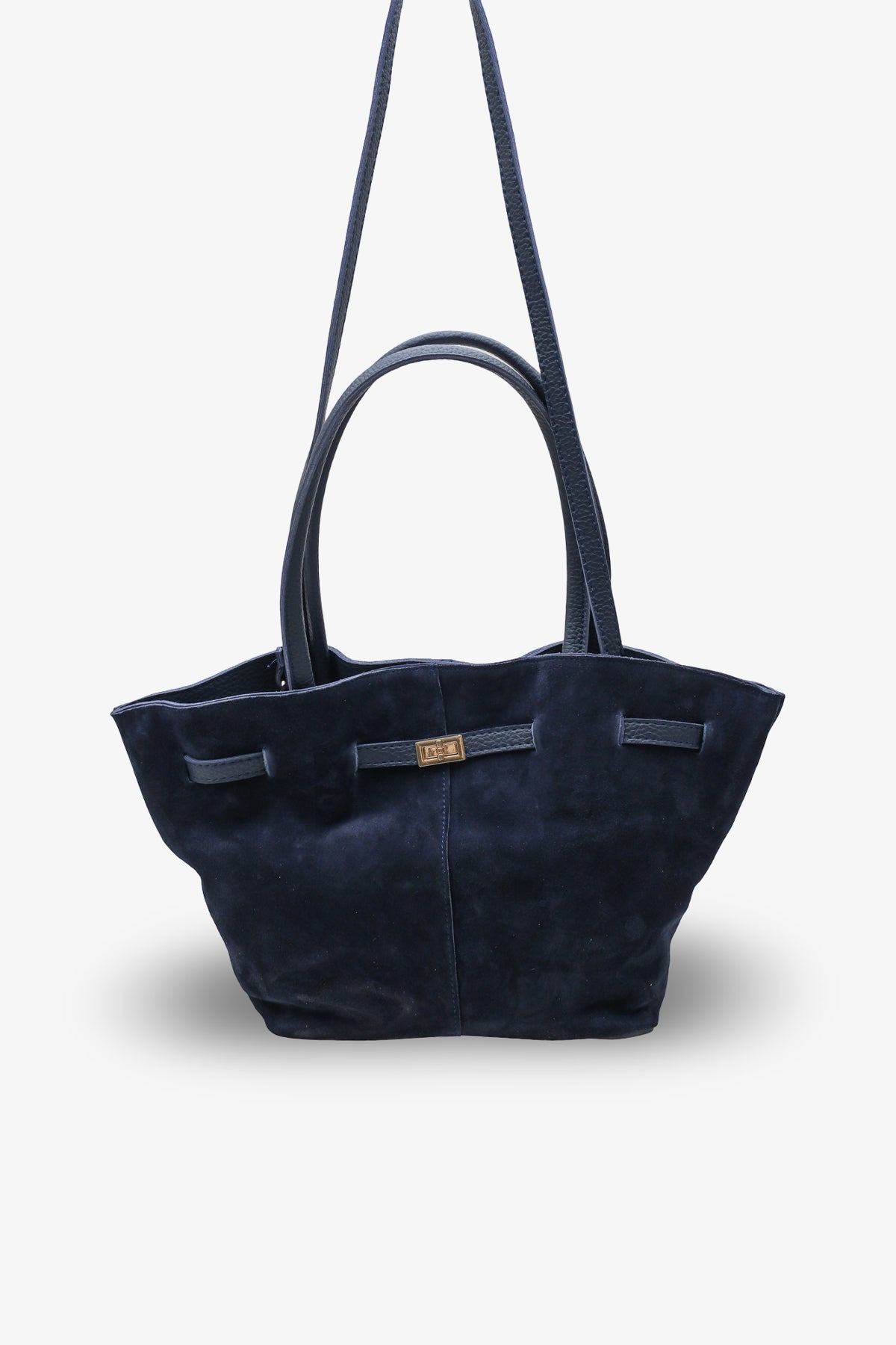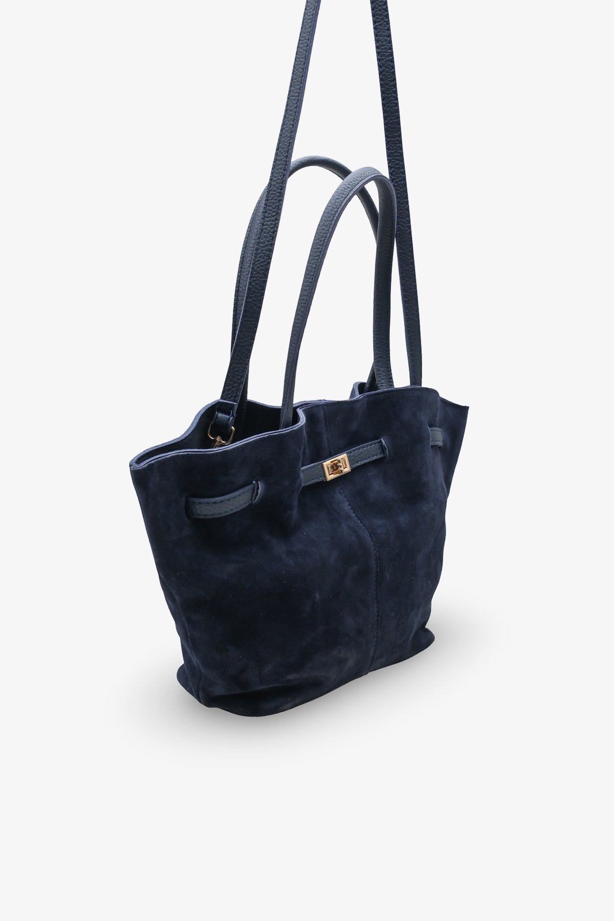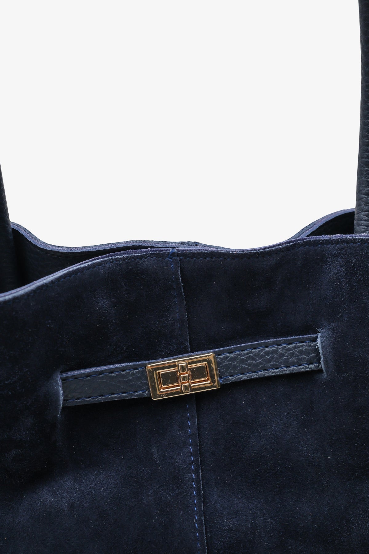 • Lacivert süet ve altın rengi detayların mükemmel uyumu, stil sahibi kombinlerinizi tamamlamak için ideal bir seçenektir.