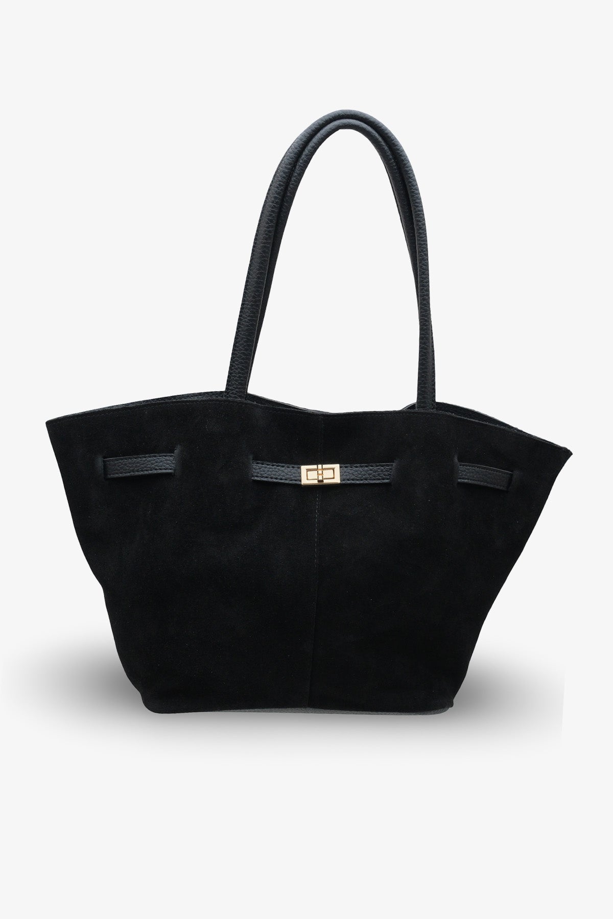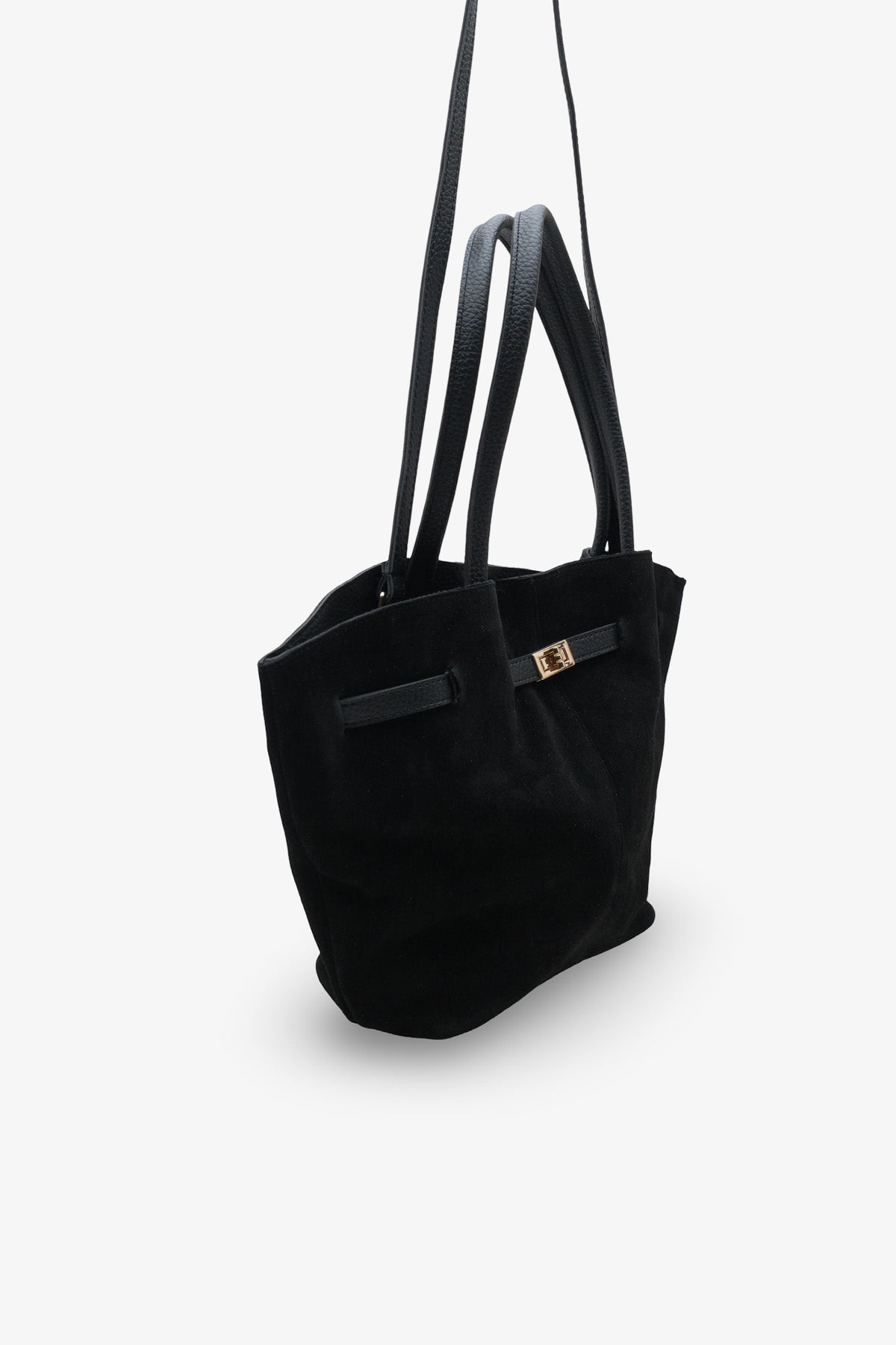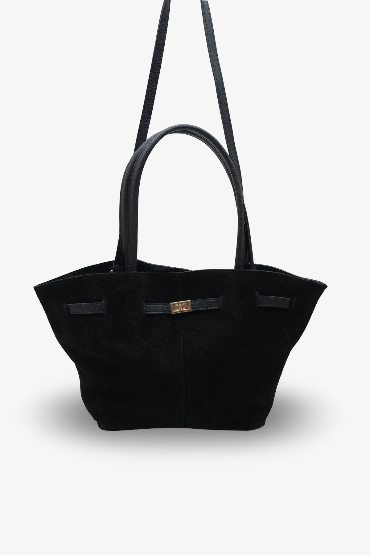 • Siyah süet ve altın rengi detayların mükemmel uyumu, stil sahibi kombinlerinizi tamamlamak için ideal bir seçenektir.