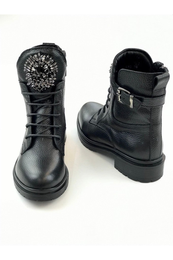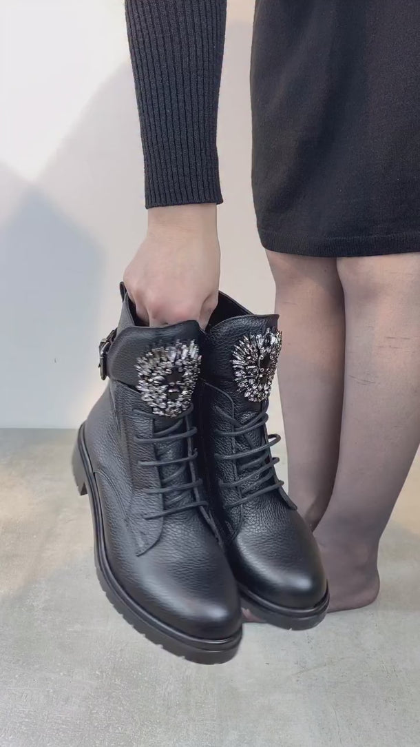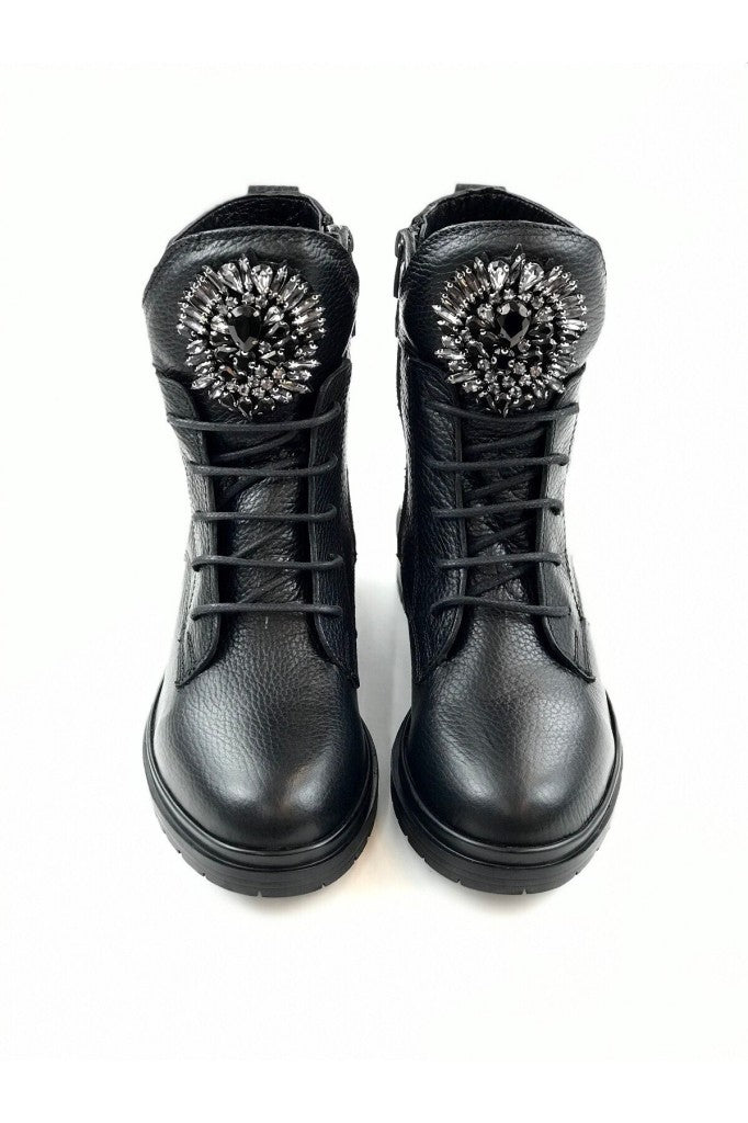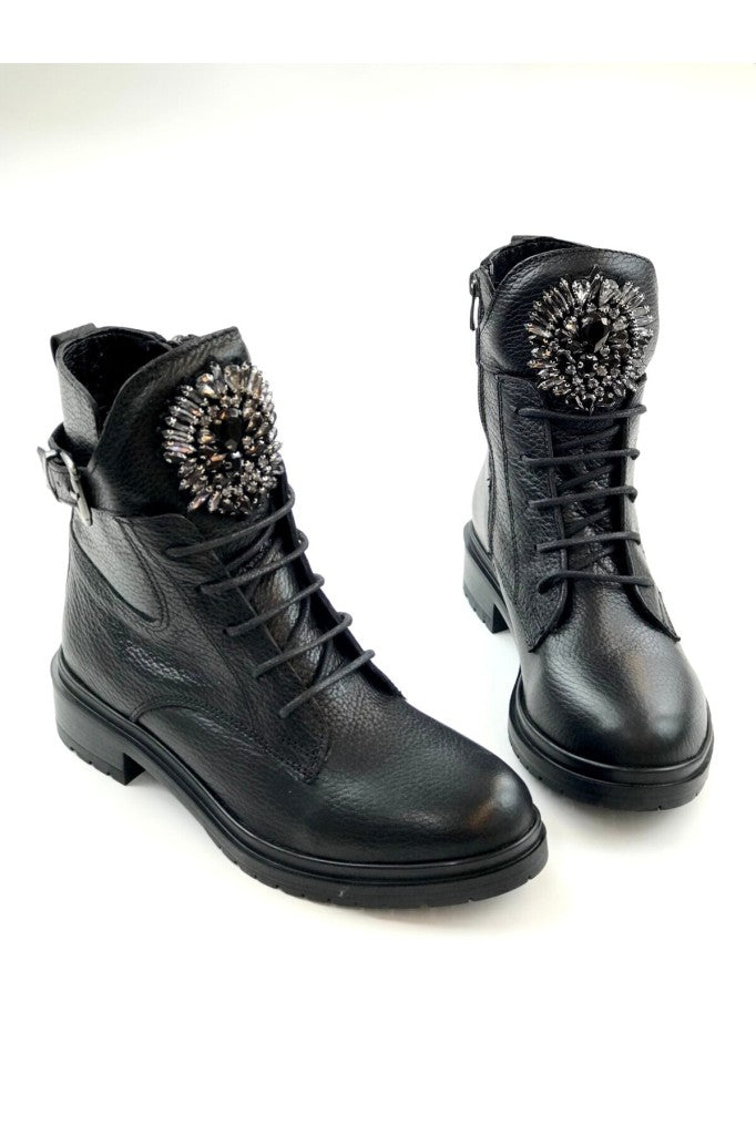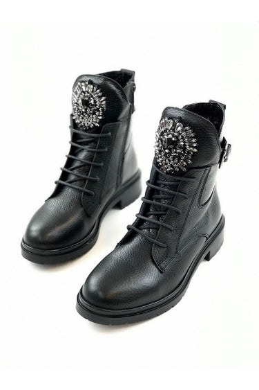 Botun dil kısmına yerleştirilmiş büyük kristal taşlı aksesuar, sert postal görünümünü feminen ve göz alıcı bir ışıltıyla yumuşatır.