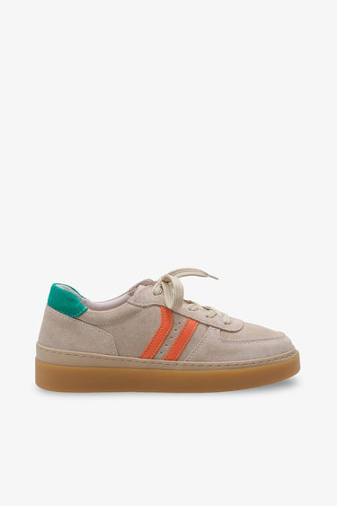 Yumuşak süet dokulu hakiki deri materyalden üretilen Luxe Sneaker, bej zemin üzerine eklenen turuncu şeritleriyle stilinize dinamik bir renk katar.
