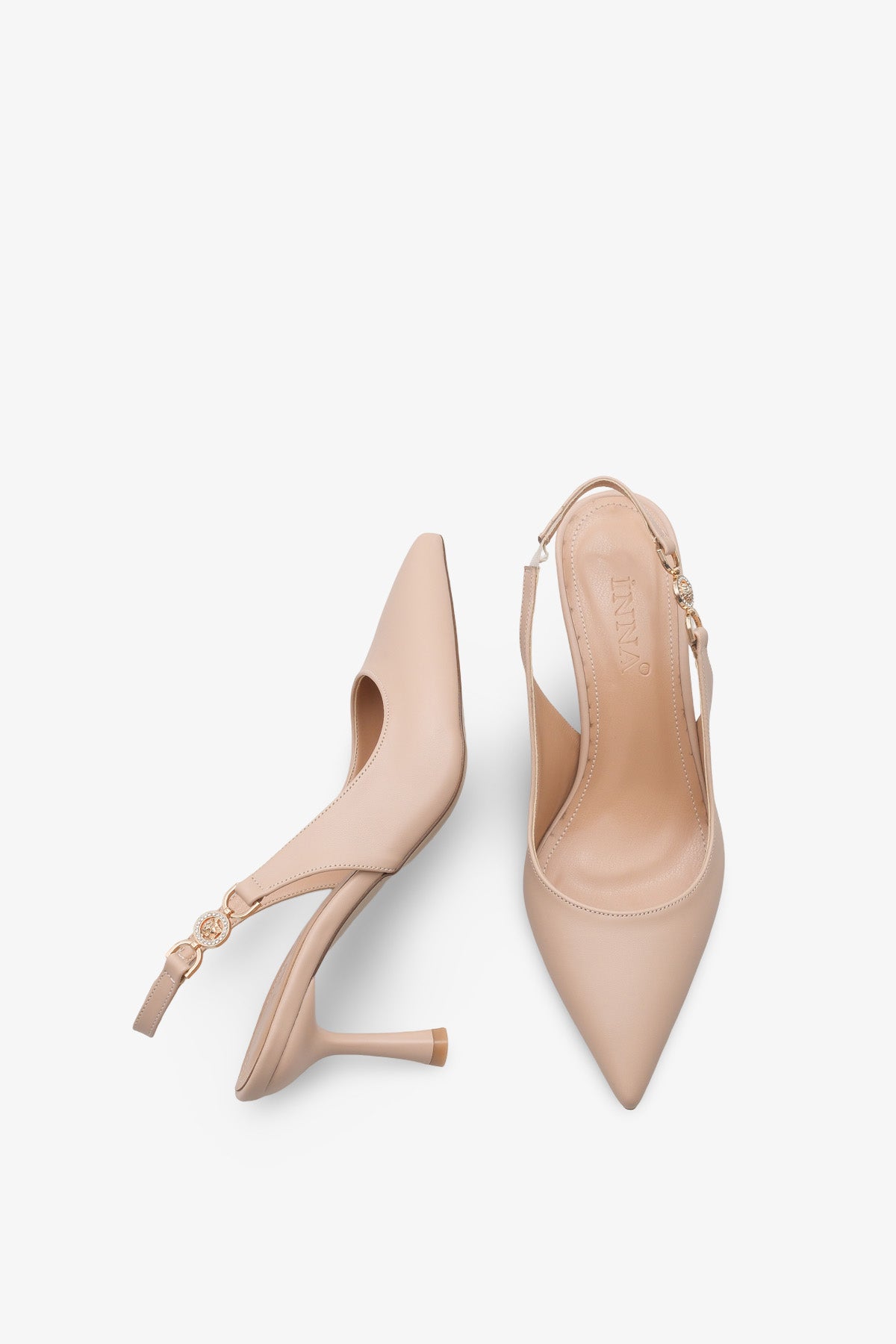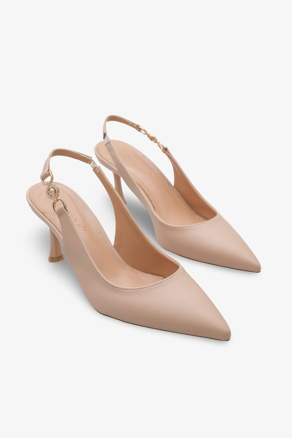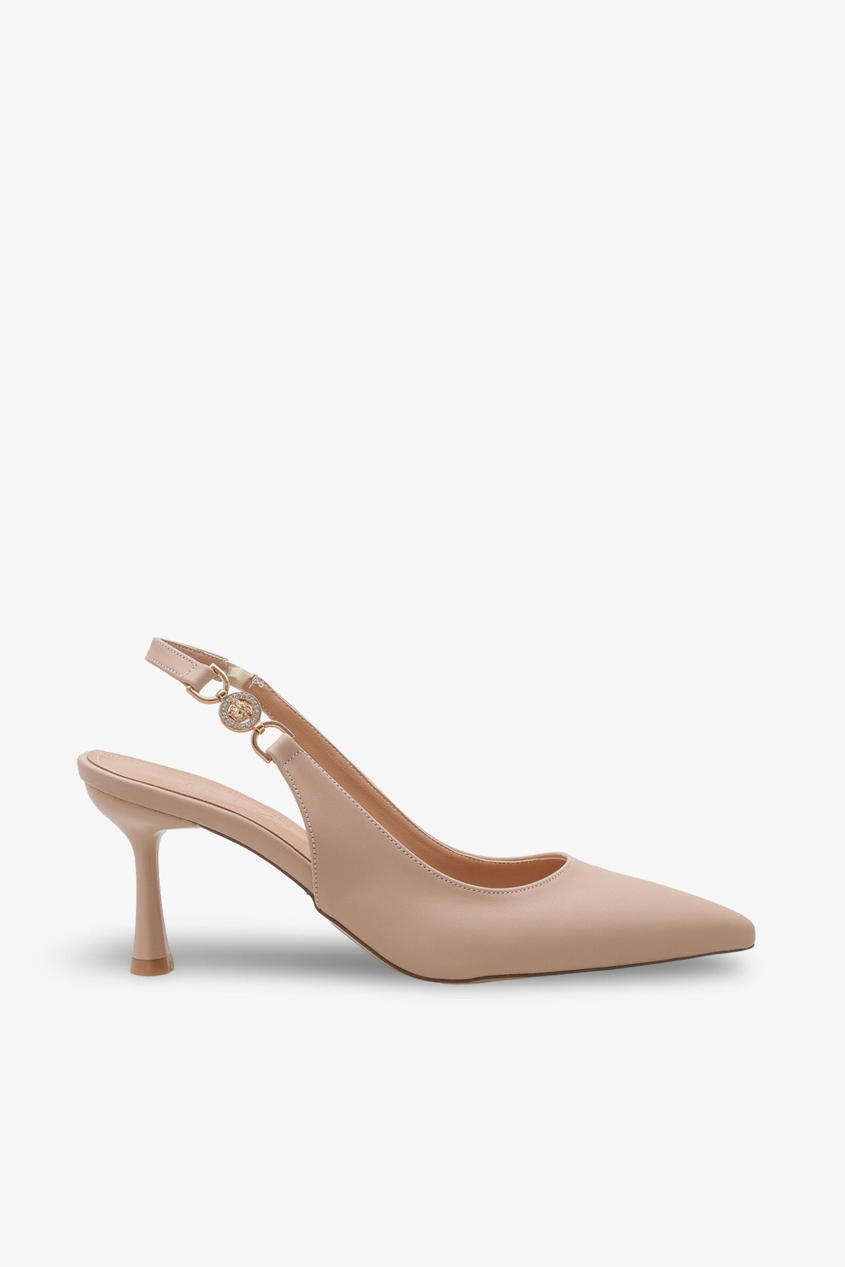Nude tonlarının asaletini yansıtan pürüzsüz dokusu, kare burun tasarımıyla birleşerek ayakkabıya modern ve sofistike bir duruş kazandırır.