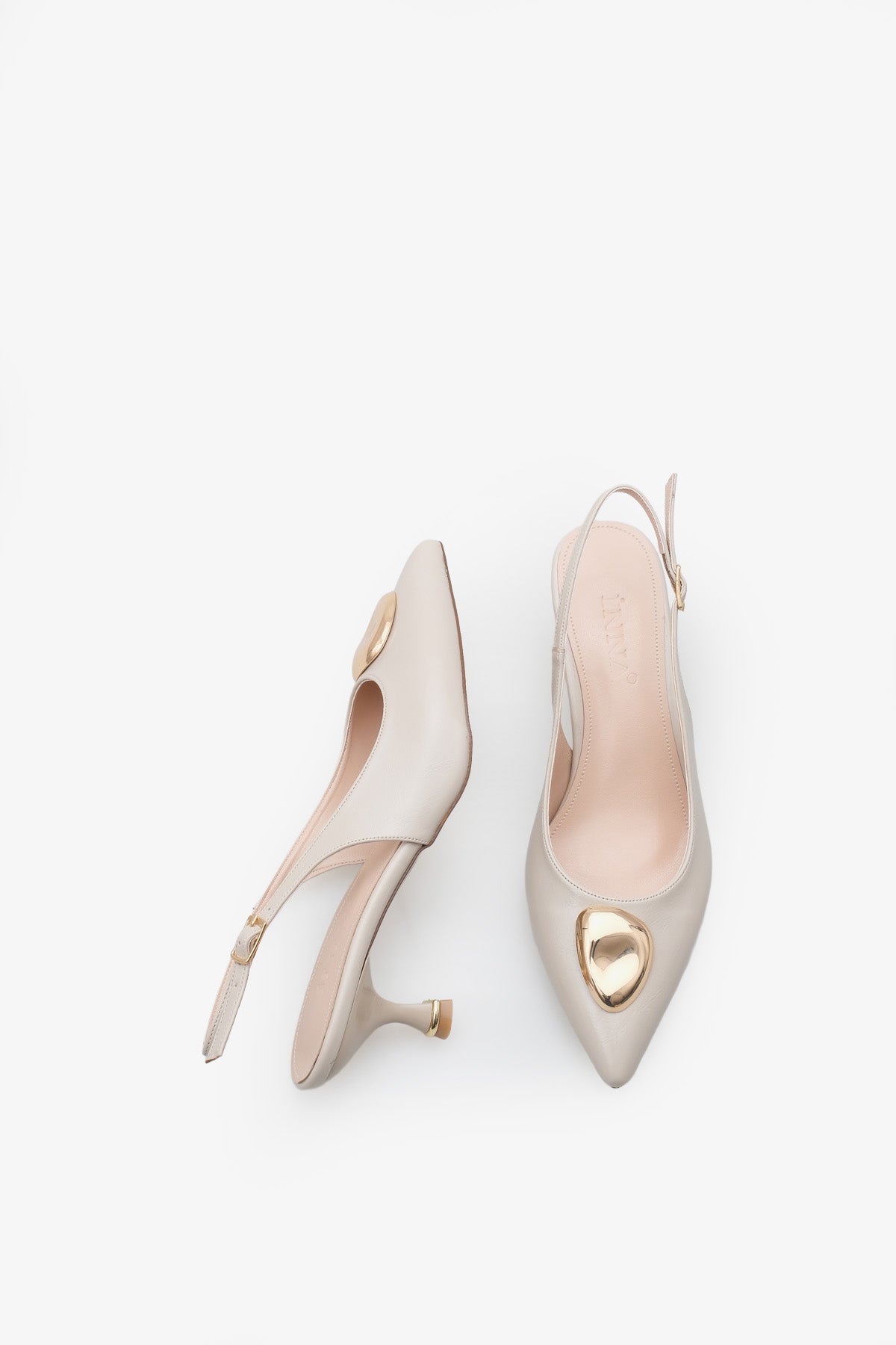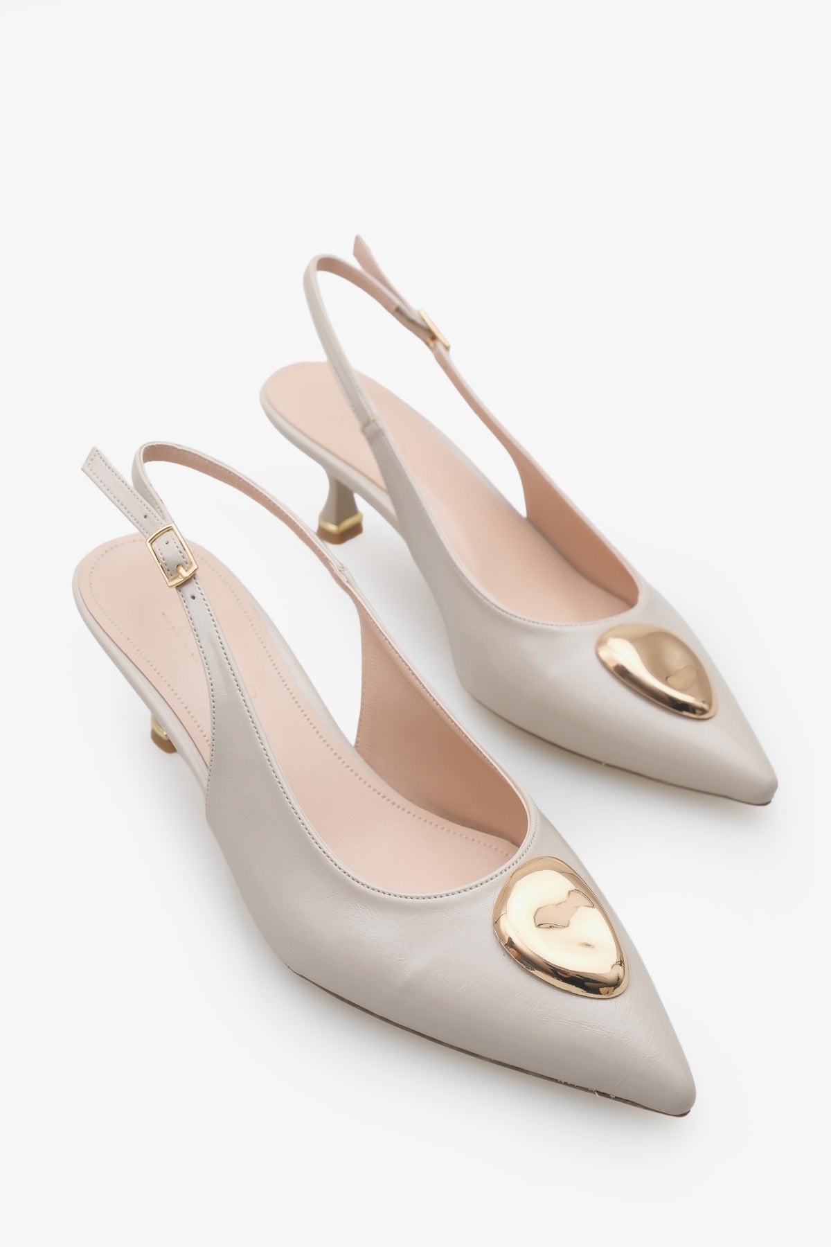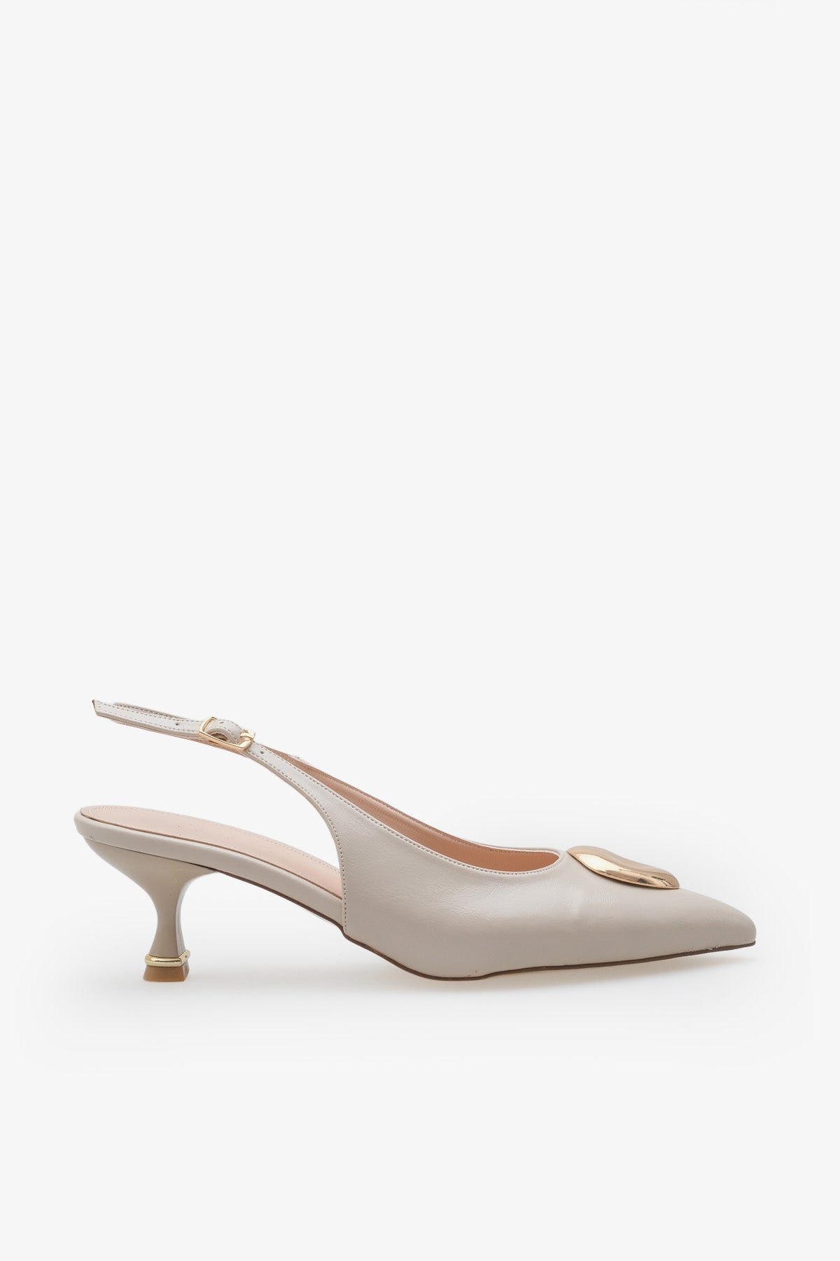 Kaliteli suni deri materyalden üretilen Tessa bej rengi topuklu ayakkabı, burun kısmındaki büyük gold metal aksesuarıyla göz alıcı bir şıklık sunar.