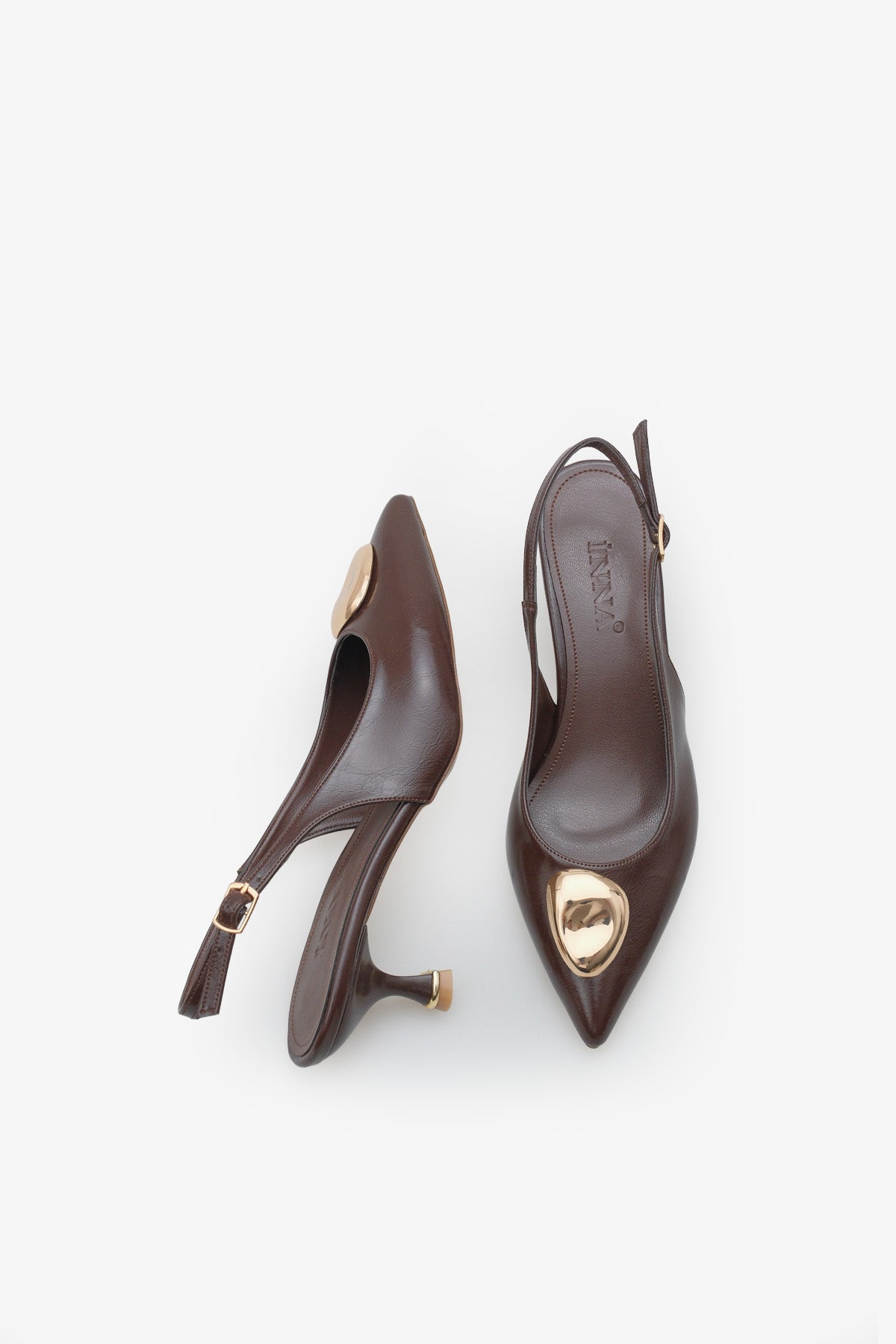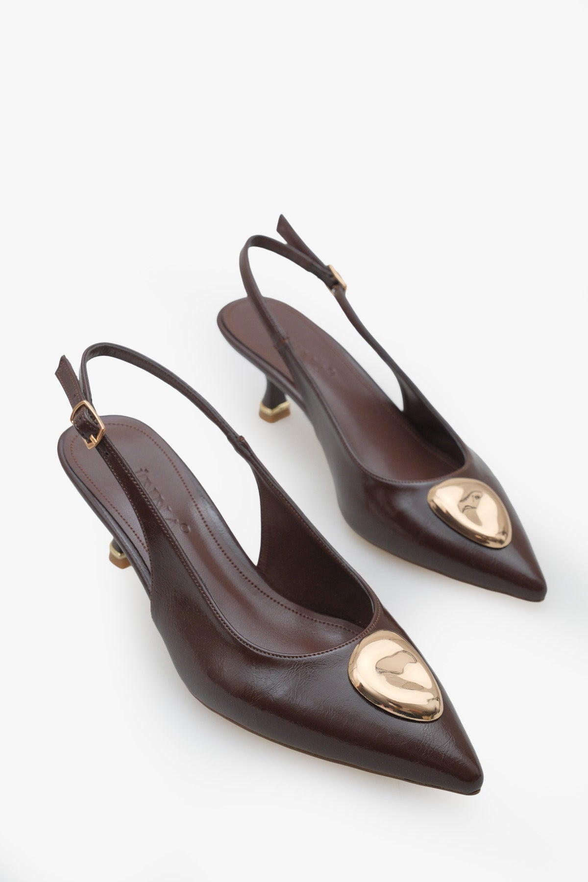 Kaliteli suni deri materyalden üretilen Tessa kahverengi topuklu ayakkabı, burun kısmındaki büyük gold metal aksesuarıyla göz alıcı bir şıklık sunar.