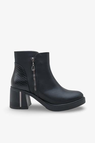 Yan kısmındaki metalik fermuar detayı ve arkasındaki şık dokuyla hareketlendirilen Jowita siyah topuklu bot, günlük stilinize modern bir hava katar.