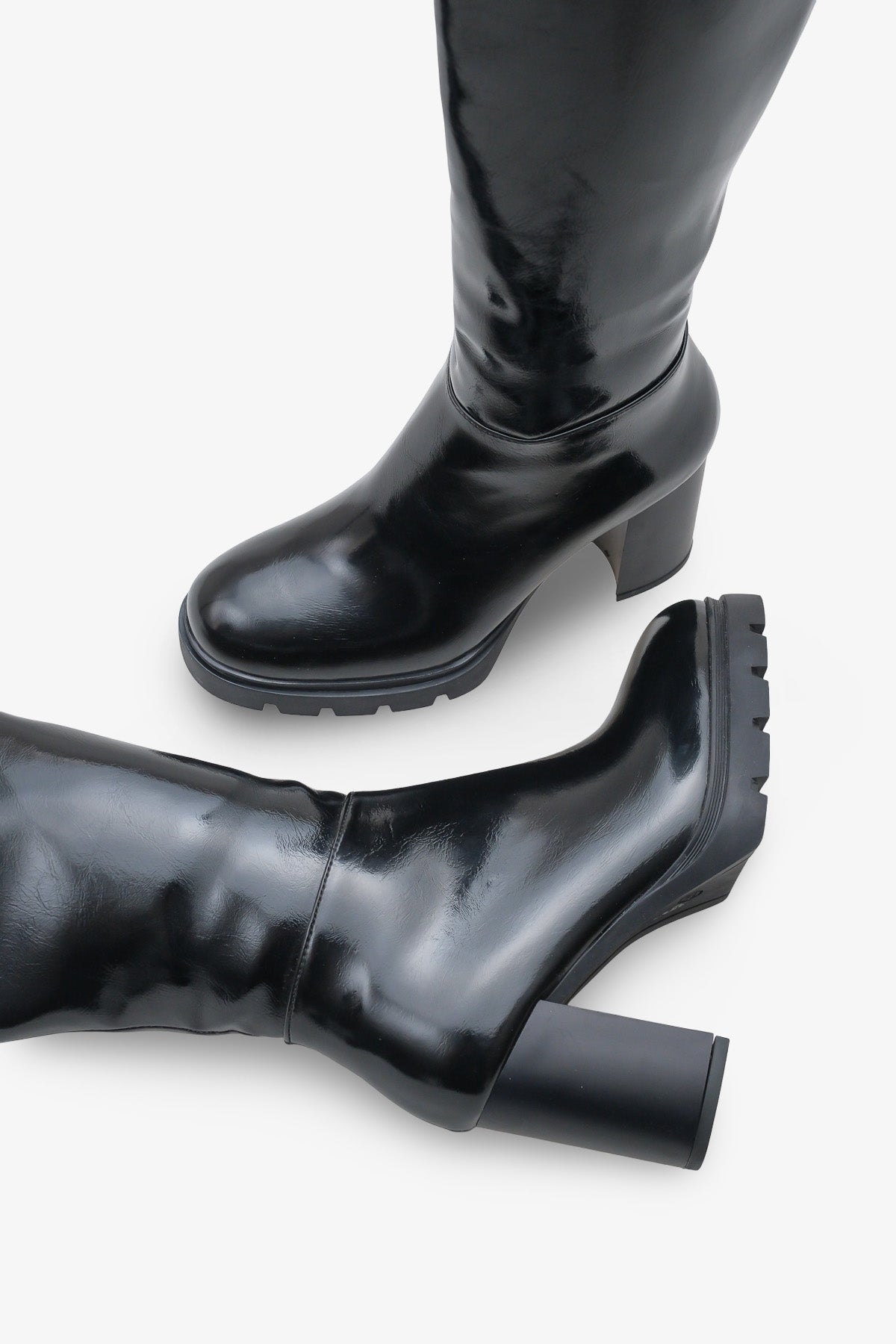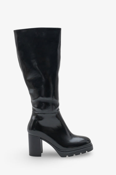 Cetta çizme, parlak ve pürüzsüz siyah deri görünümlü malzemesiyle dikkat çekici bir şıklık sunar.