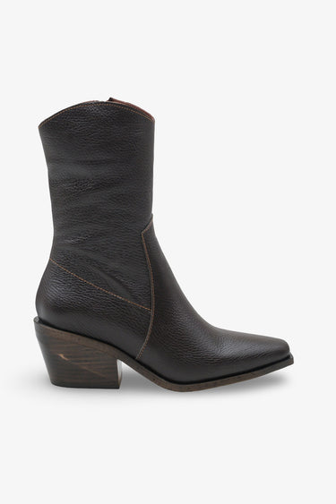 • 8 cm yüksekliğindeki açılı ve ahşap görünümlü kalın topuk tasarımı kovboy botu estetiğini şehir hayatına taşır.