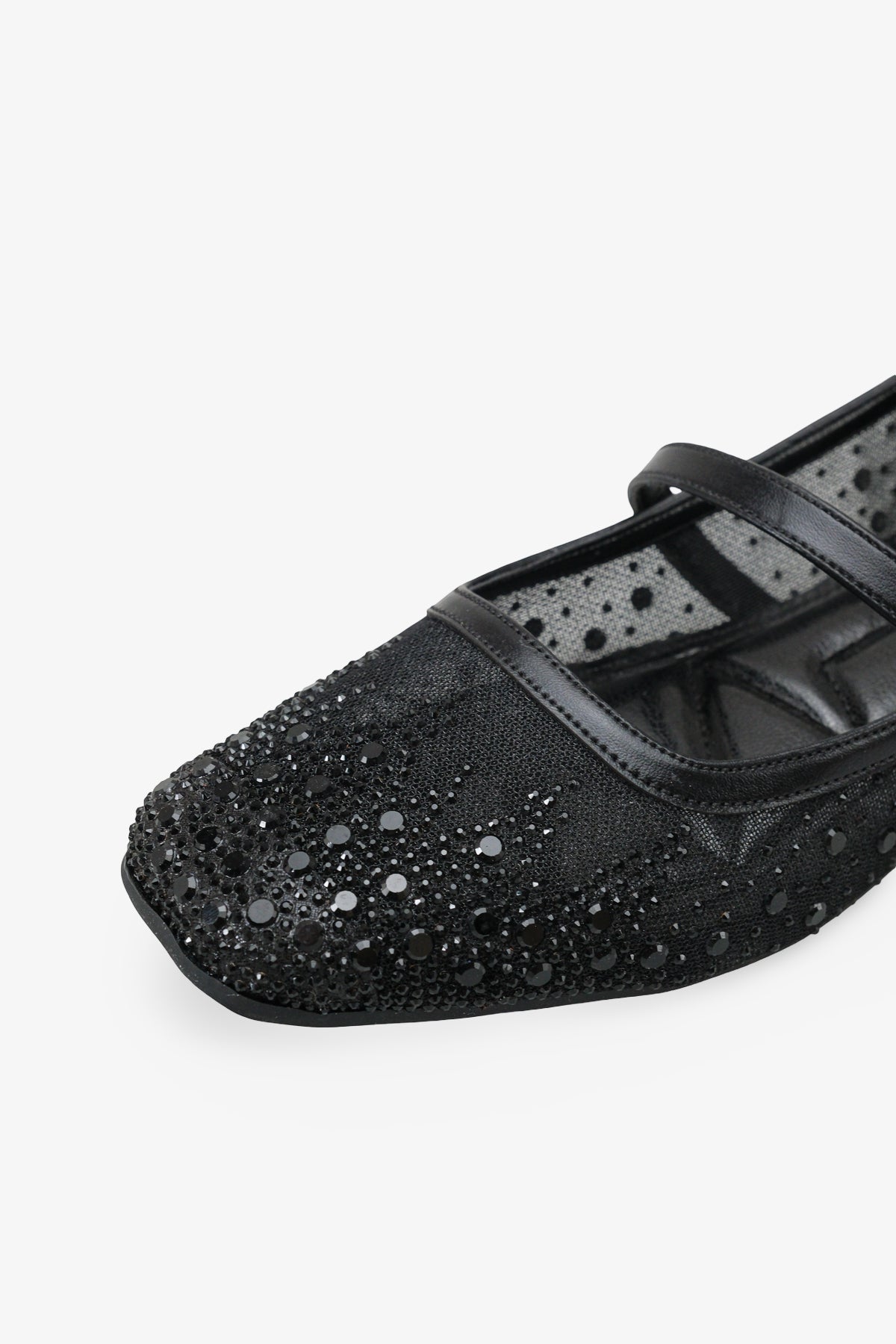 Transparan file (mesh) dokusu üzerine işlenmiş siyah ışıltılı taş detayları, stilinize hem modern hem de lüks bir zarafet katar.