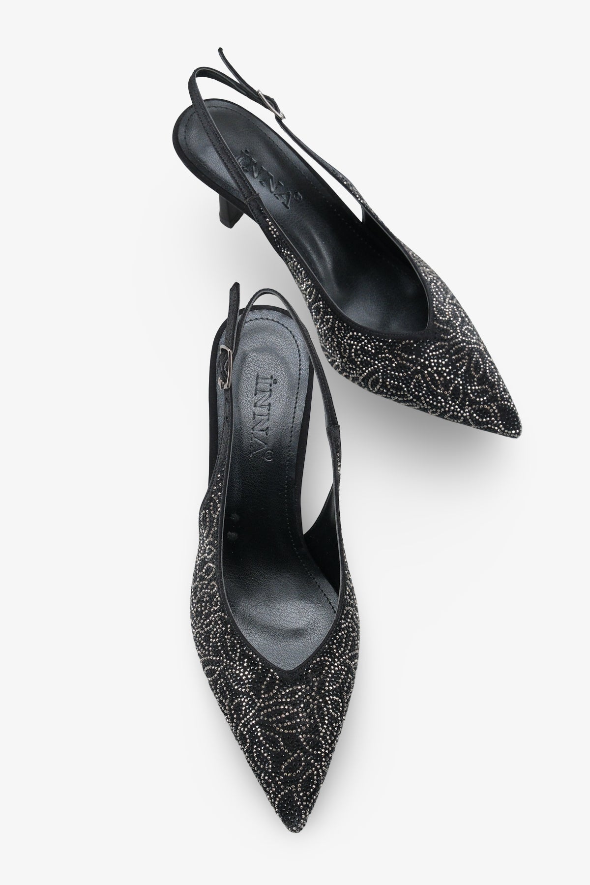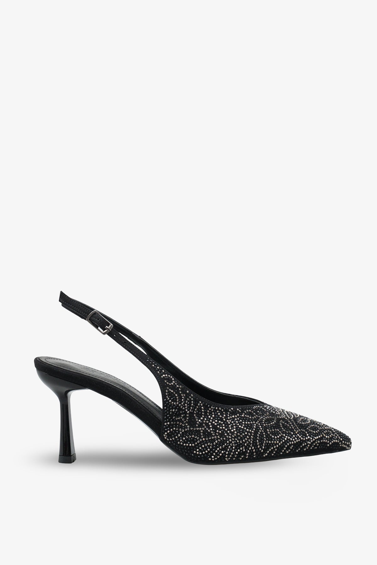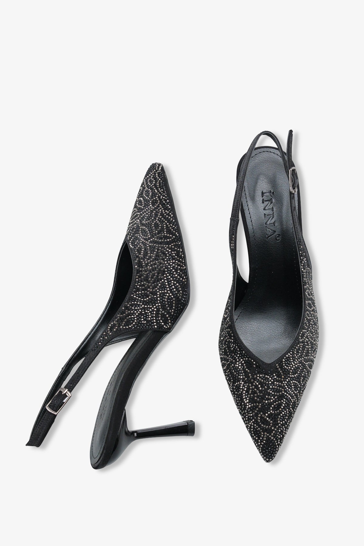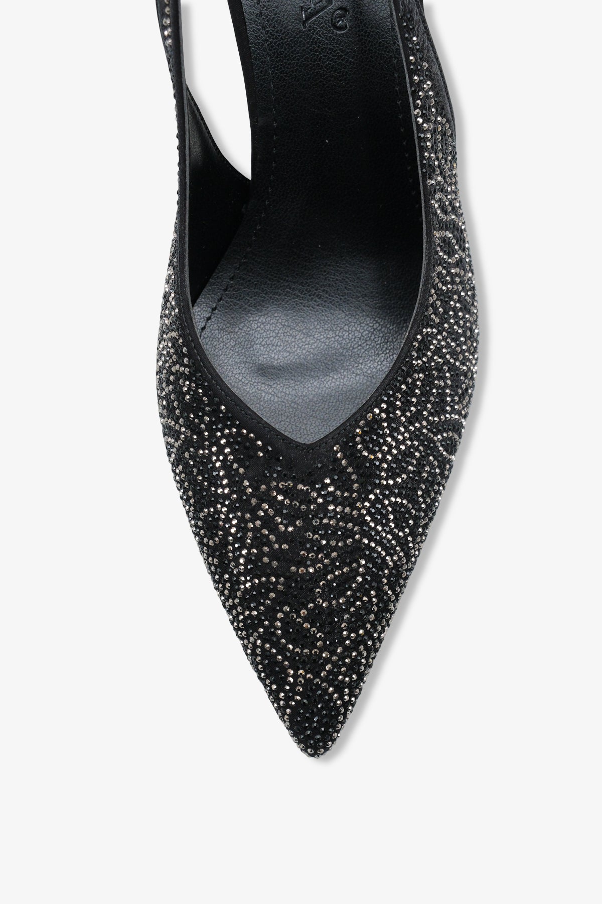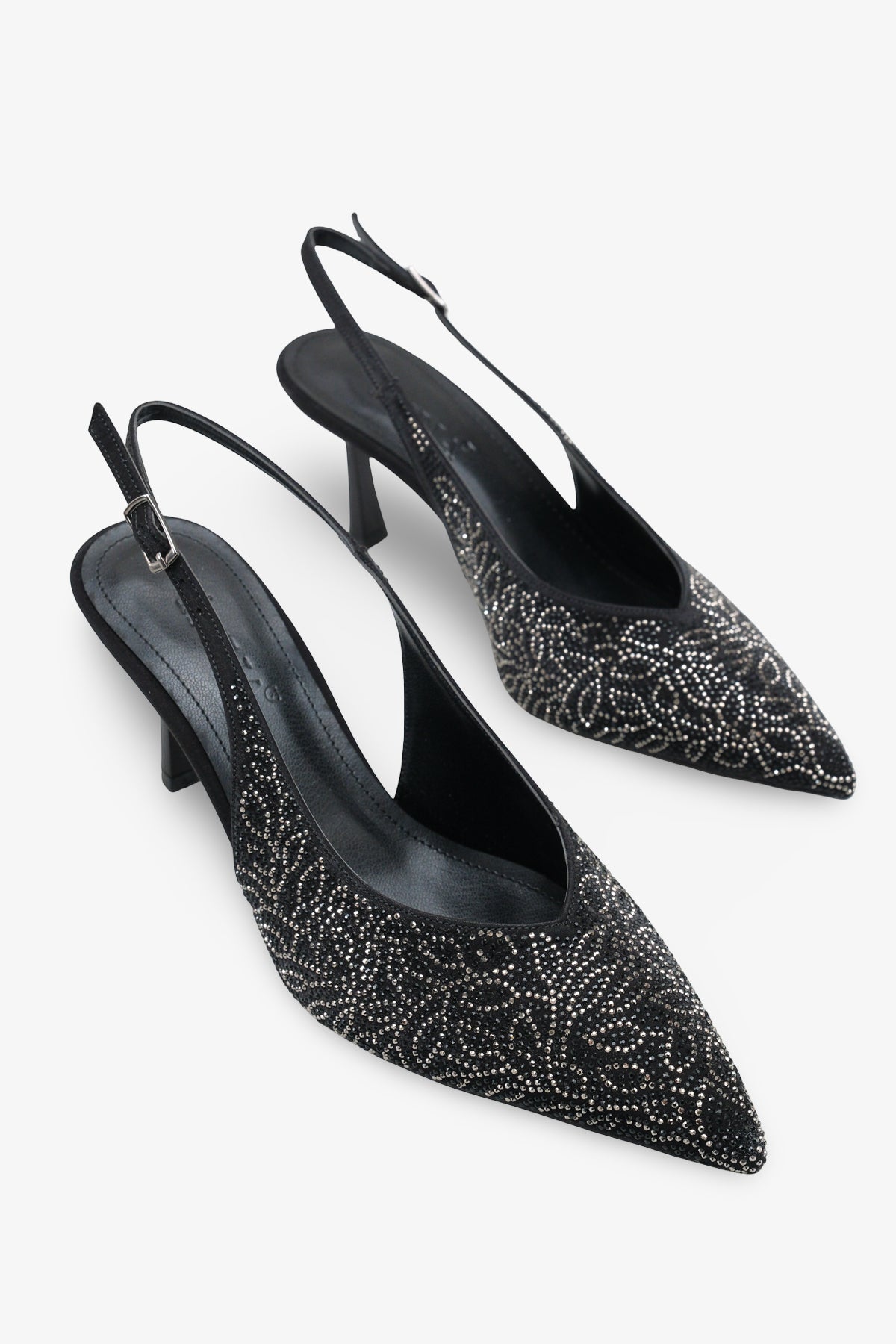 Siyah suni deri üzerine işlenen yoğun kristal taş desenleriyle tasarlanan Bella abiye ayakkabı, ışıltısıyla özel gecelerin yıldızı olmanızı sağlar.