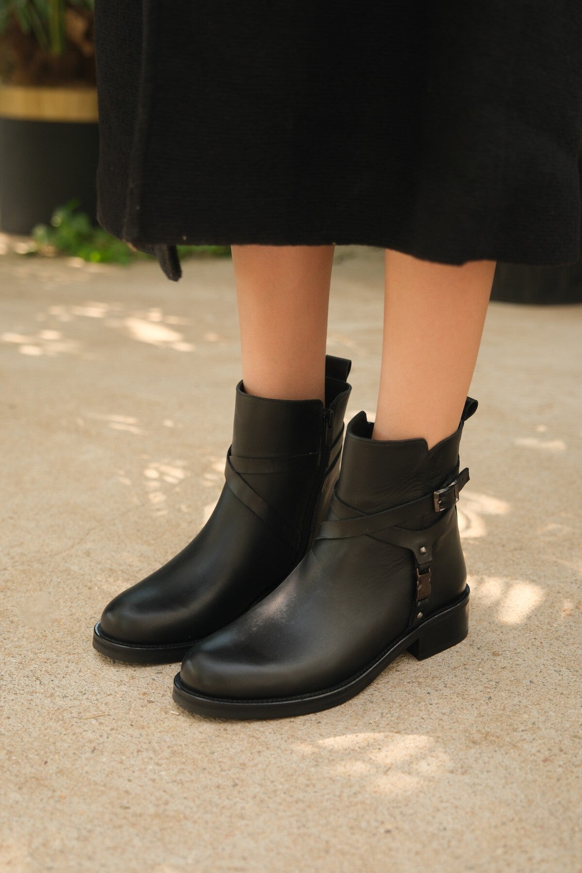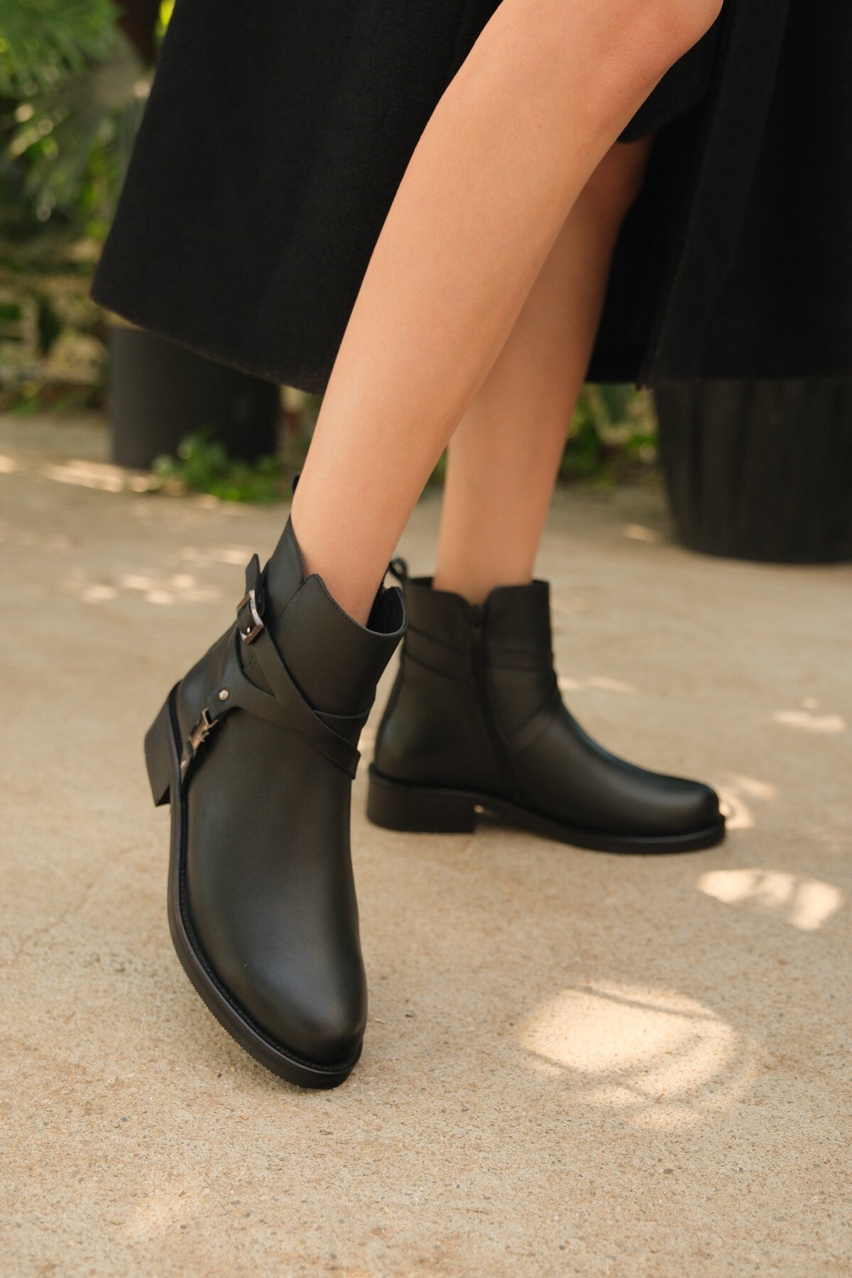 Bileği zarifçe saran çapraz kemer detayları ve metal toka aksesuarları, klasik bot görünümünü modern ve trend bir çizgiye taşır.