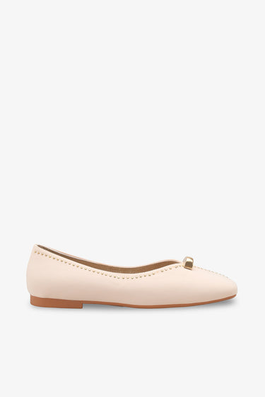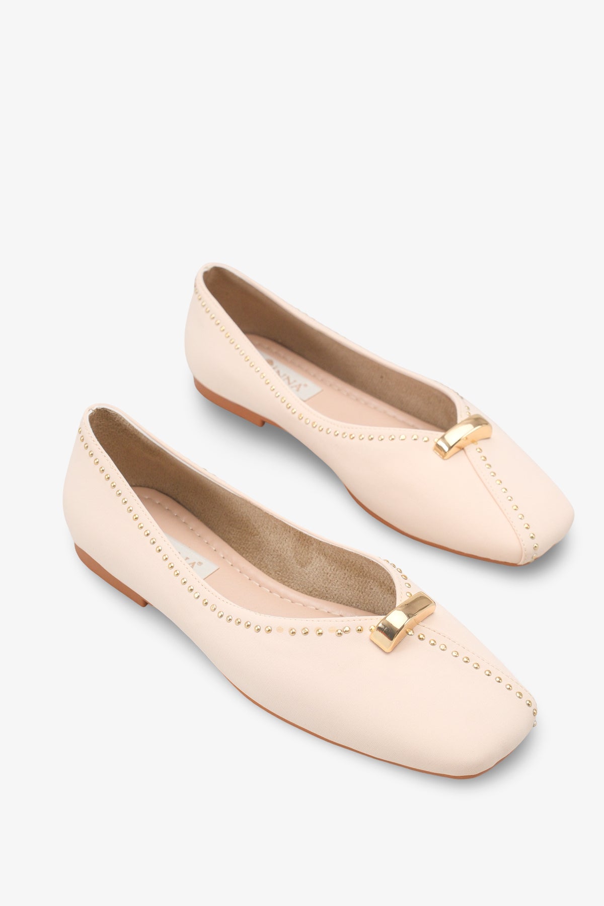 Ayakkabının kenar hatlarını ve ön dikişini zarifçe çevreleyen gold (altın) renkli mini zımba detayları ile üst kısımdaki göz alıcı metal aksesuar, klasik babet formuna lüks, feminen ve karakteristik bir hareket kazandırır.