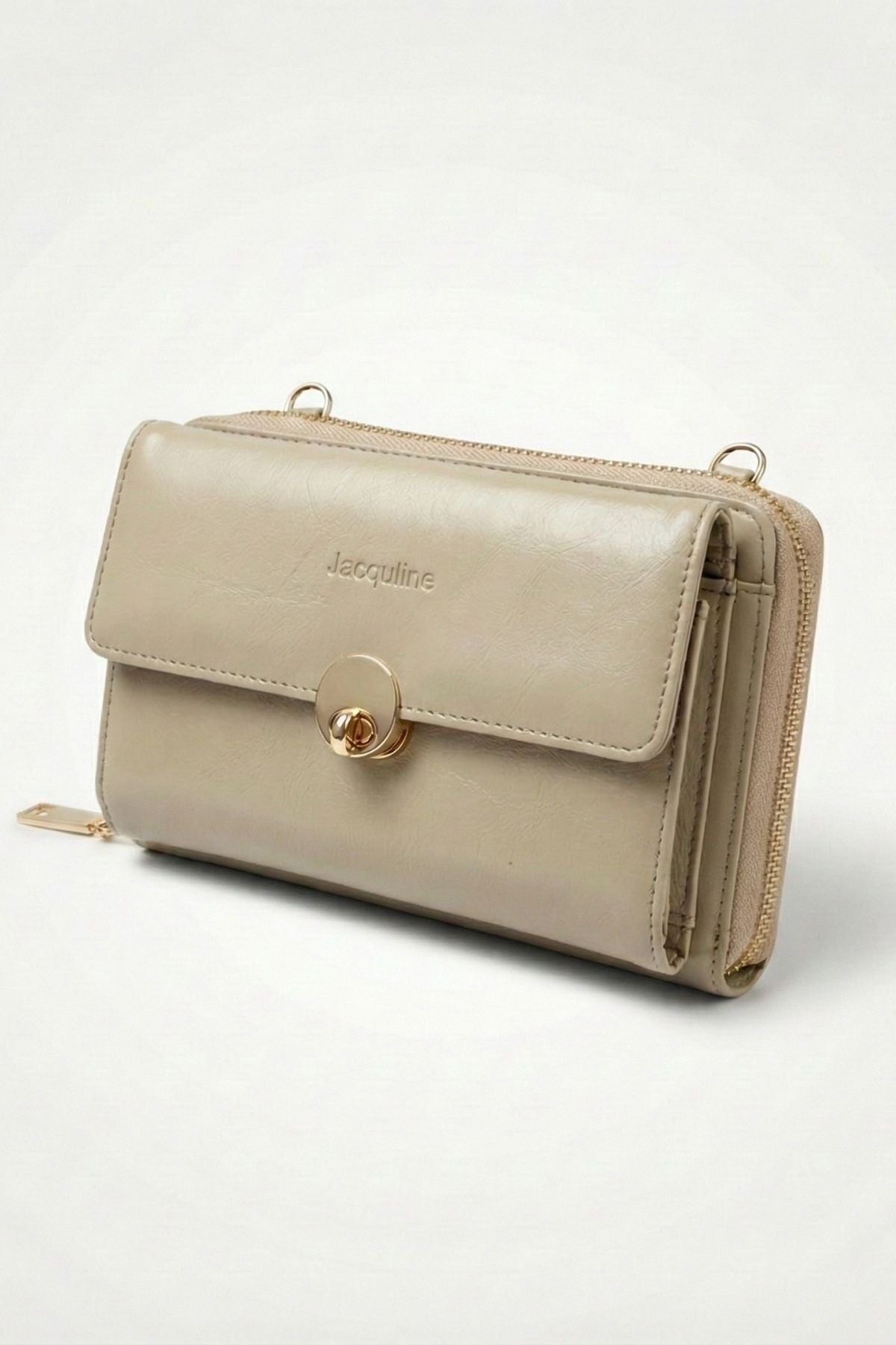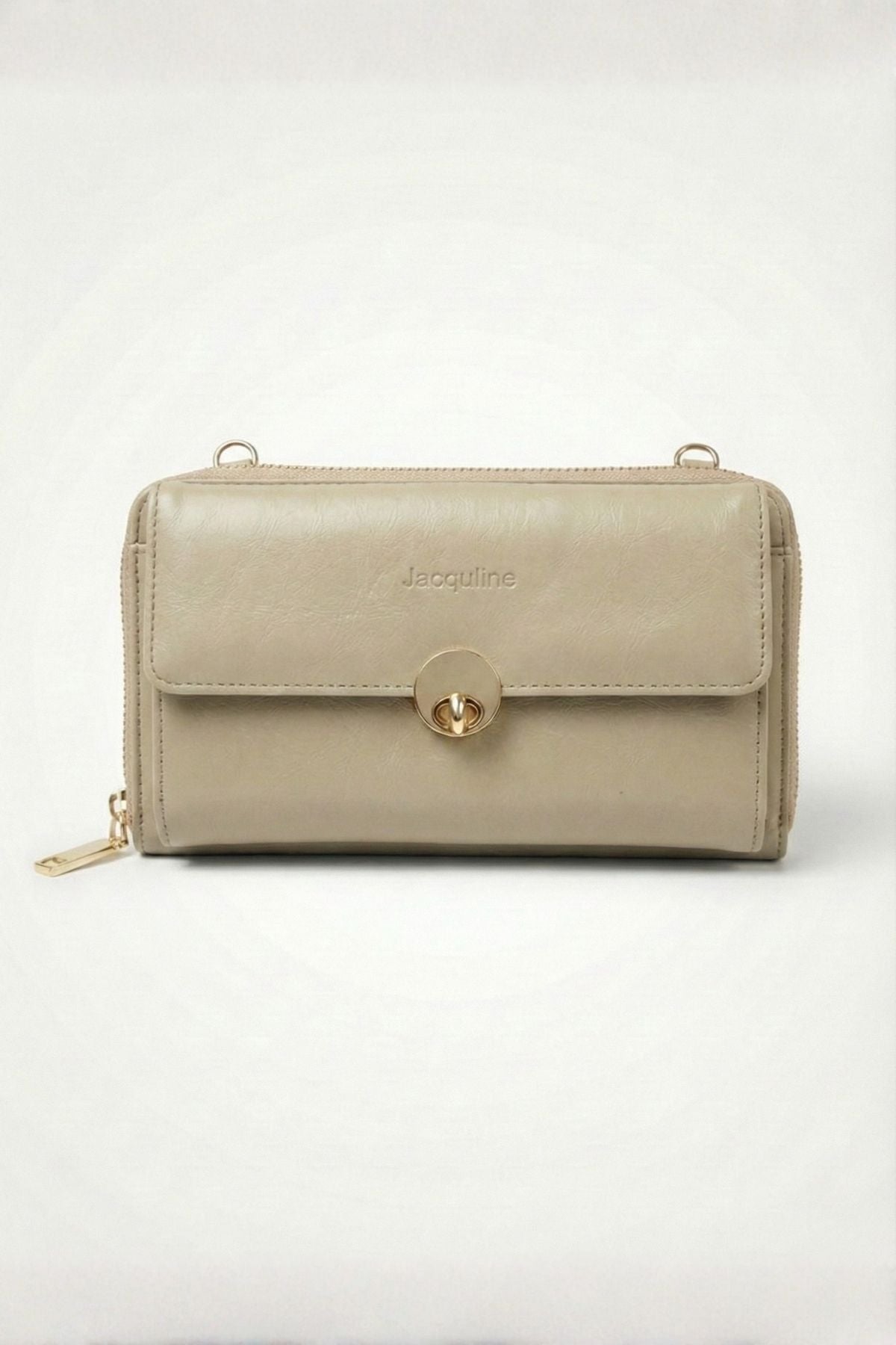 Ön kapaktaki şık gold renkli çevirmeli kilit detayı ve zarif "Jacqueline" baskısı, bu fonksiyonel aksesuara modern ve lüks bir ışıltı kazandırır.