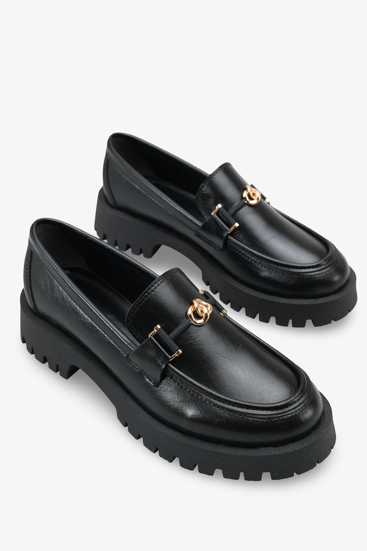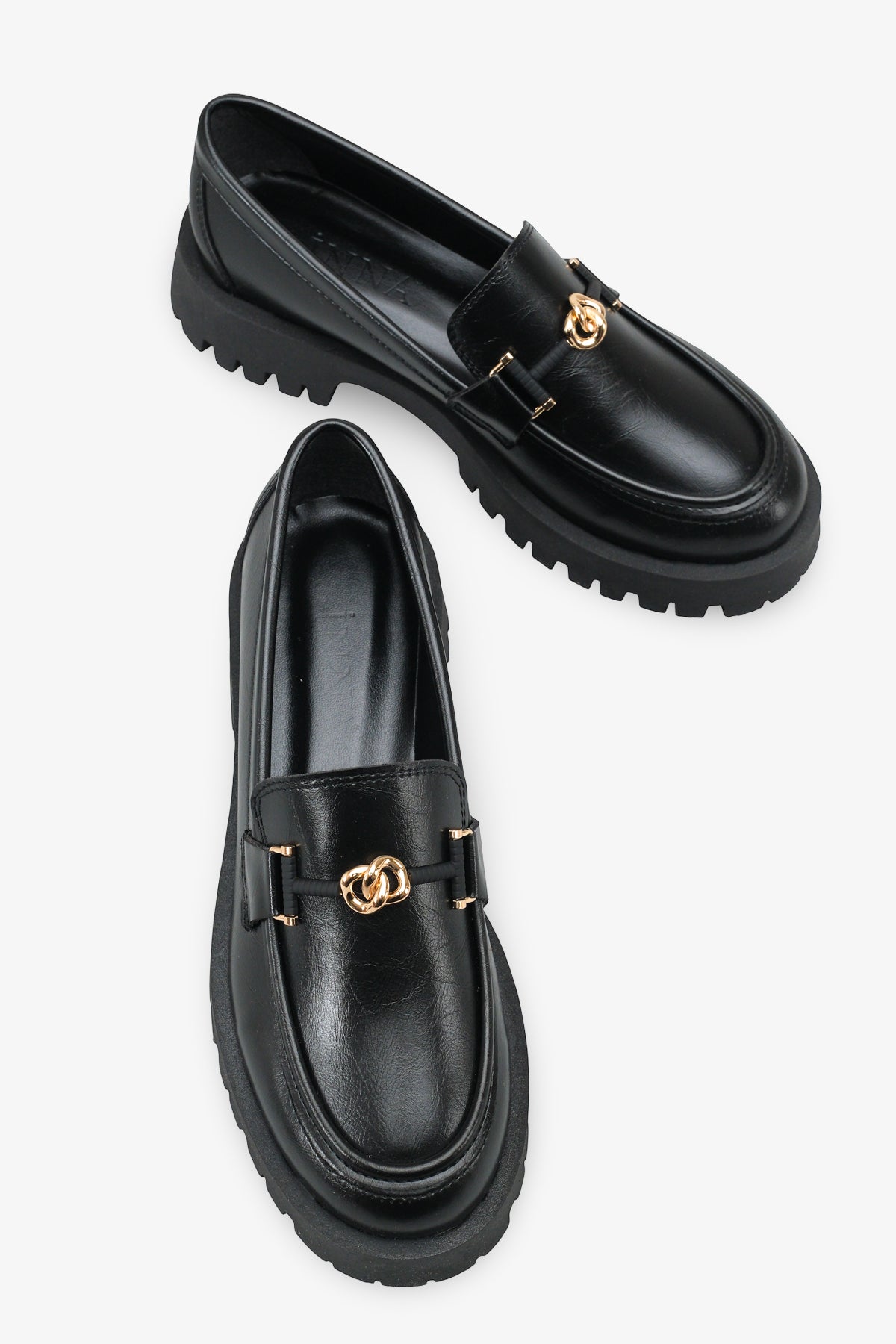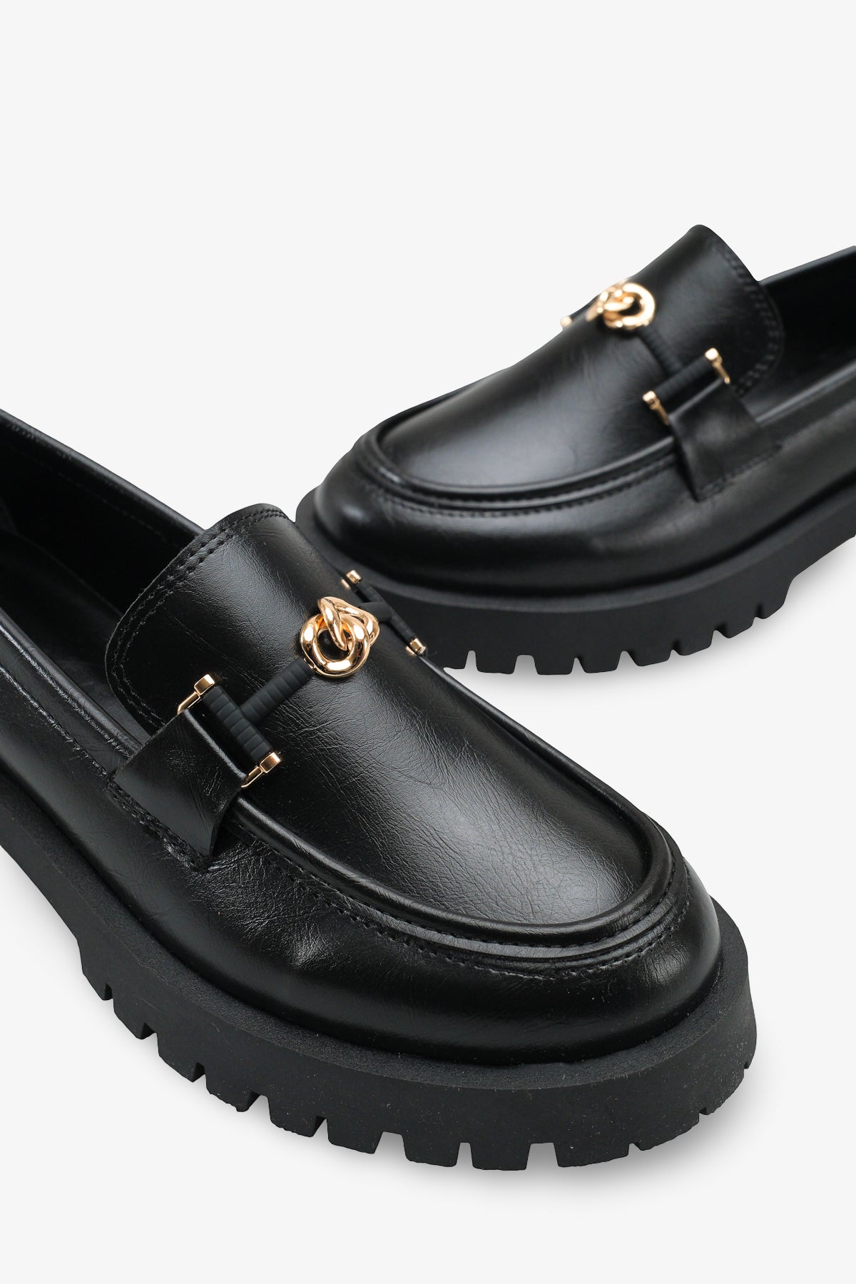 Yuvarlak burun kesimi ve ön kısmındaki gold renkli şık metal aksesuar, klasik loafer tasarımını zarif bir şekilde hareketlendirir.