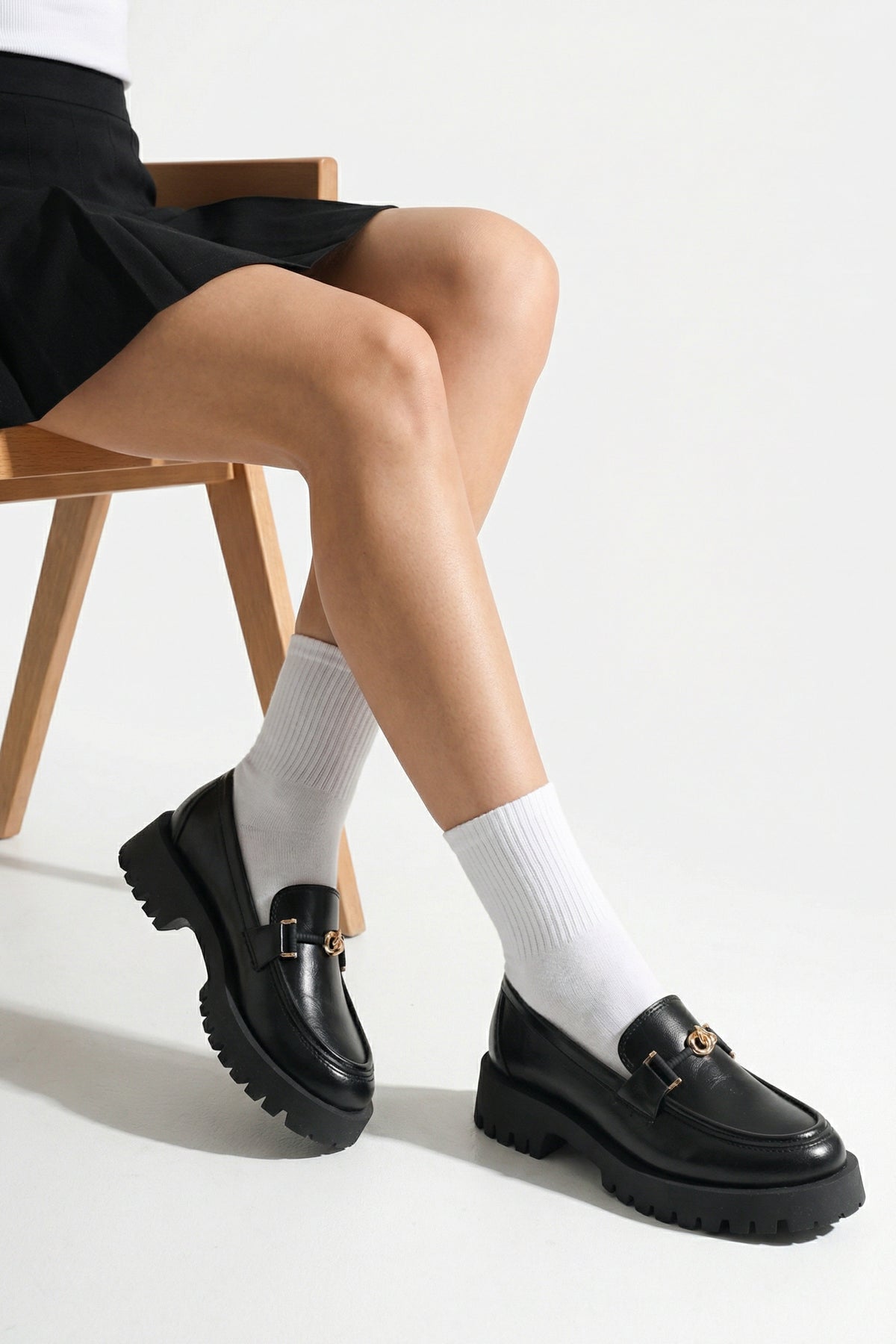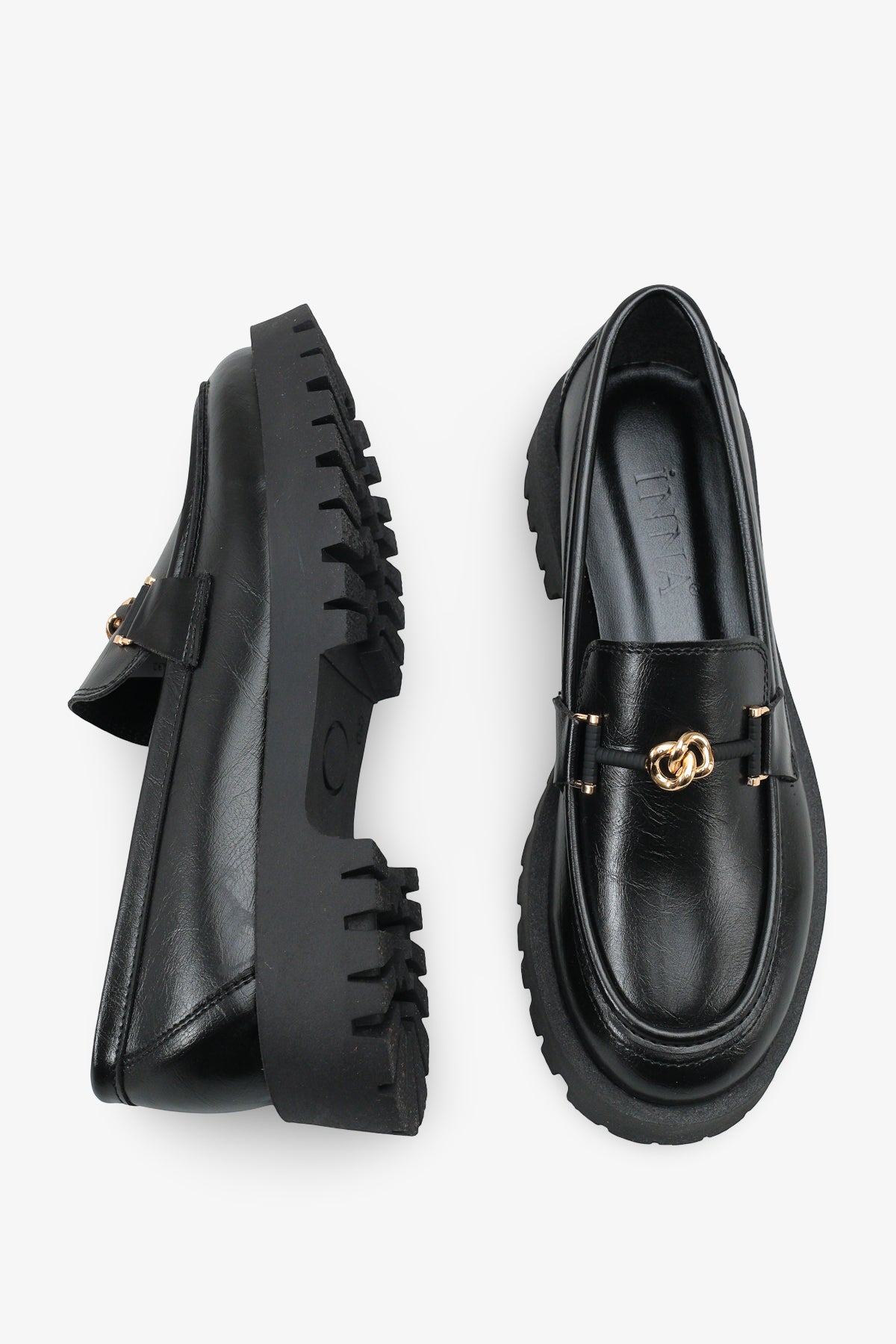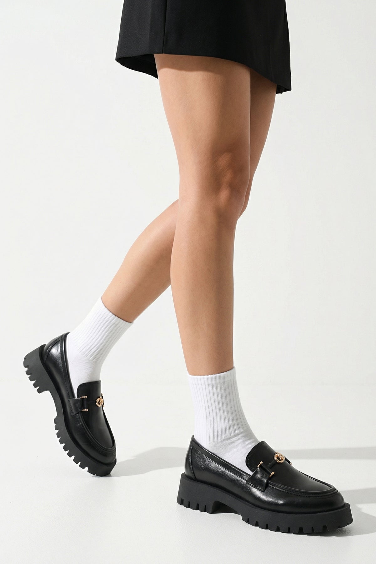 Yuvarlak burun kesimi ve ön kısmındaki gold renkli şık metal aksesuar, klasik loafer tasarımını zarif bir şekilde hareketlendirir.