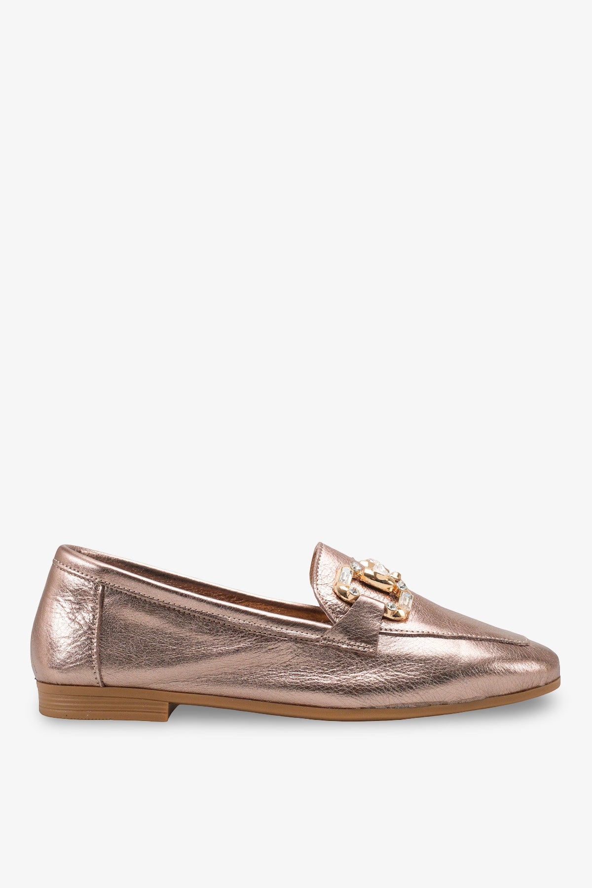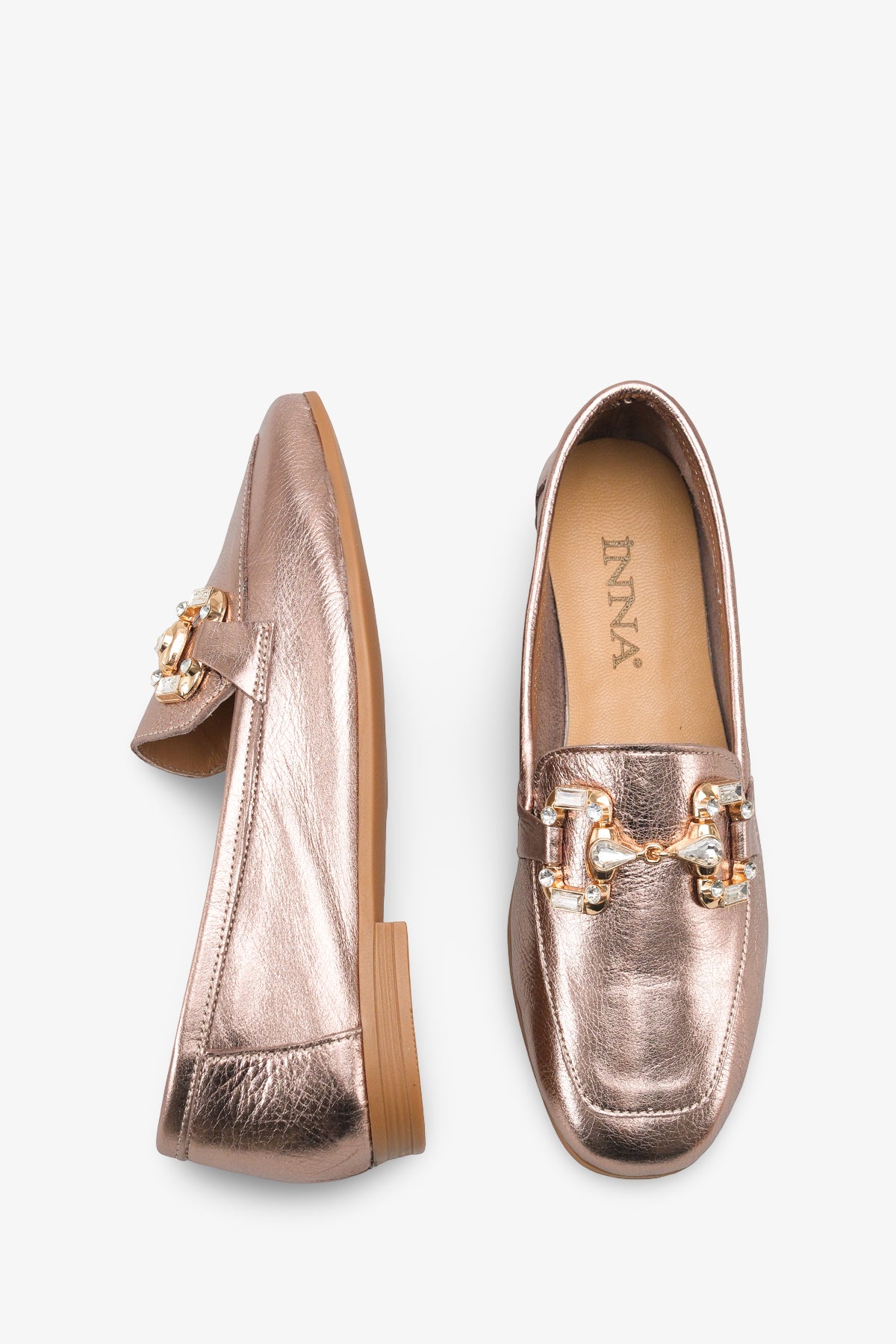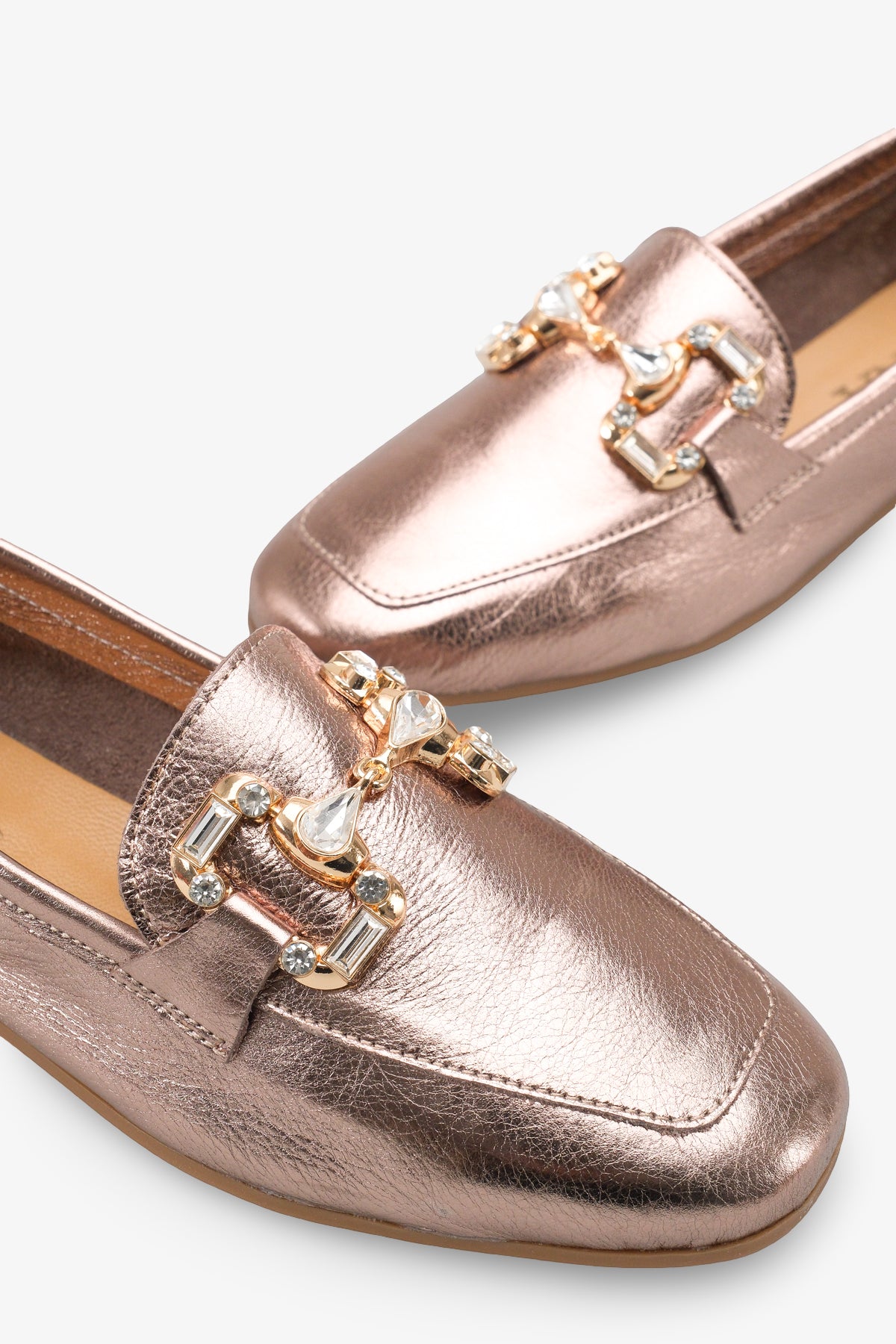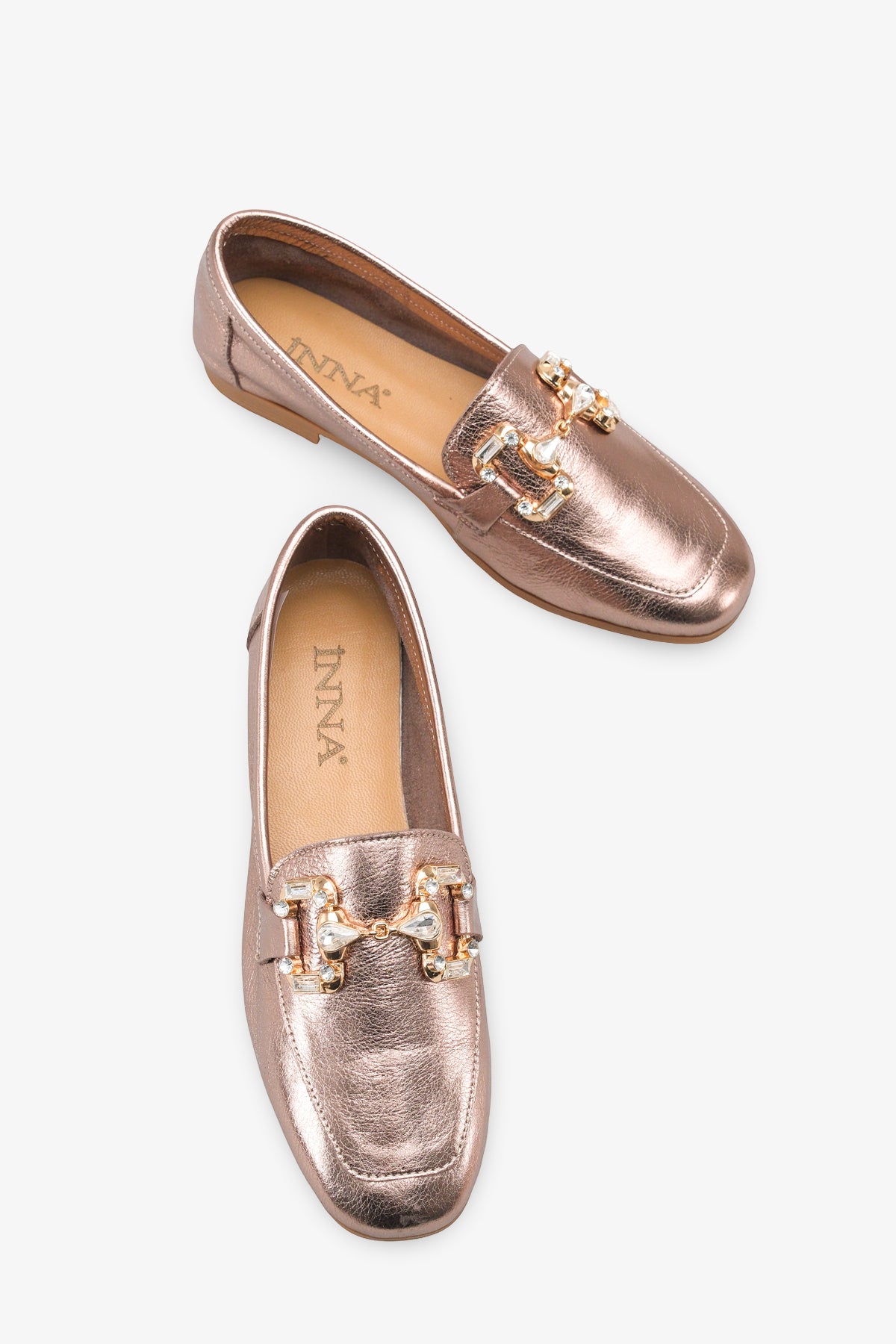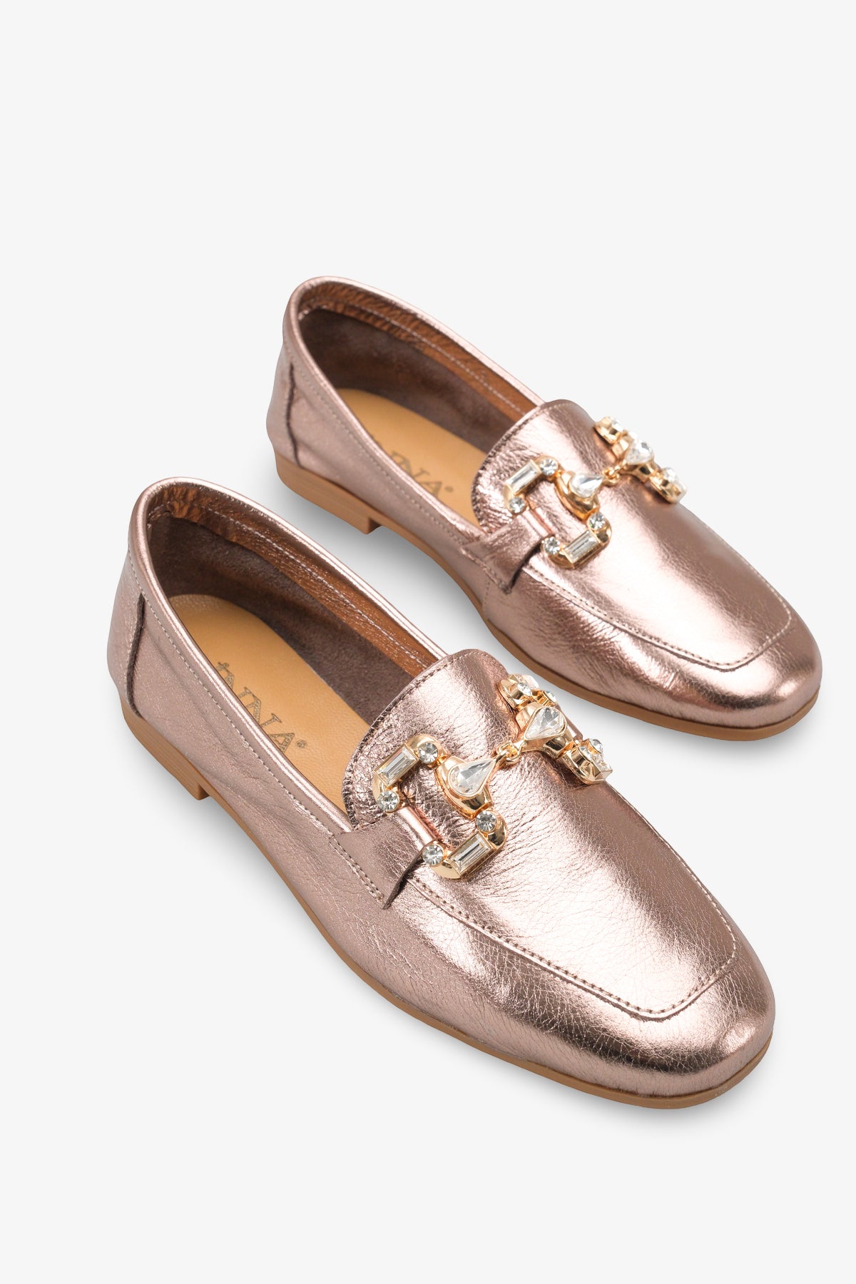 Saya üzerinde yer alan kristal taşlı toka aksesuarı, klasik loafer görünümünü zarif ve ışıltılı bir estetikle buluşturur.