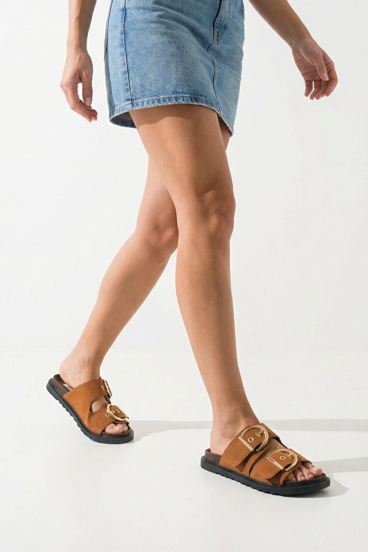 Yumuşak süet dokulu dış yüzeyi, geniş çift bant tasarımıyla birleşerek gün boyu konforlu ve şık bir kullanım sunar.