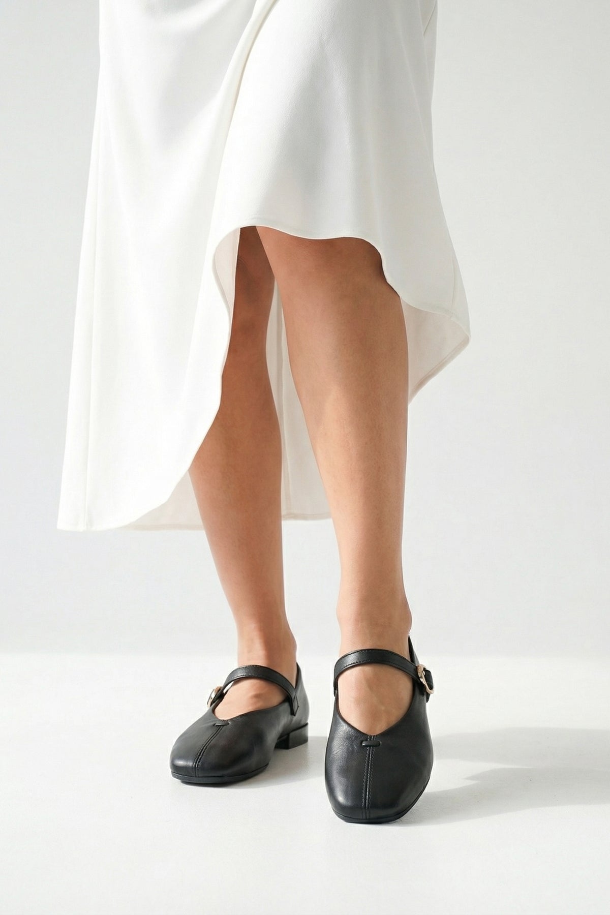 Ön kısımda yer alan belirgin dikiş detayı ve ayağı saran kemerli bant tasarımı, sadeliği şık ve özgün bir formla birleştirir.