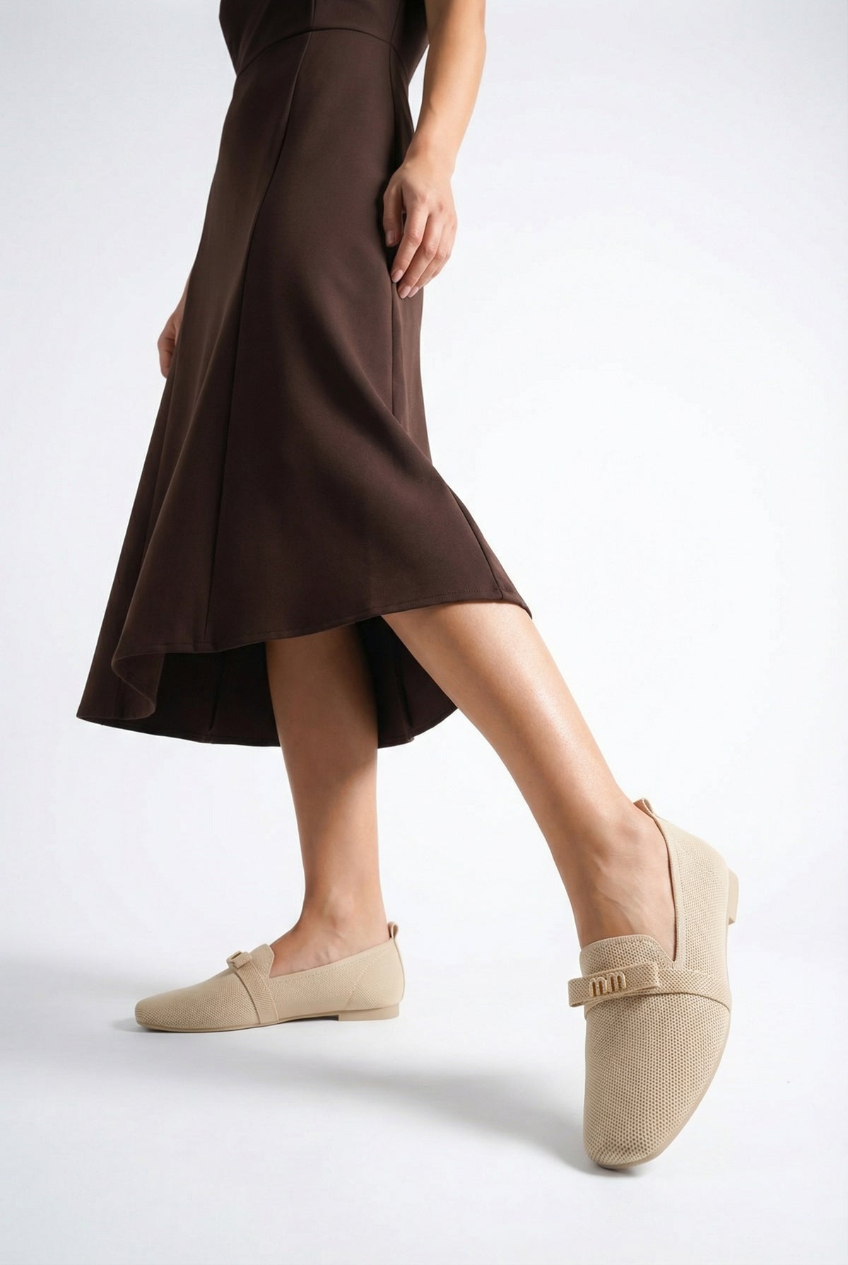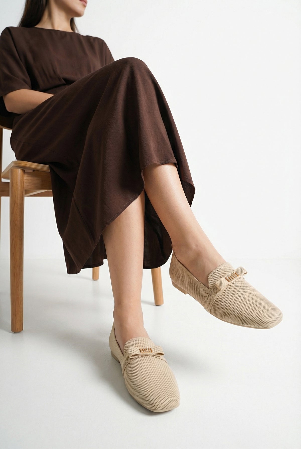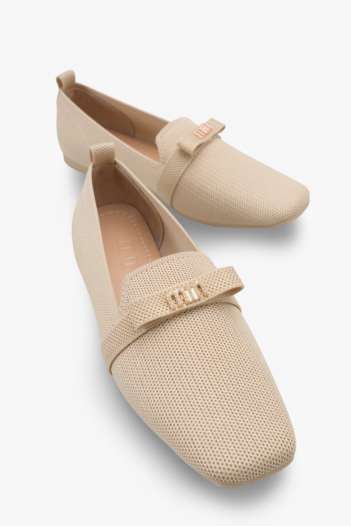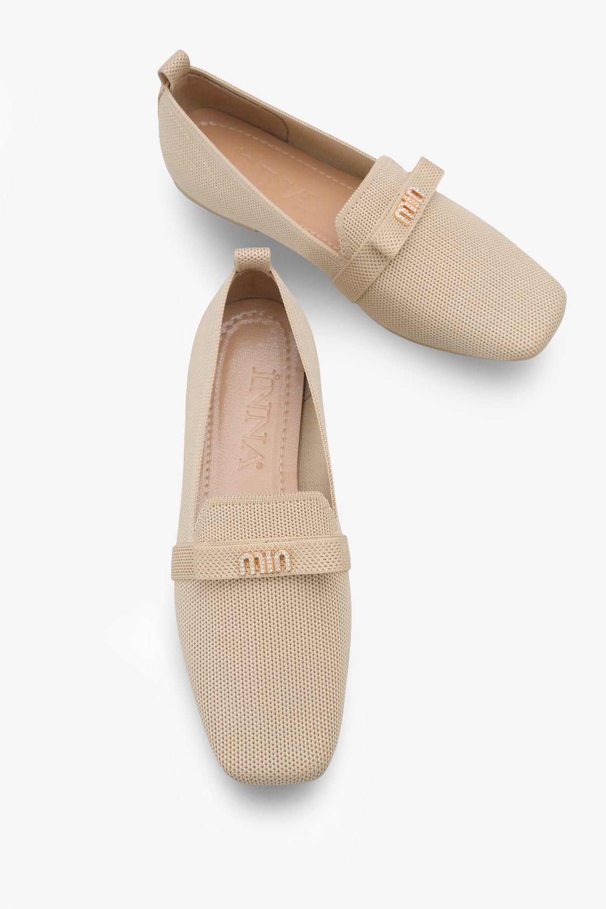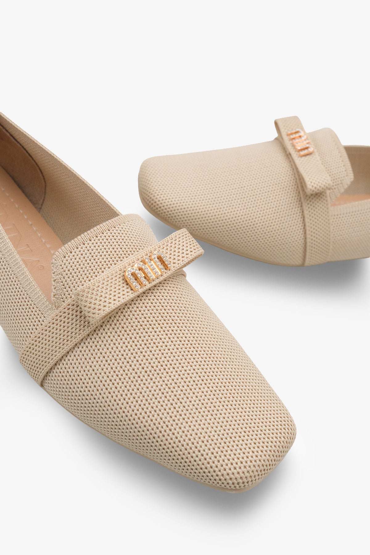 Modern kare burun tasarımı ve şık metal aksesuar detayıyla zenginleştirilen bu bej triko babet, stilinize sofistike bir dokunuş katar.