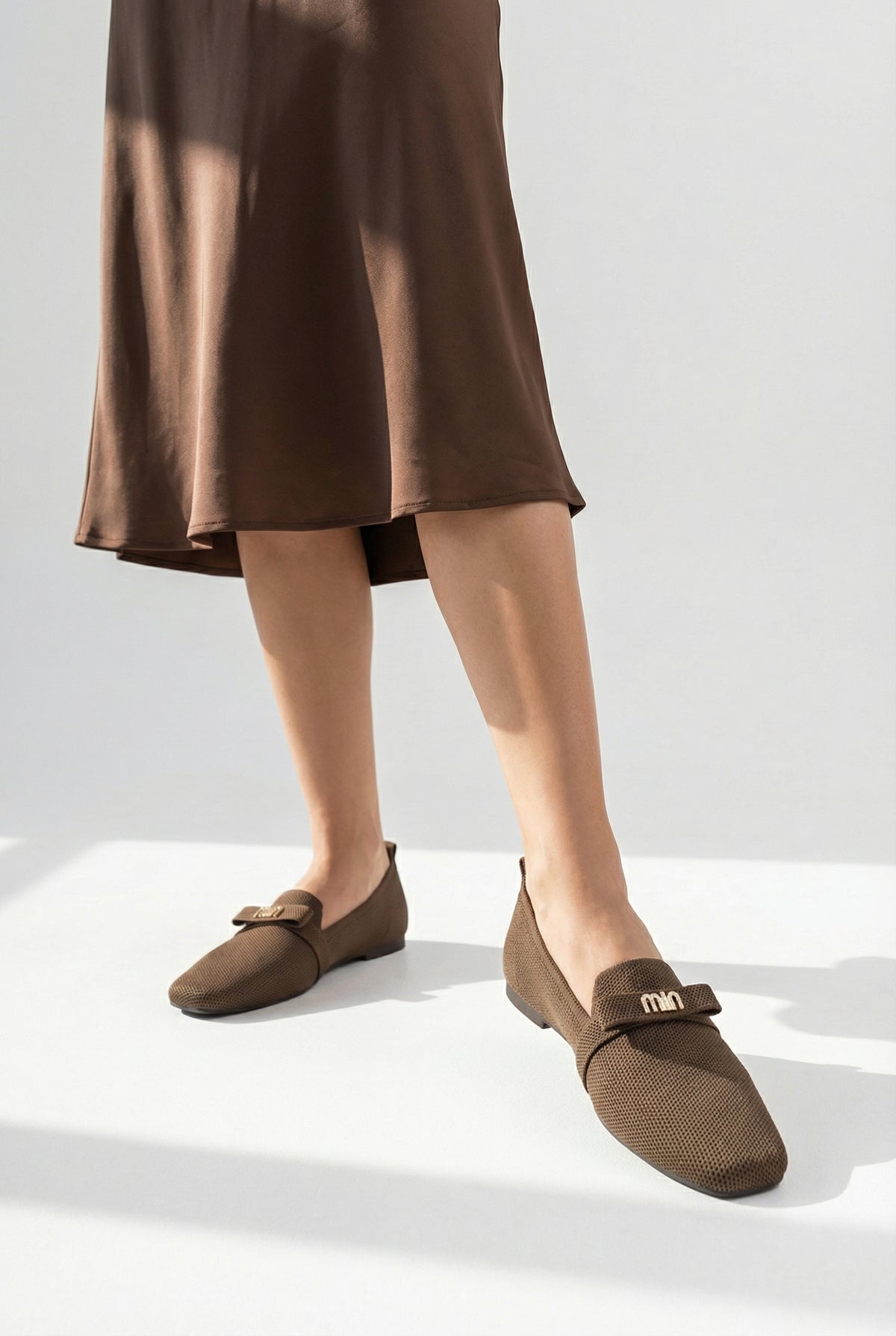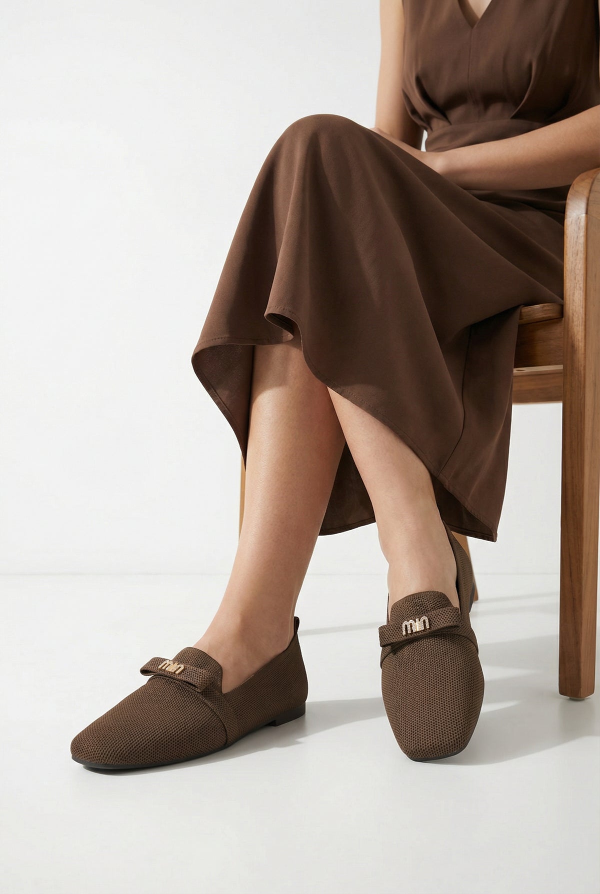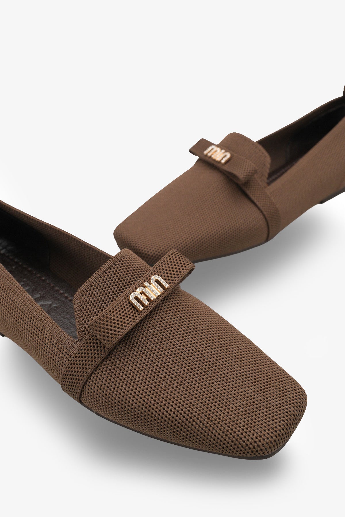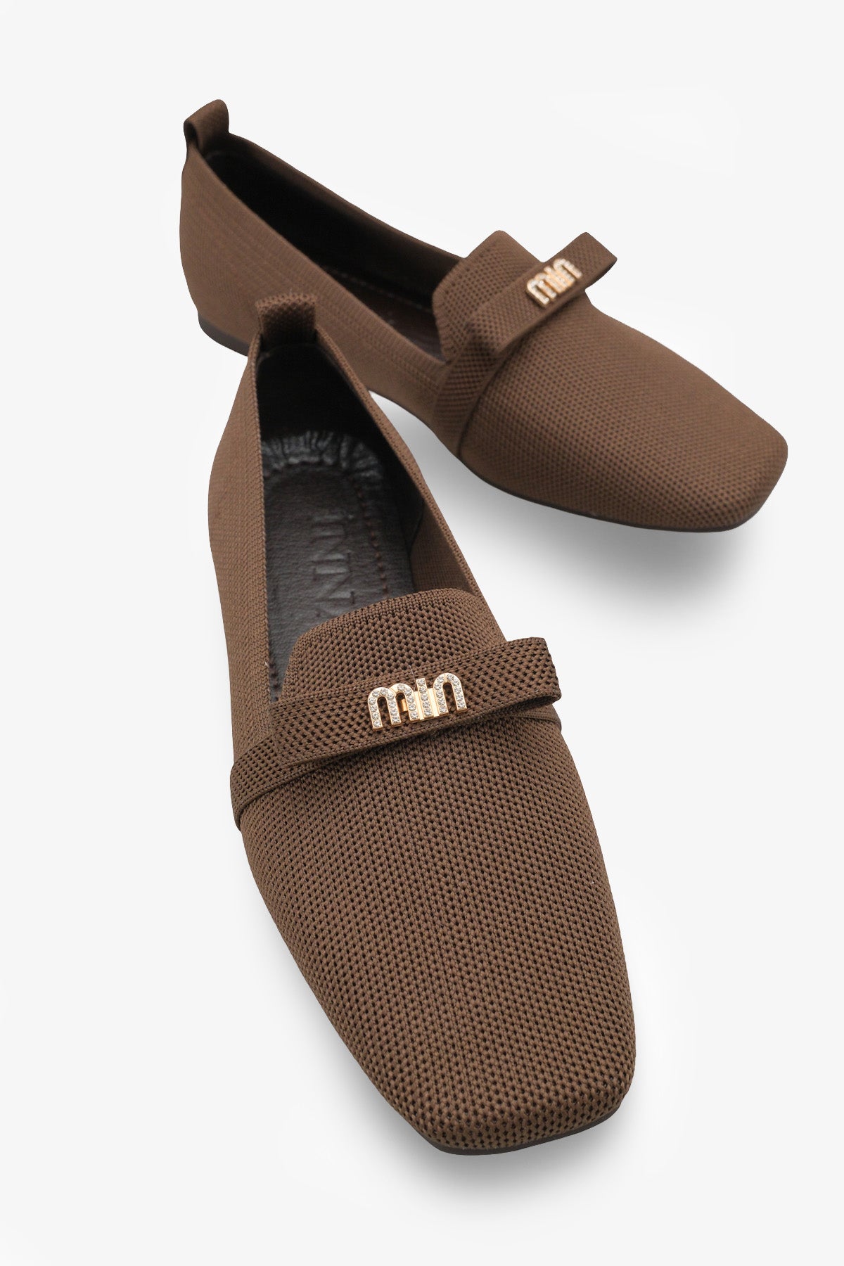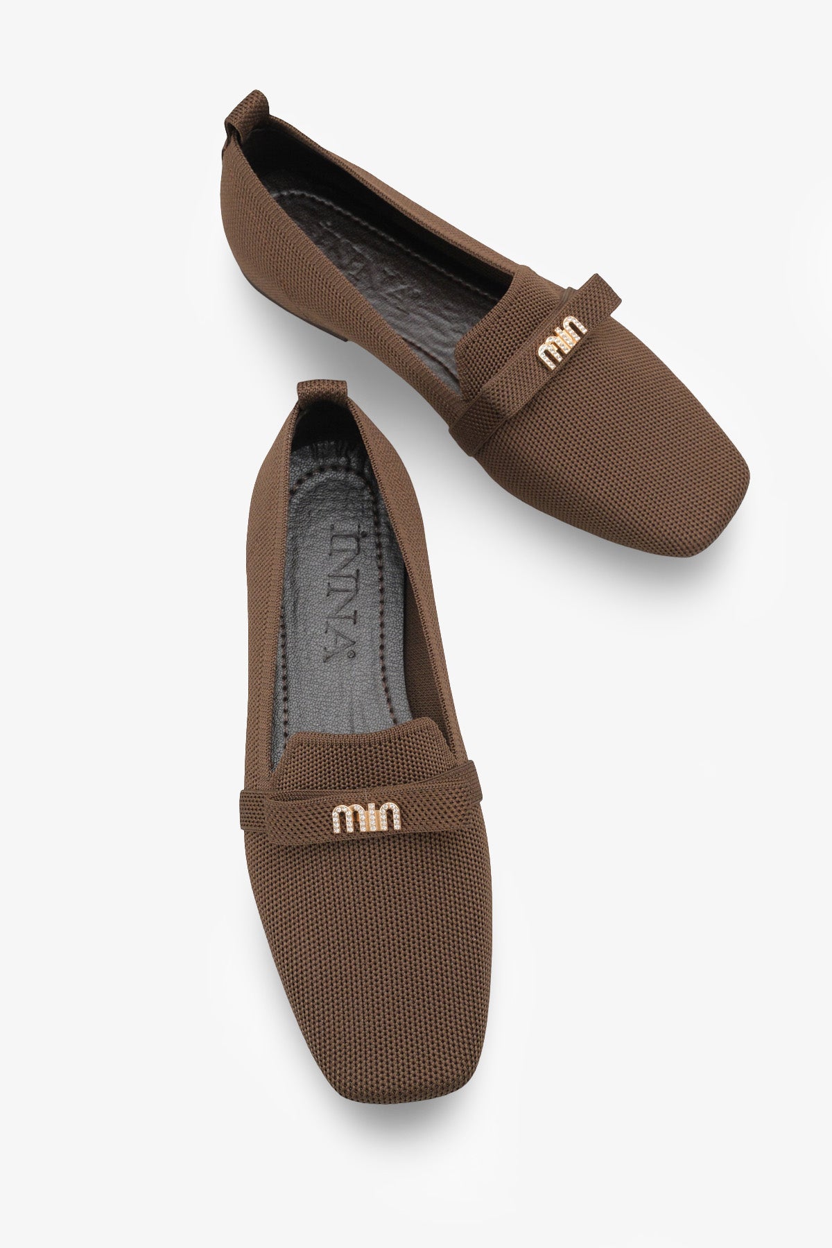 • Modern kare burun tasarımı ve şık metal aksesuar detayıyla zenginleştirilen bu kahve triko babet, stilinize sofistike bir dokunuş katar.