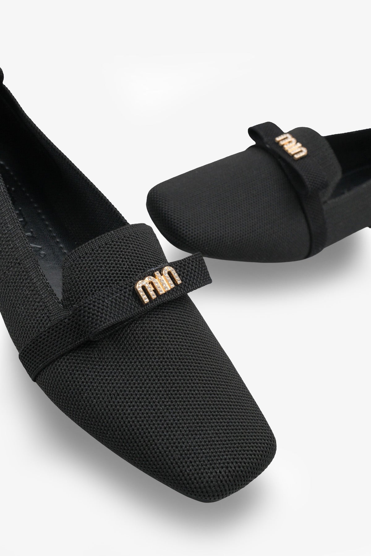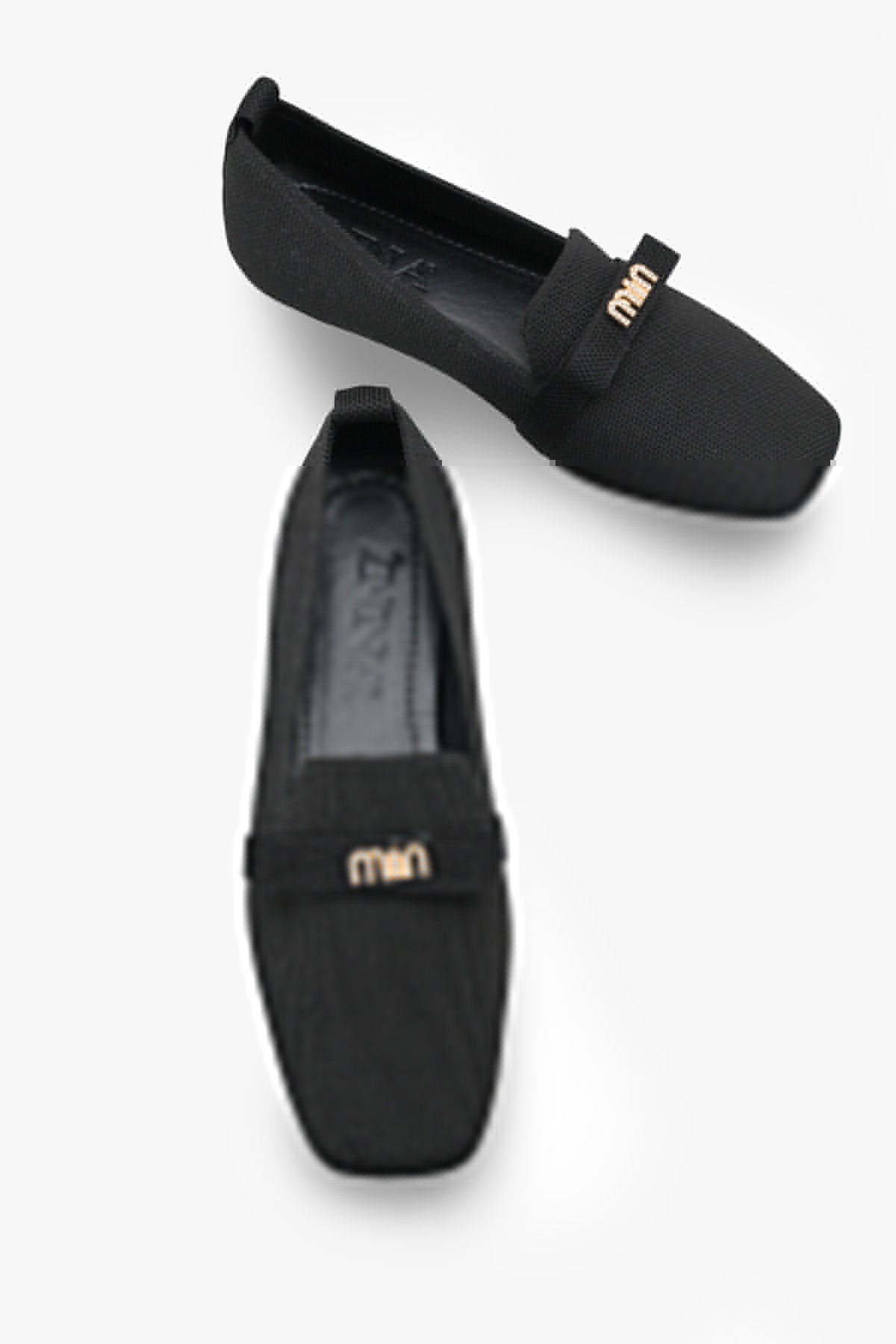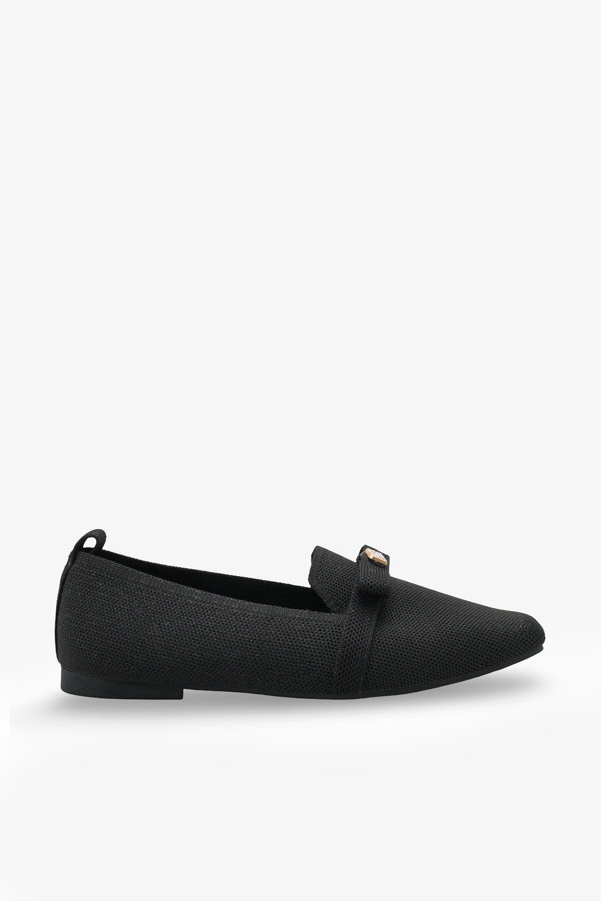 Modern kare burun tasarımı ve şık metal aksesuar detayıyla zenginleştirilen bu siyah triko babet, stilinize sofistike bir dokunuş katar.