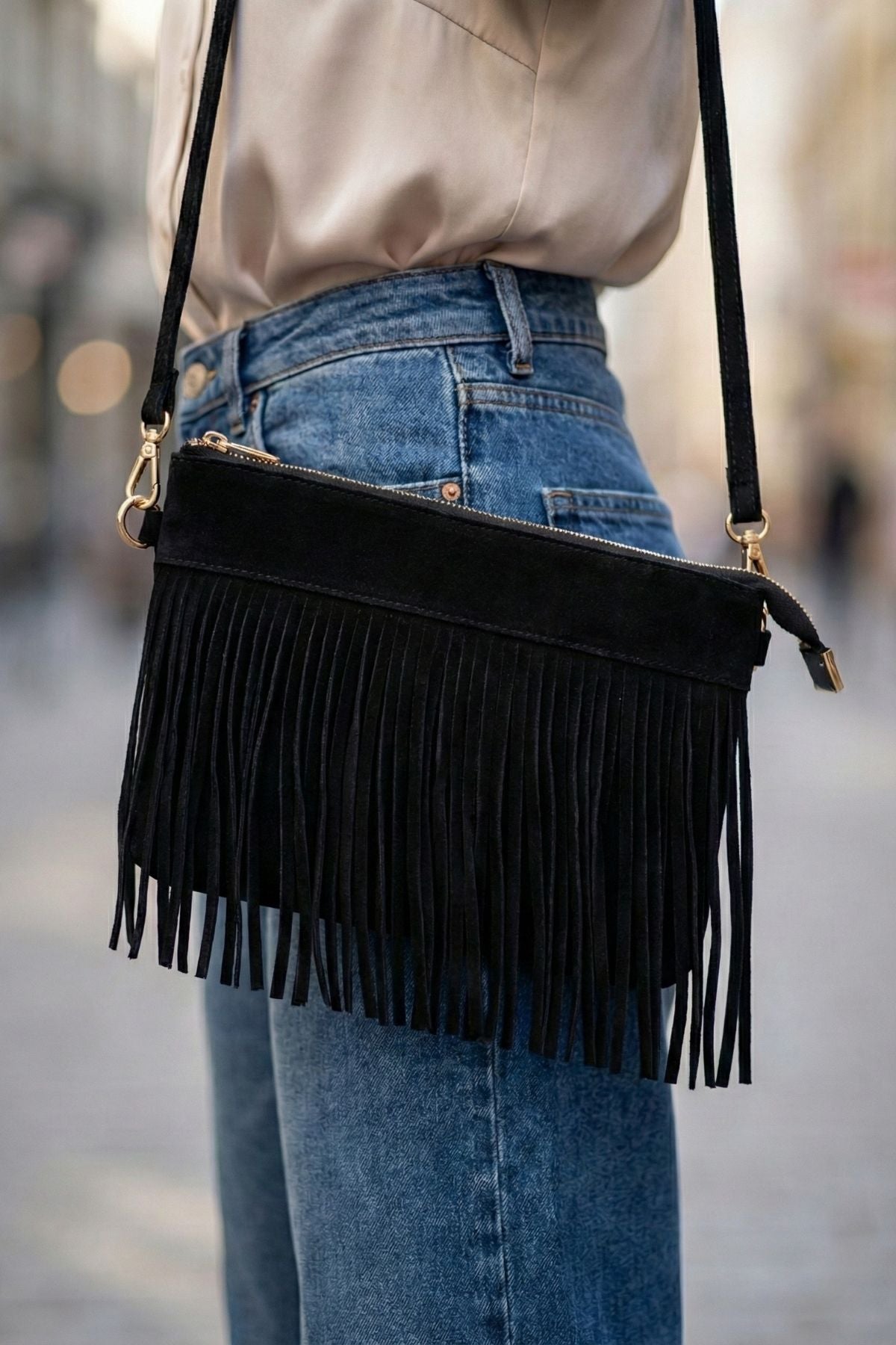 İdeal uzunluktaki ince omuz askısı sayesinde çapraz veya tek omuzda rahatça kullanılabilen bu model, günlük jean kombinlerinden festivallere kadar geniş bir kullanım alanı sunar.