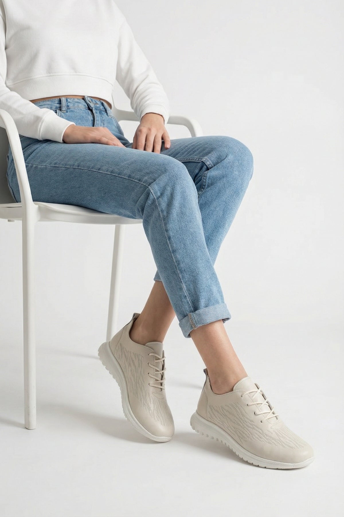 Hem rahatlığı hem de yalın şıklığıyla öne çıkan bu hakiki deri sneaker; eşofman takımlarından keten pantolonlara, basic jeanlerden günlük elbiselere kadar her kombininizle eşleşerek sokak stilinize aydınlık bir dokunuş yapar.
