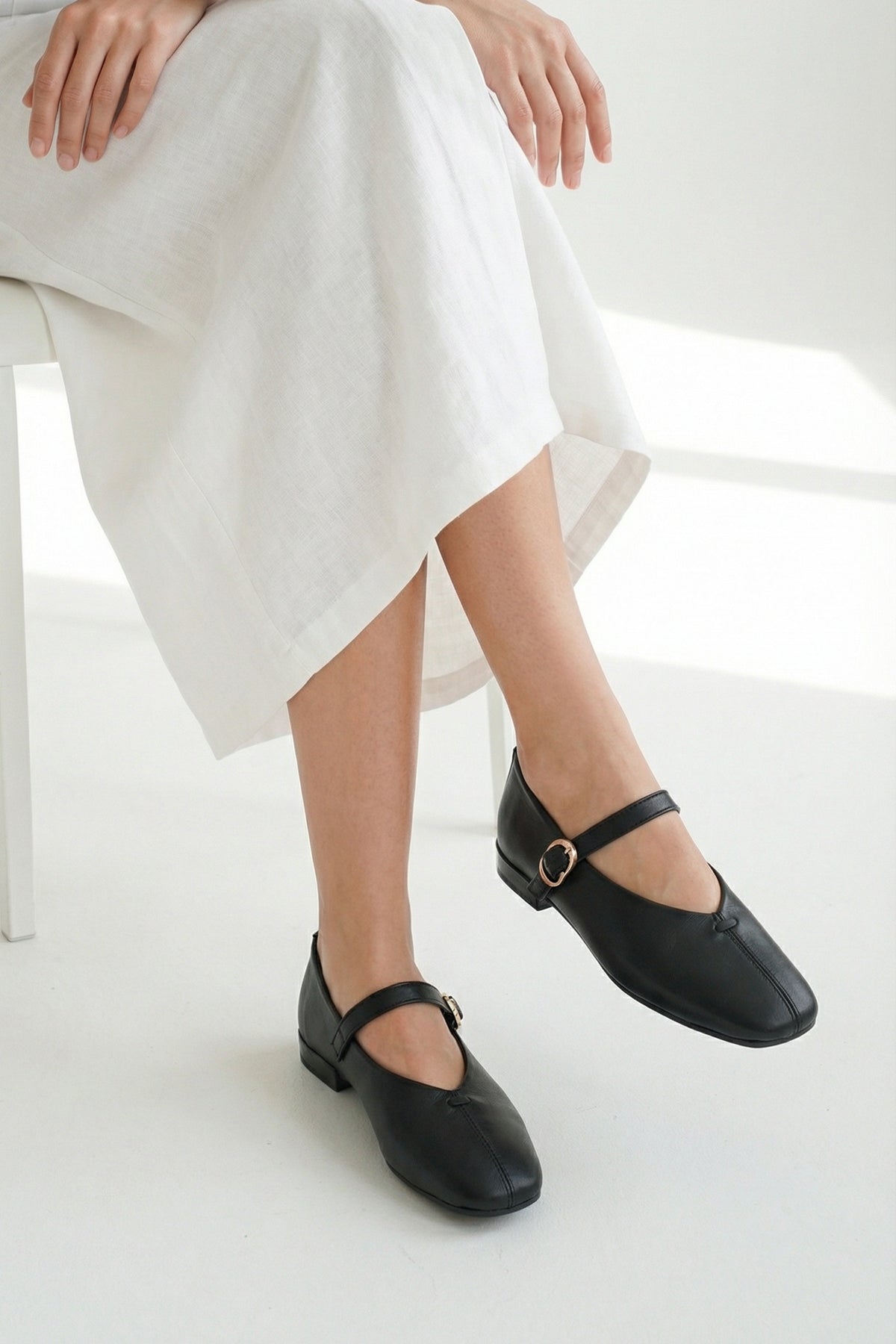 Yumuşak dokulu siyah hakiki deri saya ve ayağın üzerinden geçen zarif bant tasarımı, Meise babet modeline modern bir Mary Jane stili kazandırır.