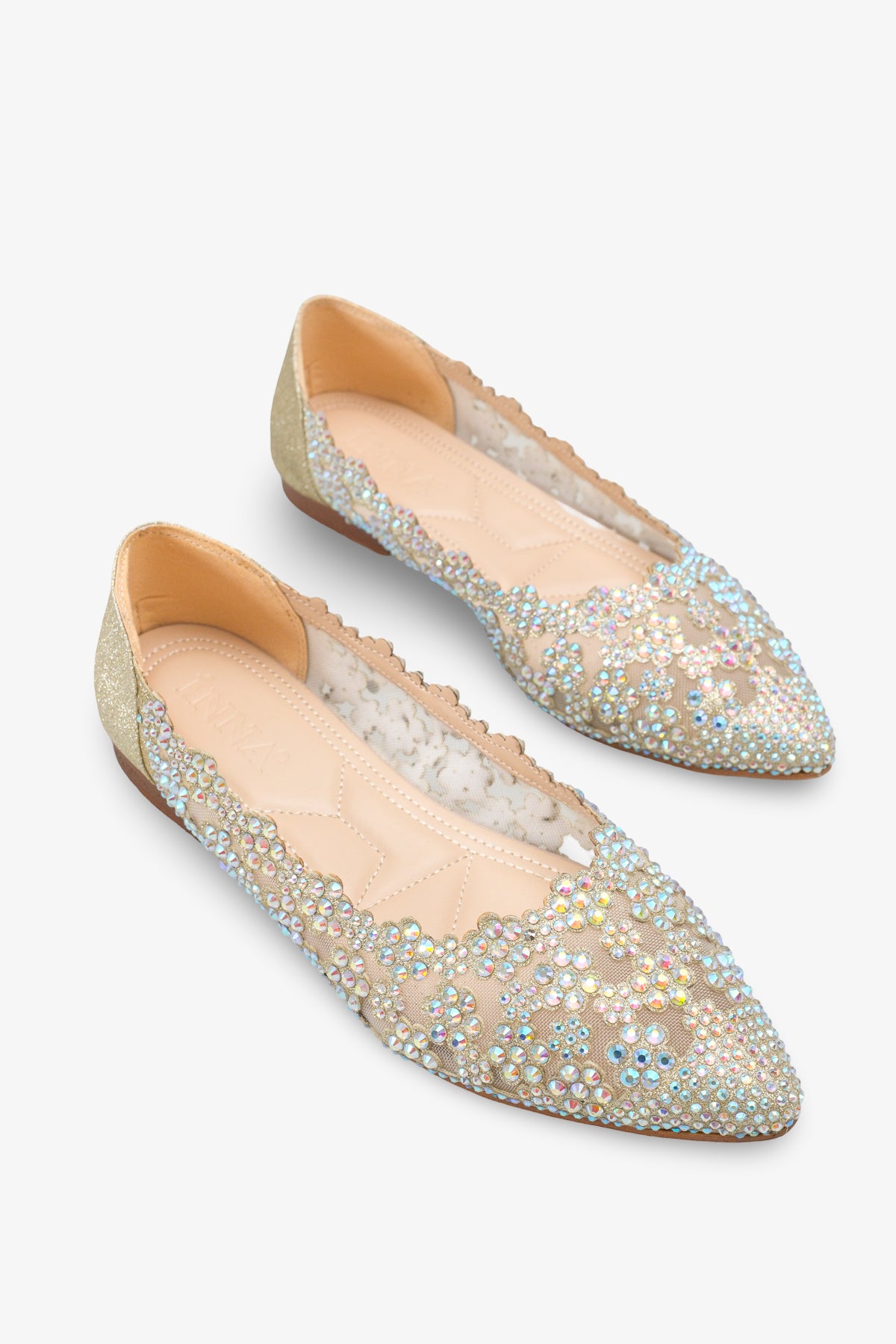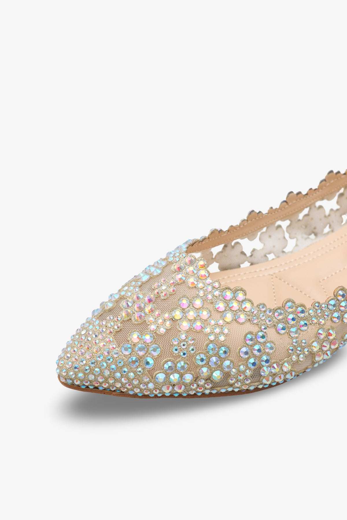 Transparan file dokusu üzerine özenle işlenmiş göz alıcı holografik taş detayları, adımlarınıza masalsı ve lüks bir ışıltı katar.