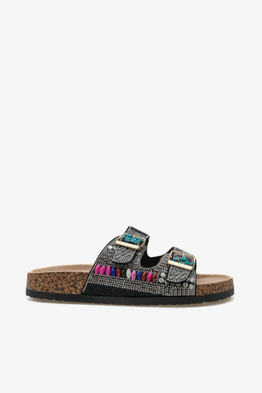 Nupas kadın terlik, üzerindeki renkli doğal taş işlemeleri ve ışıltılı boncuk detayları, klasik terlik tasarımını bohem ve enerjik bir stile dönüştürür.