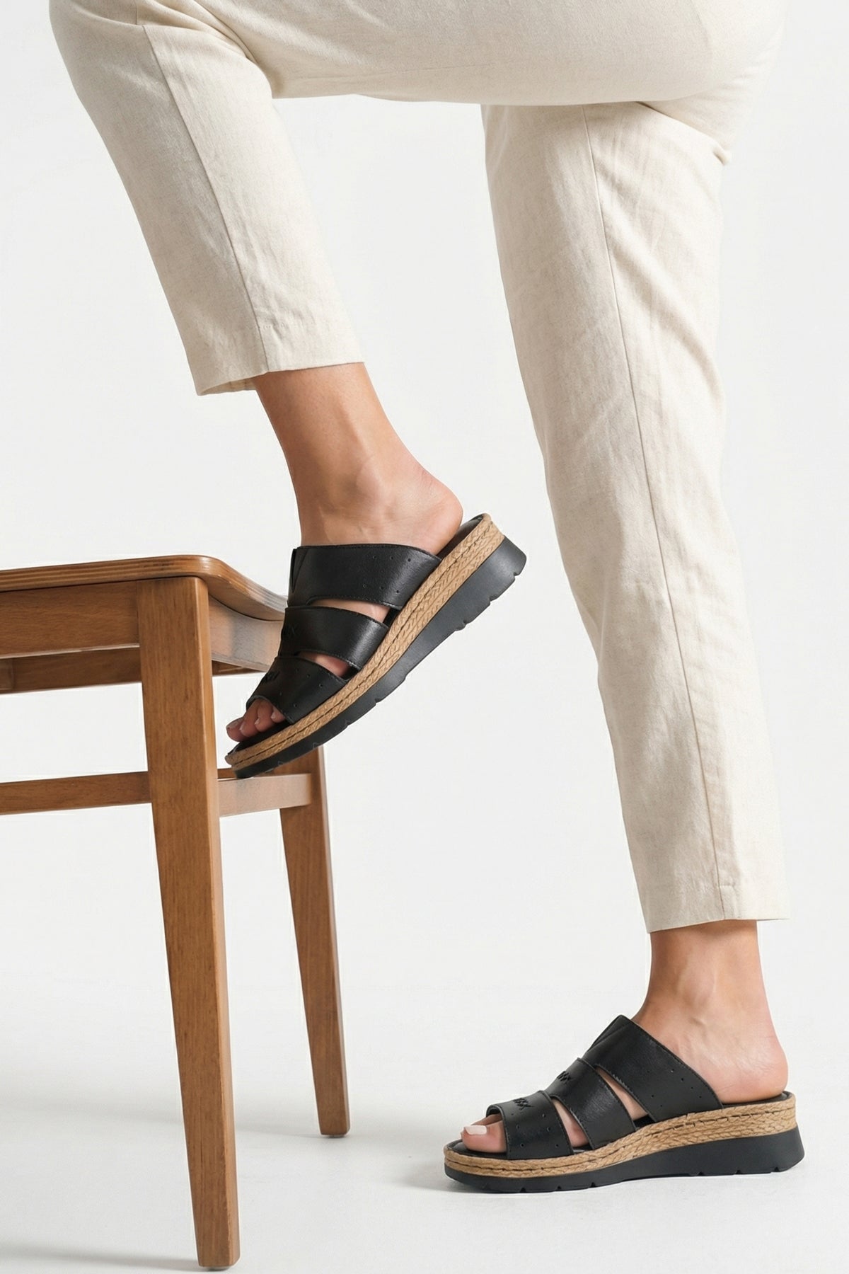 Şık çapraz bantları üzerindeki estetik dikiş detayları ve doğal görünümlü ara tabanı ile günlük kullanıma uygun modern bir silüet sunar.