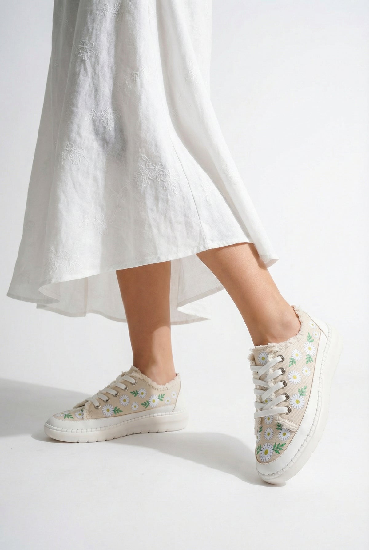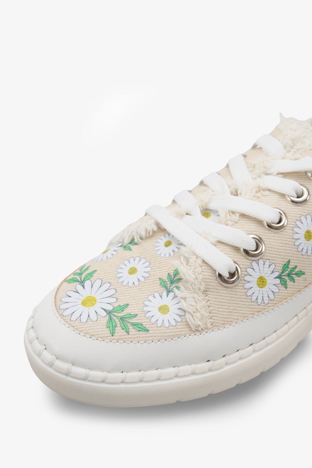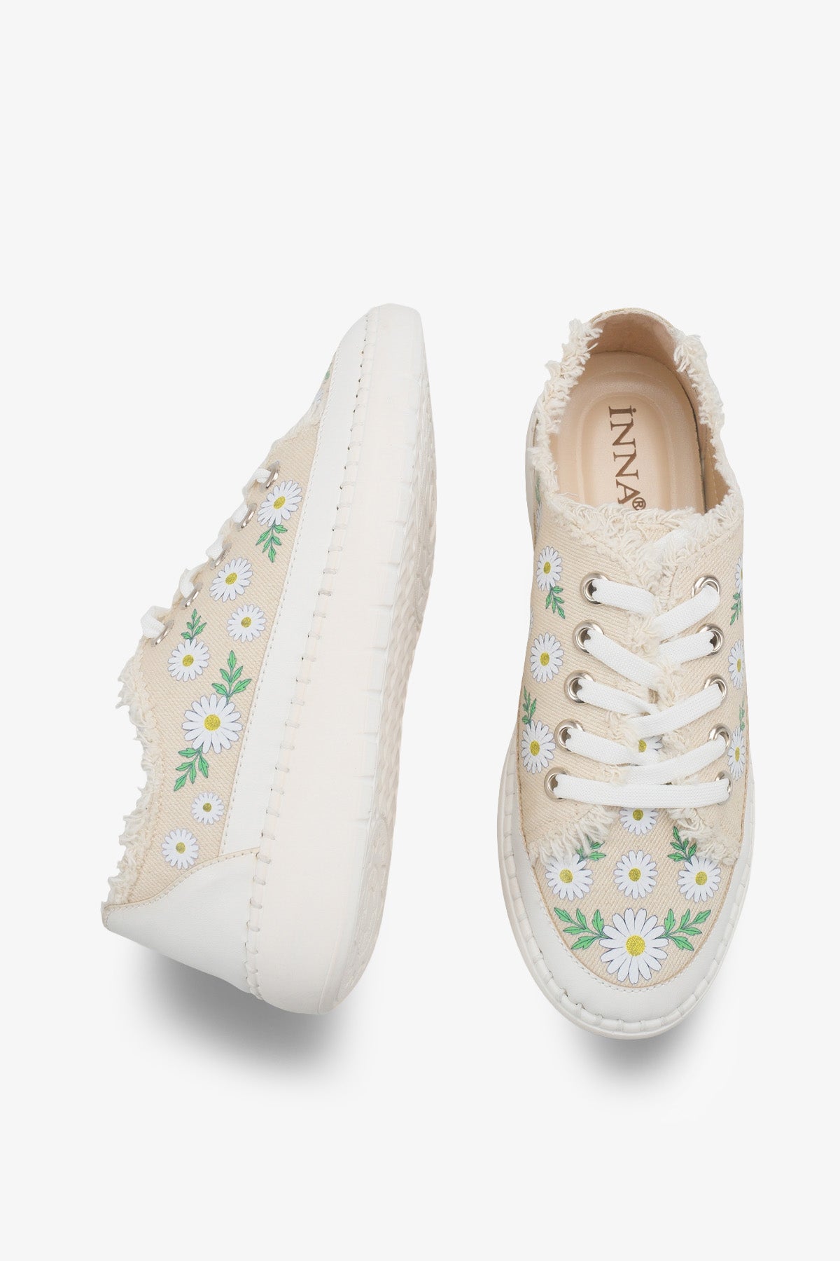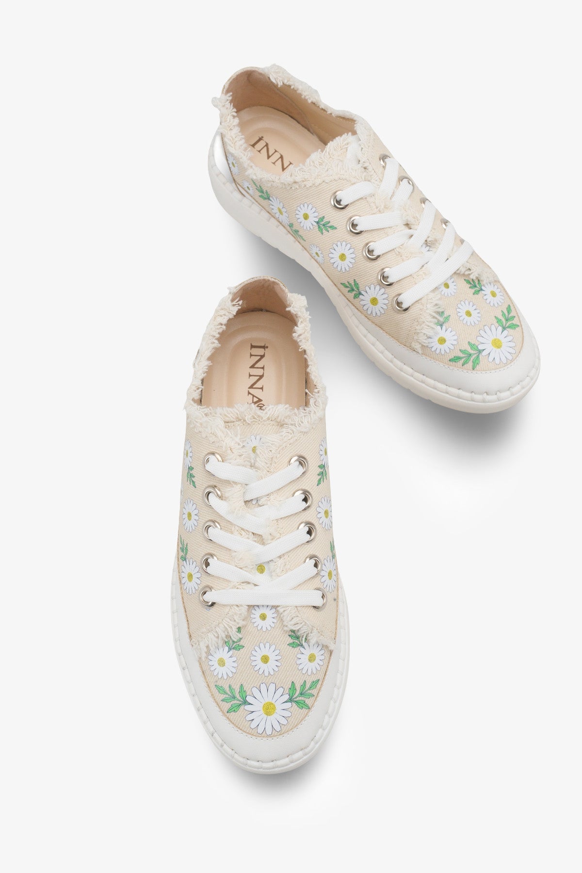 Bej zemin üzerindeki zarif papatya desenleri ve püskül detaylarıyla dikkat çeken Palitya kadın sneaker, kombinlerinize bahar enerjisi getirir.