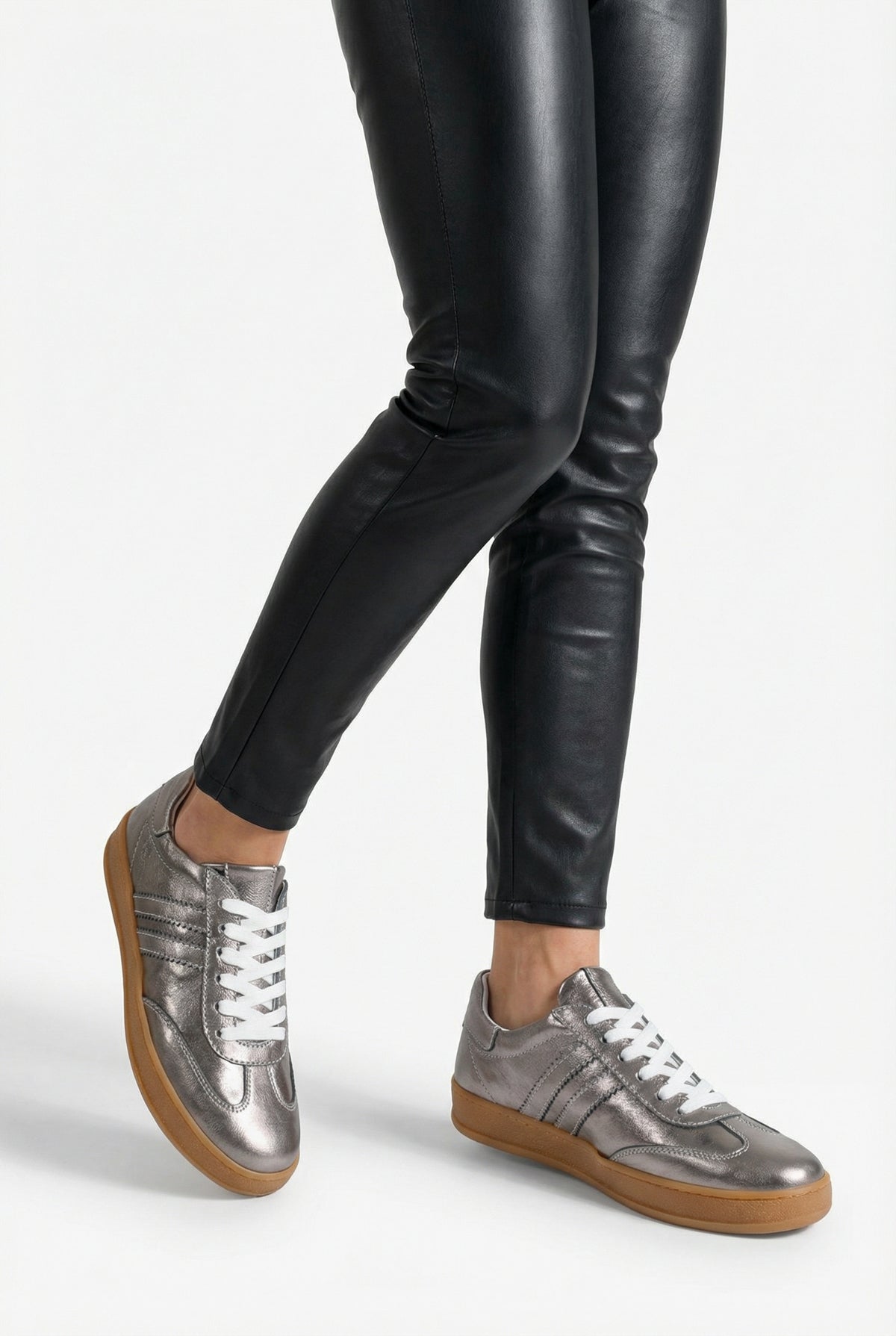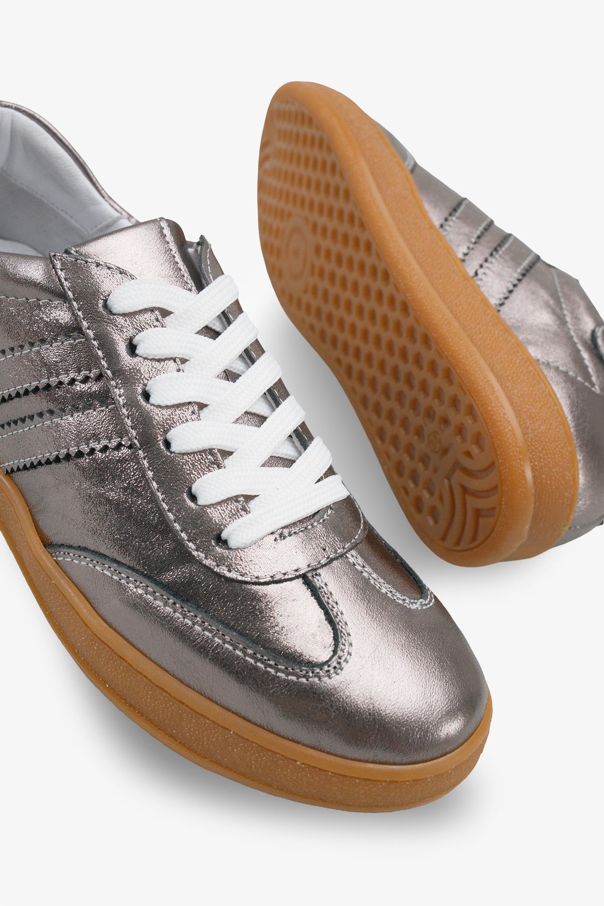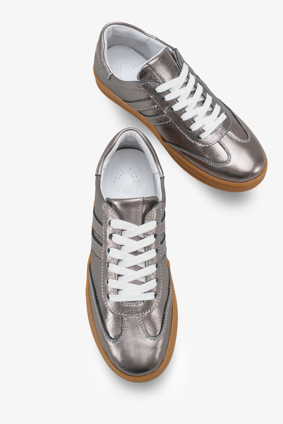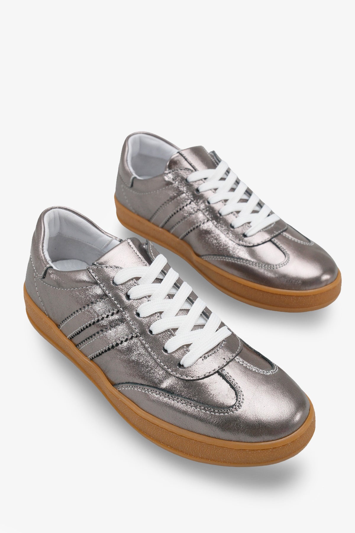 Metalik antrasit rengi hakiki deri yüzeyi ve yan kısımlardaki sportif şerit detaylarıyla tasarlanan Paolsa kadın sneaker, retro stili modern bir parlaklıkla buluşturur.