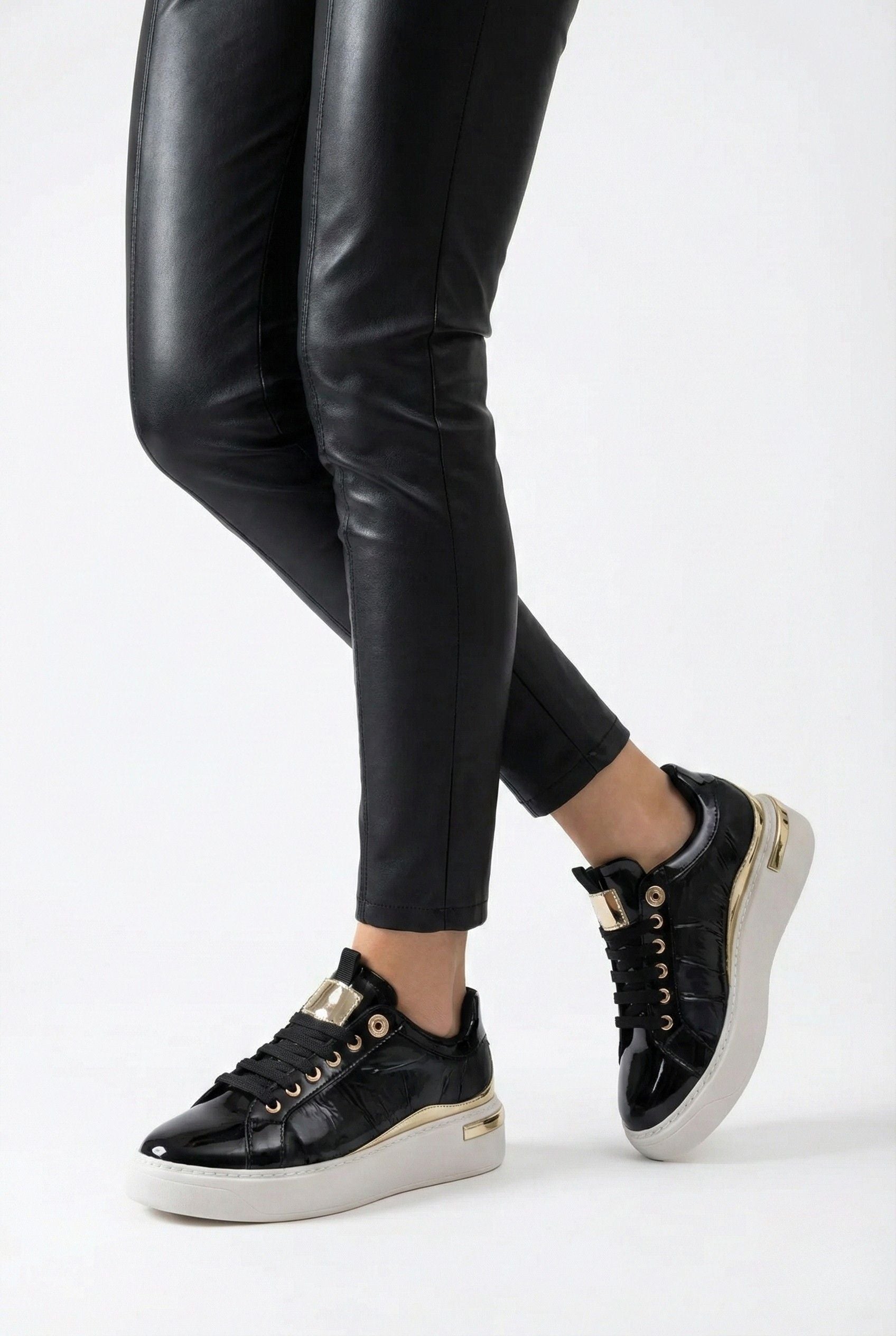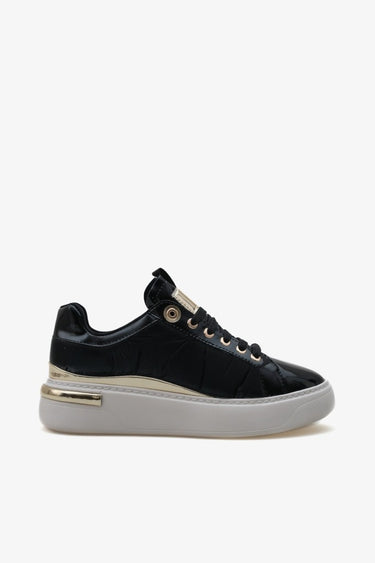 Semona Kadın Sneaker - Siyah Nero, parlak suni deri ve kapitone efektli tekstil yüzeyin uyumunu altın sarısı detaylarla zenginleştirerek göz alıcı bir şıklık sunar.