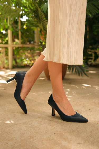 Kaliteli suni deri materyalden üretilen Sindirel lacivert topuklu ayakkabı, deri dokusu ve zamansız tasarımıyla her mevsim şıklığınızı tamamlar.