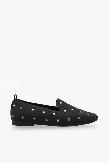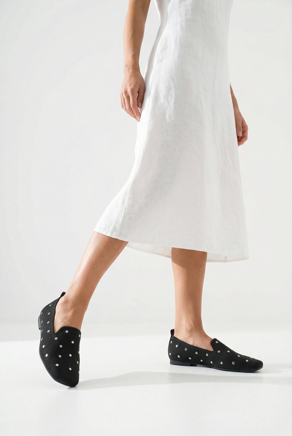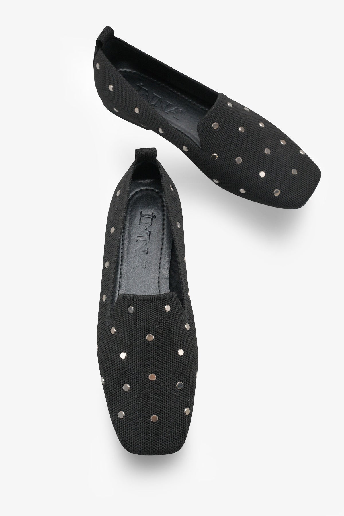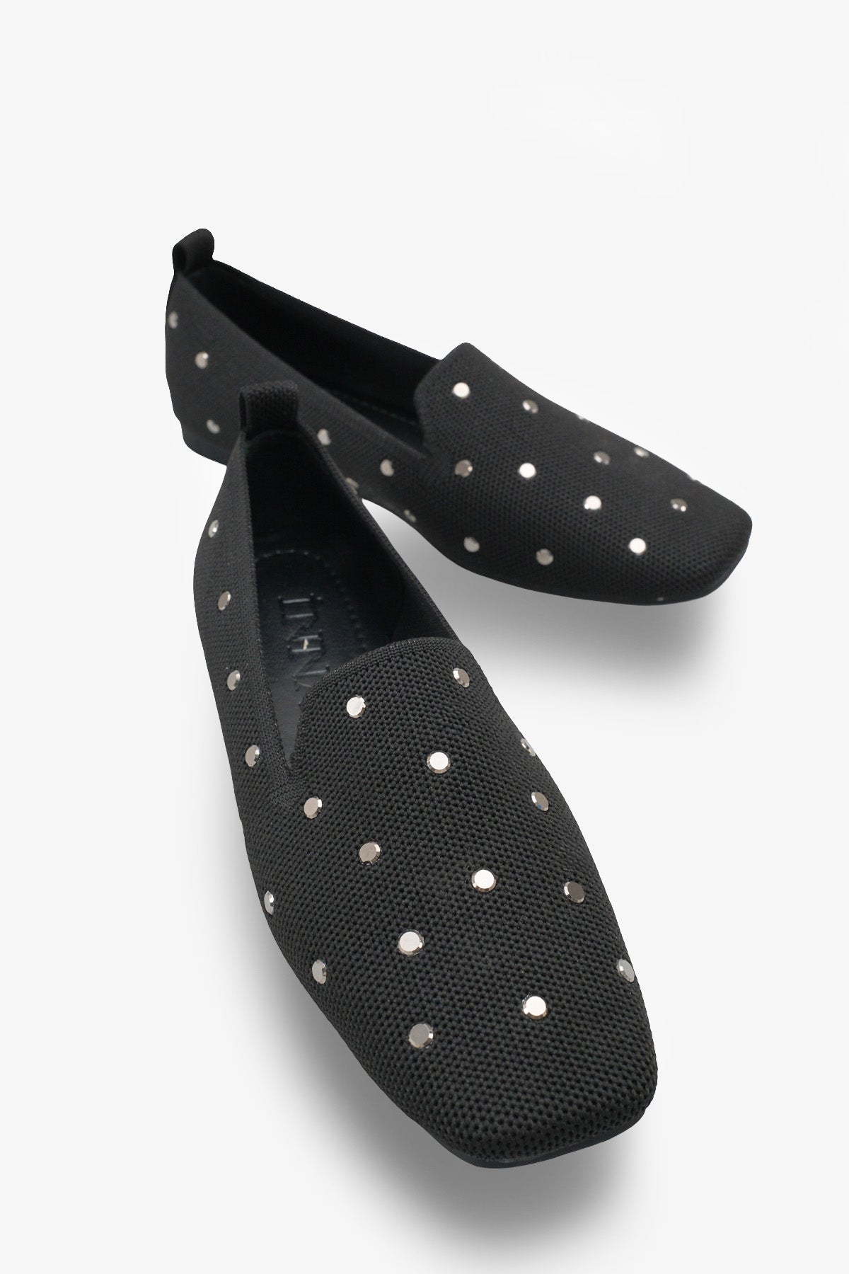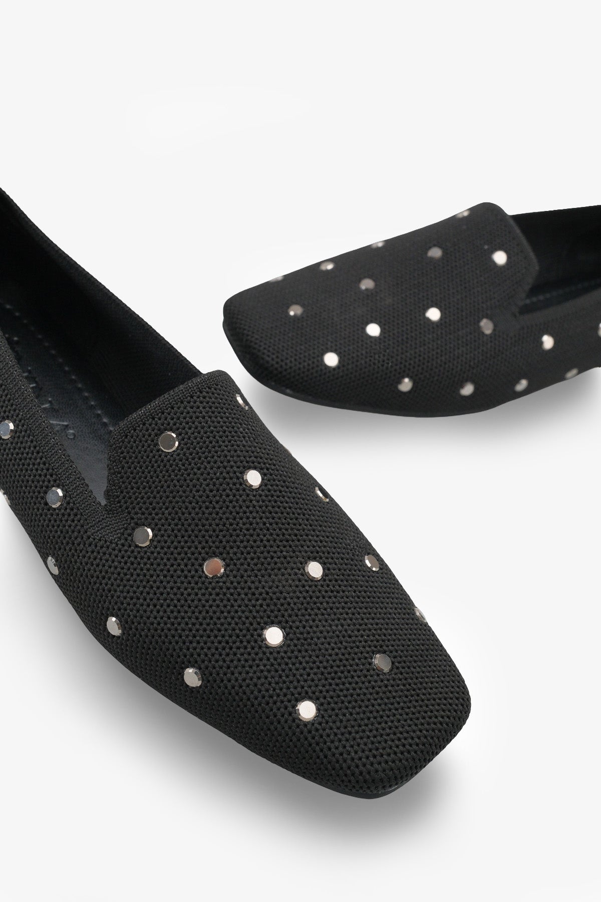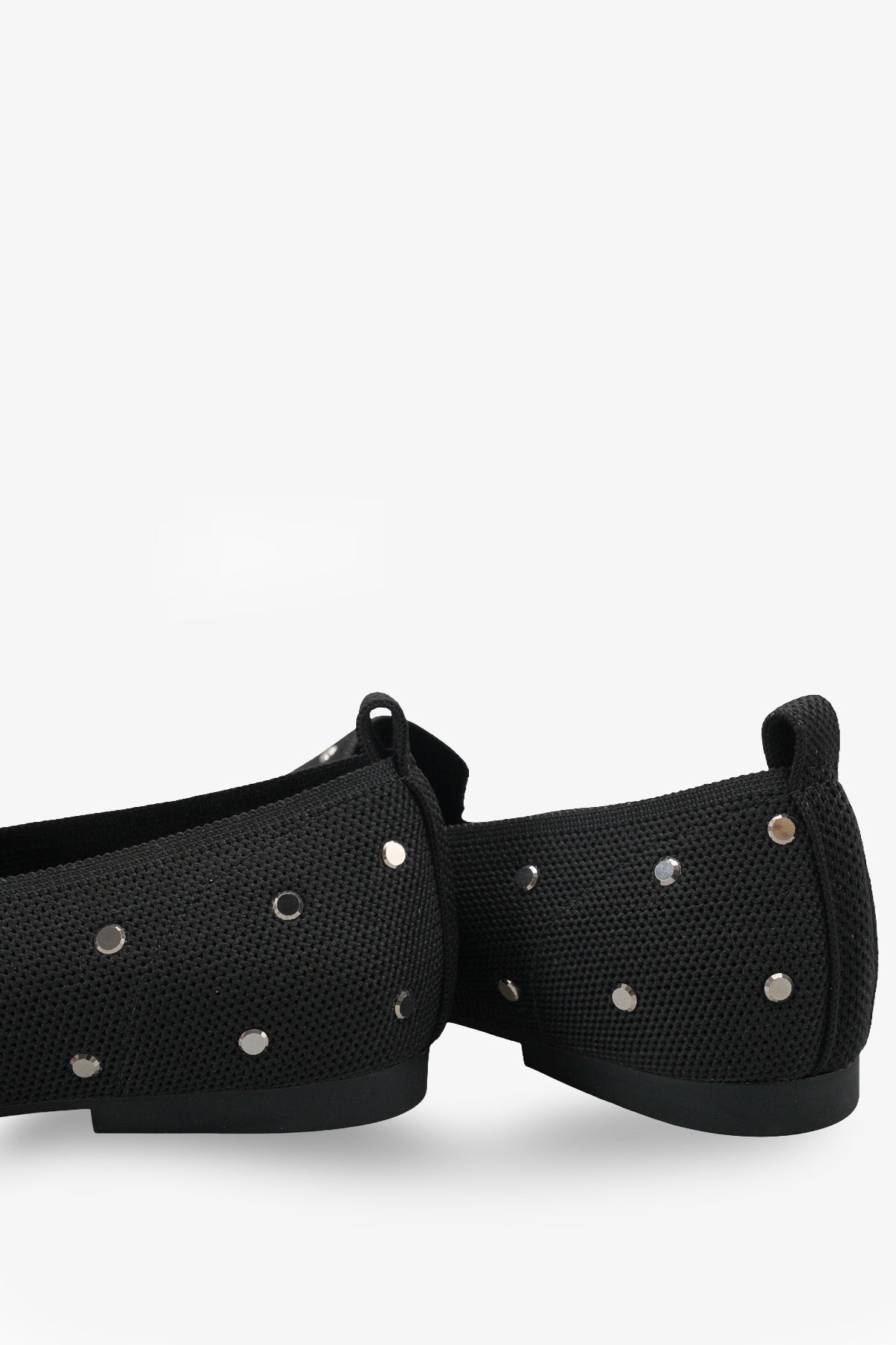Modern kare burun tasarımı ve üzerindeki gümüş renkli zımba detaylarıyla öne çıkan bu siyah triko babet, stilinize ışıltılı bir dokunuş katar.