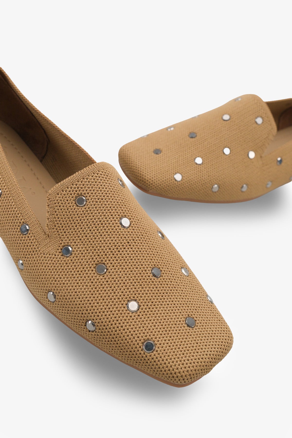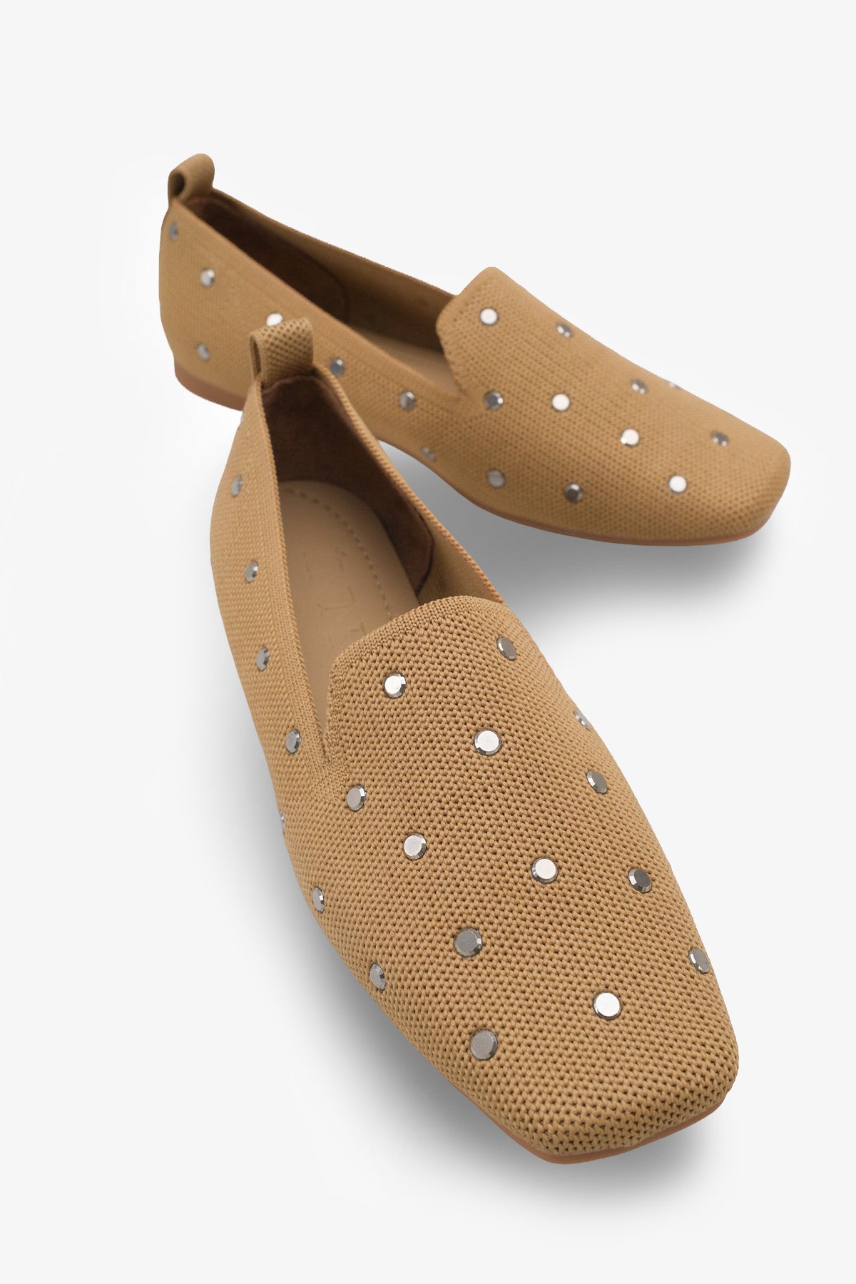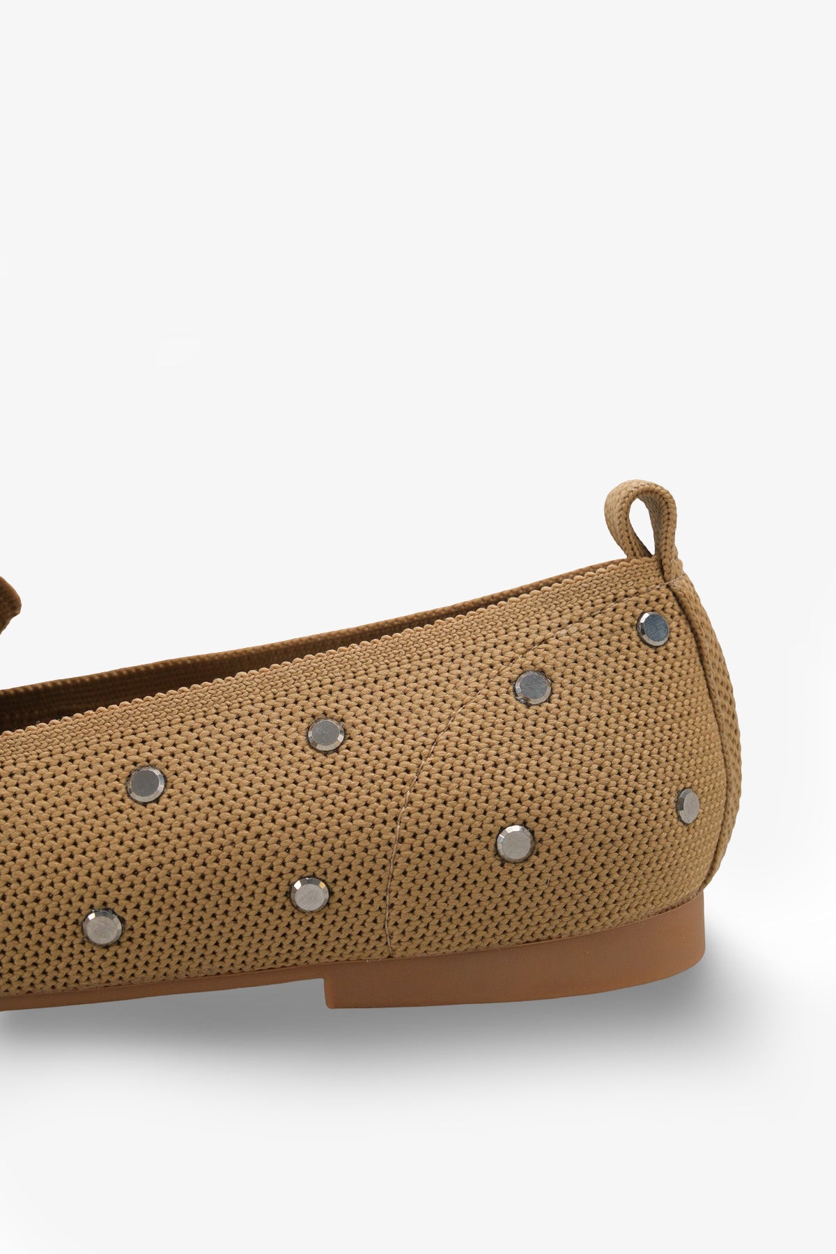 Modern kare burun tasarımı ve üzerindeki gümüş renkli zımba detaylarıyla öne çıkan bu taba triko babet, stilinize ışıltılı bir dokunuş katar.