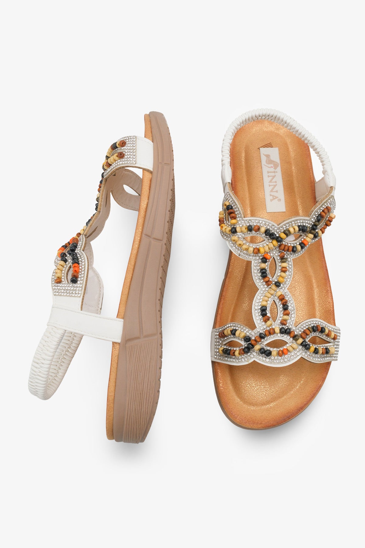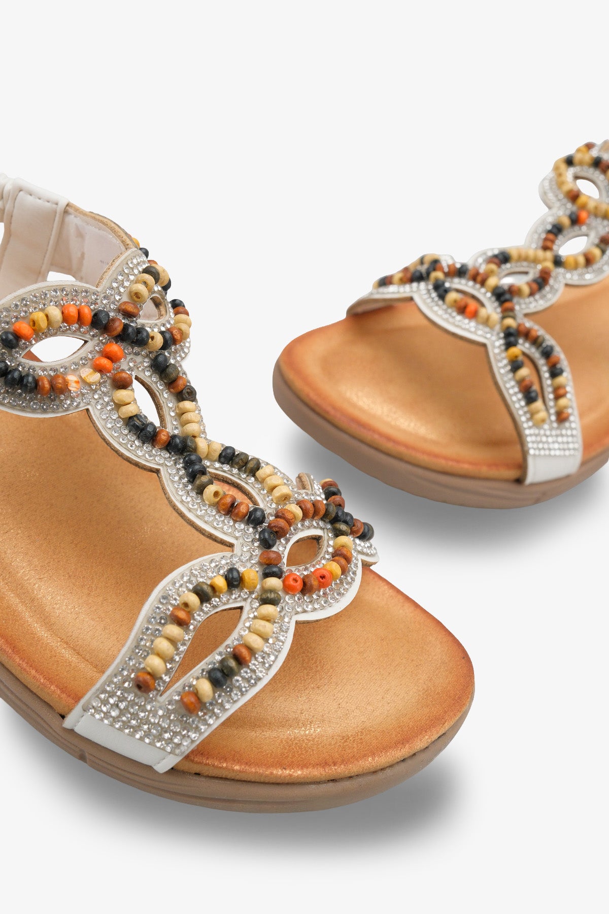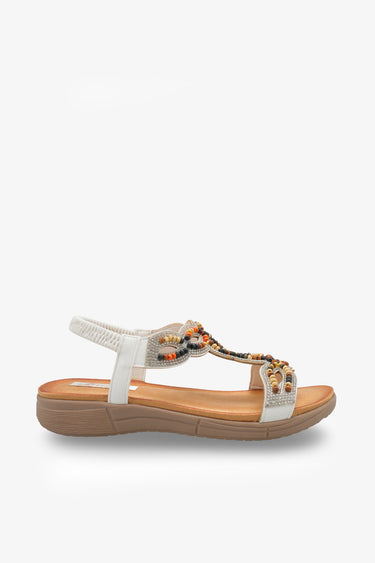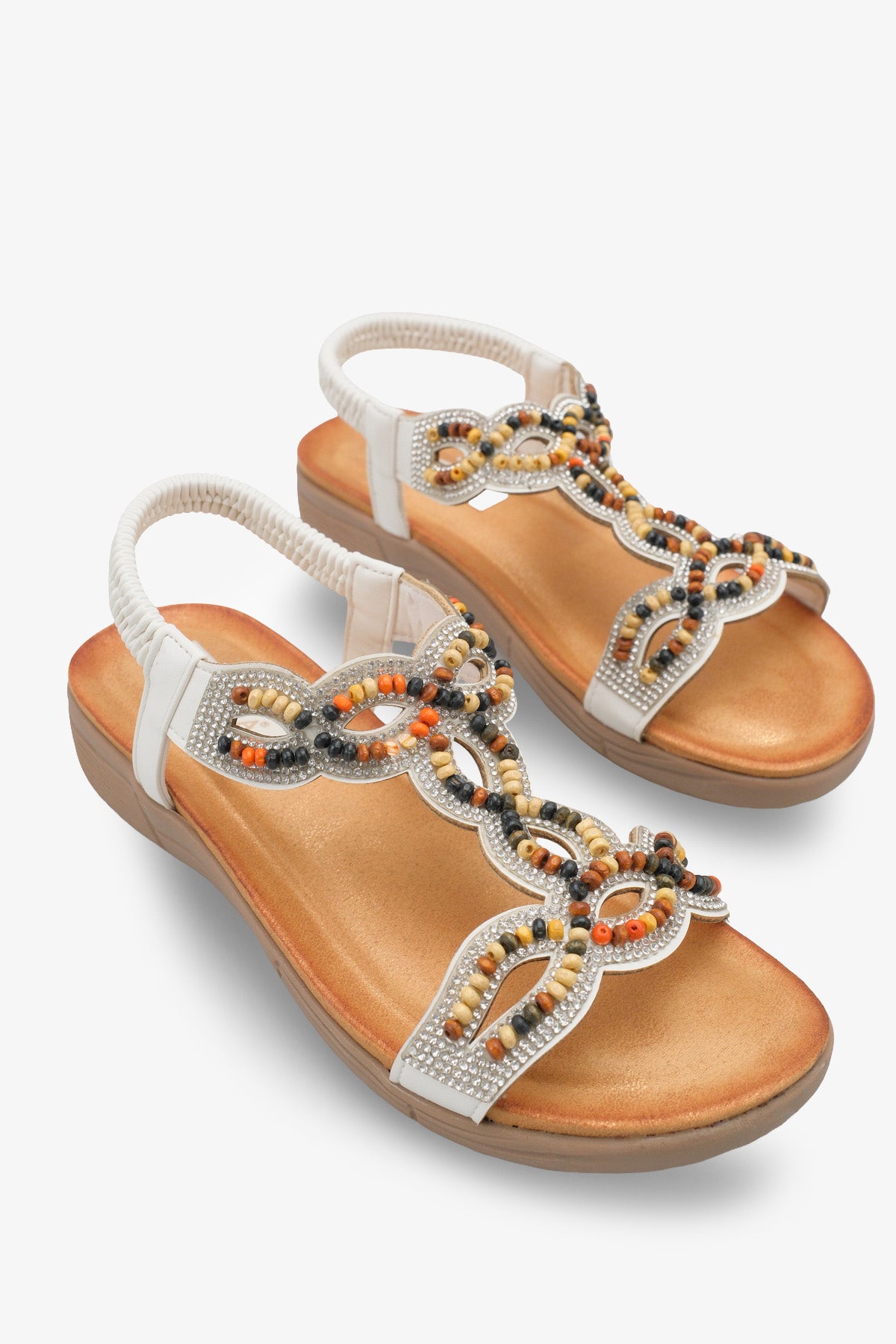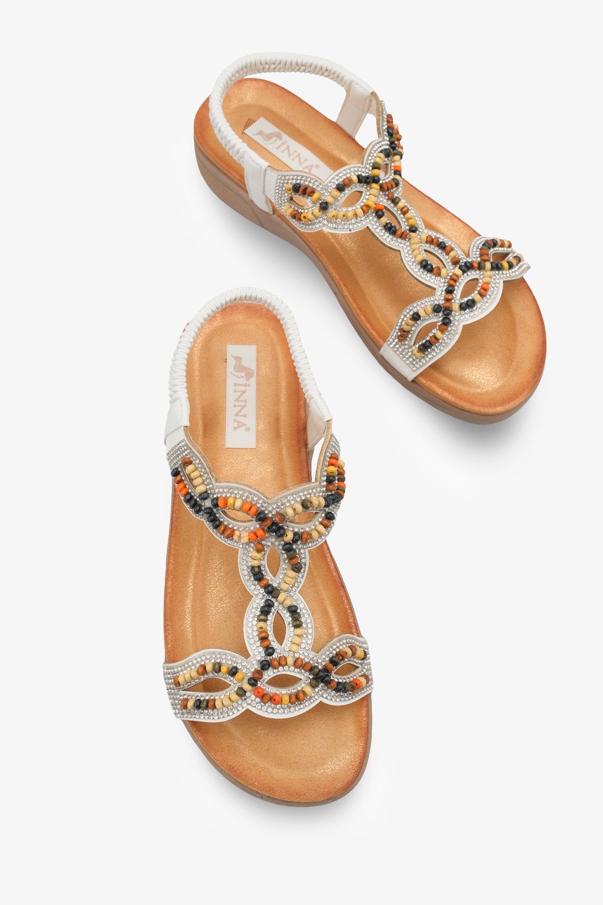 Zarif taşlar ve renkli boncuk işlemeleriyle hareketlendirilen bu beyaz sandalet, yaz stilinize bohem ve şık bir dokunuş katar.